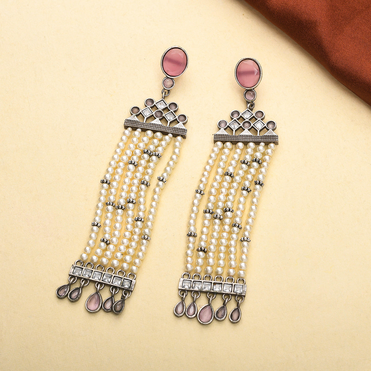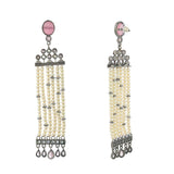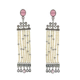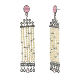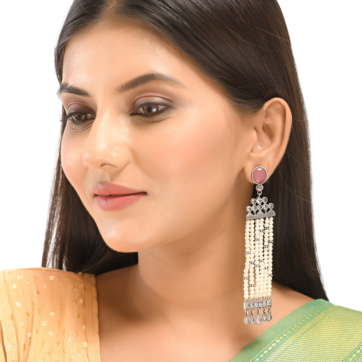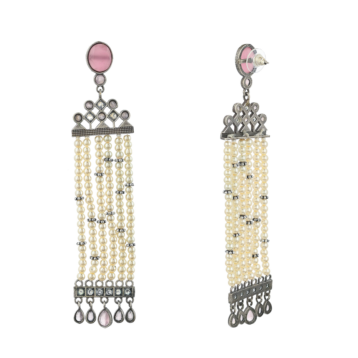 Antique Elegance Faux Pearls and Stones Embellished Oxidised Silver Plated Brass Long Drop Earrings