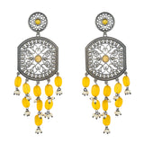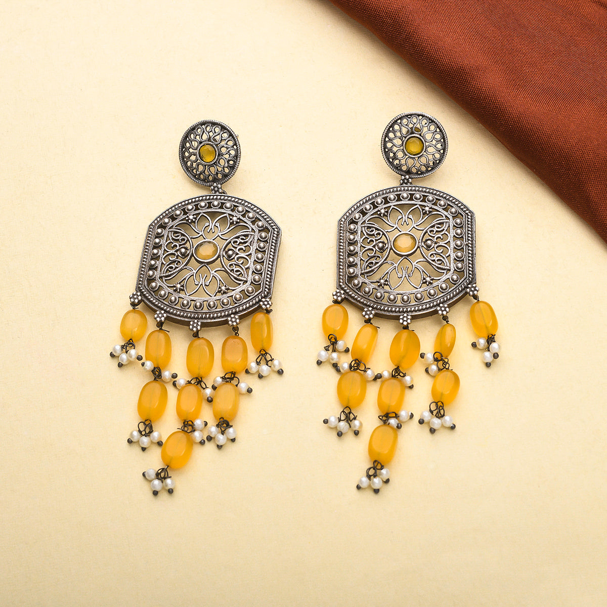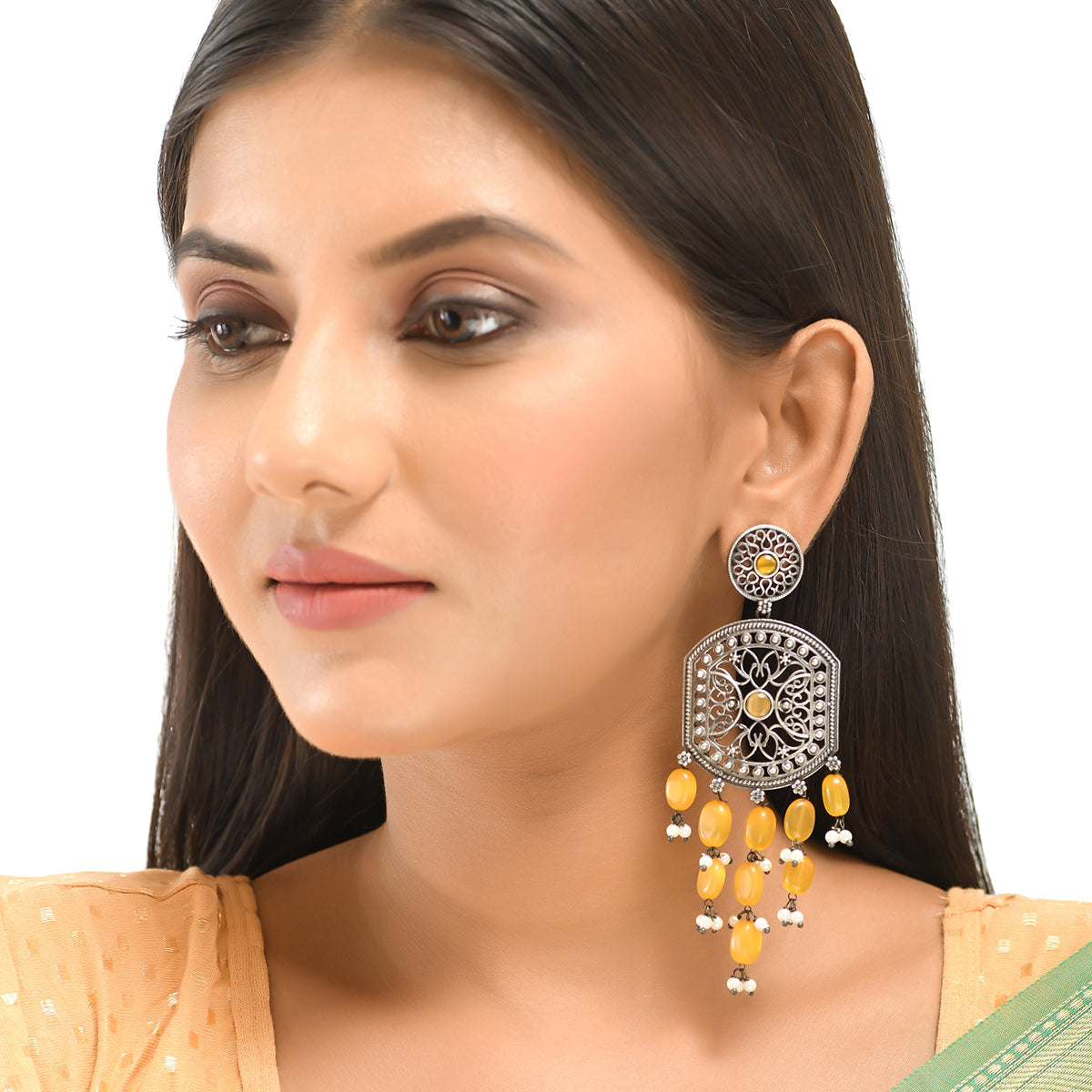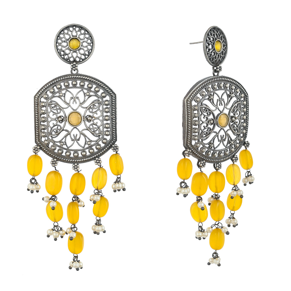 Fashioned out of brass, these drop earrings feature a delicate filigree design and faux pearl embellishments. Yellow stone adornments add to the charm of this silver plated pair, which promises to be a comfortable wear at all times. Pair with a traditional saree.