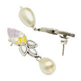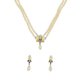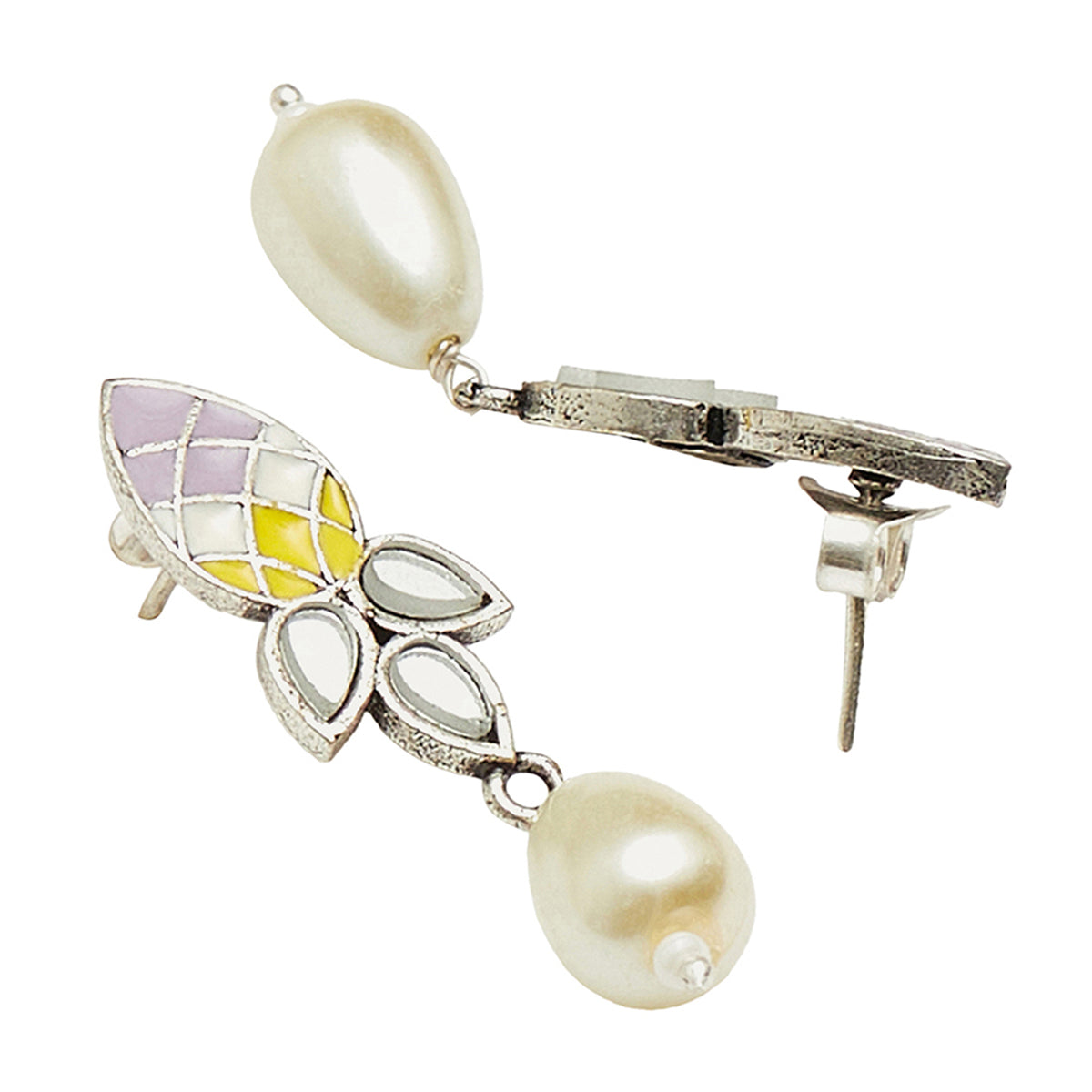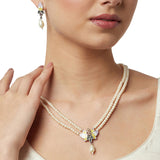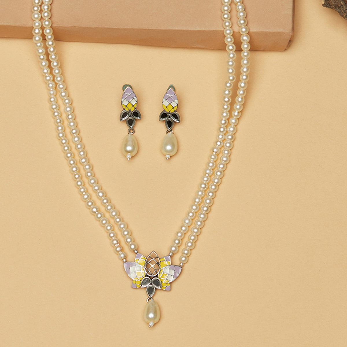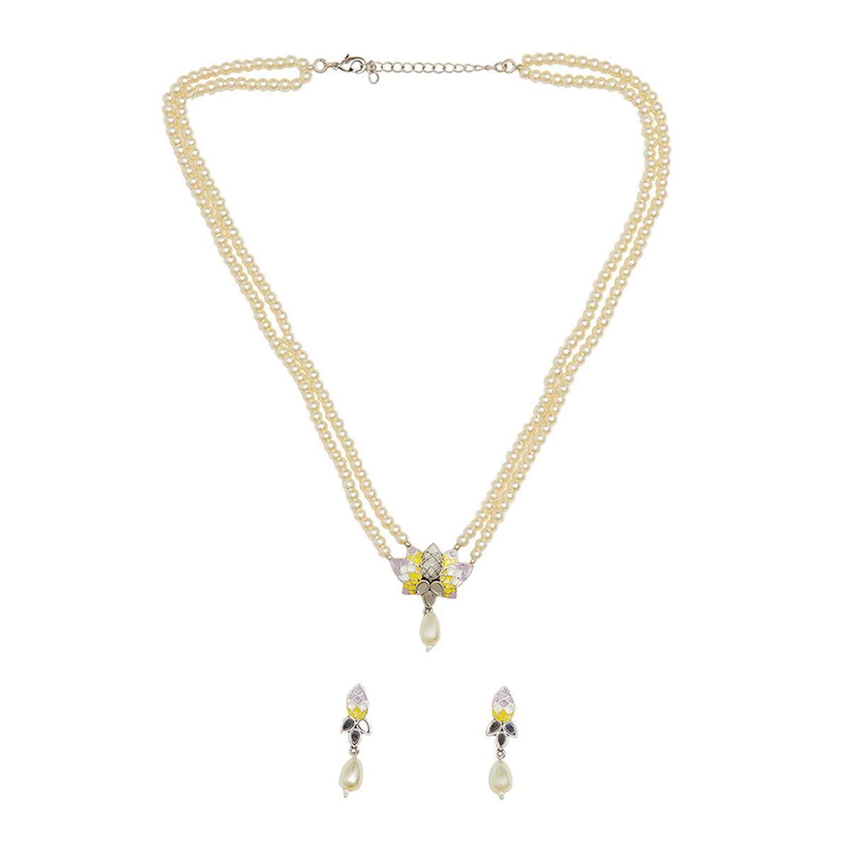 Enamelled brass jewellery set featuring a delicate filigree design and floral inspired motifs. Silver plating adds to the charm of the necklace and earrings, which have been embellished with lovely white faux pearls. Pair the set with a chiffon saree or formal evening gown to add elegance to the whole look.