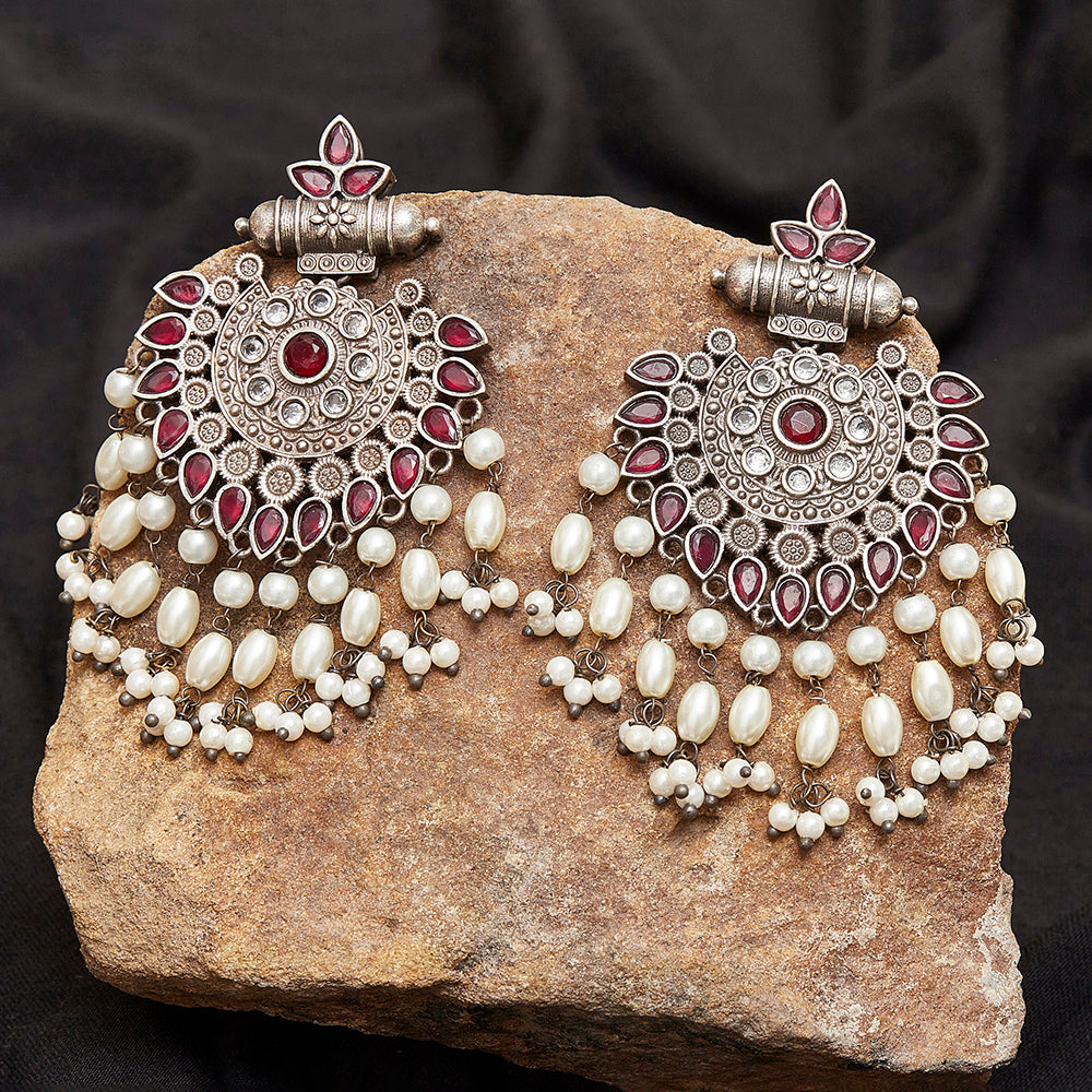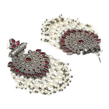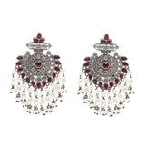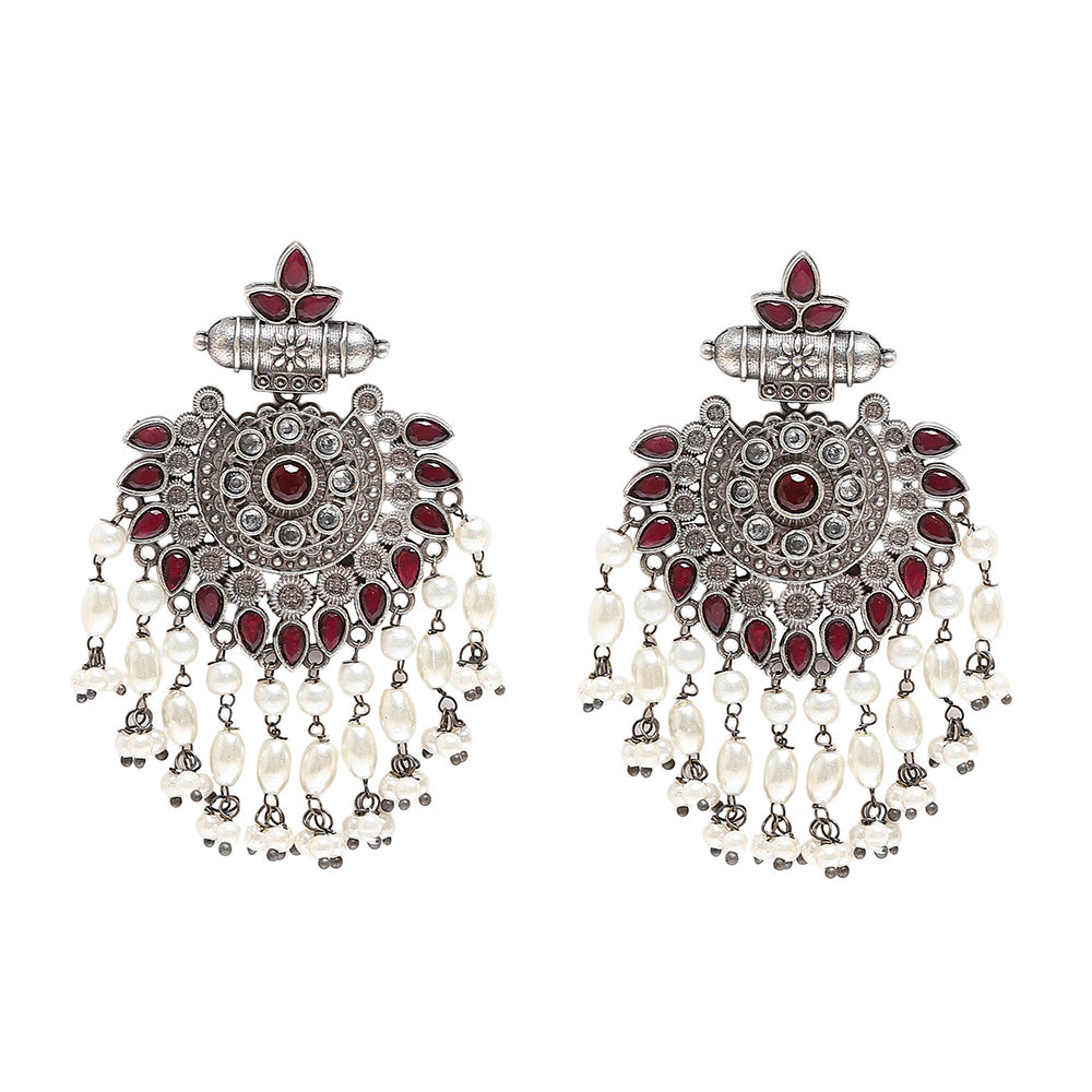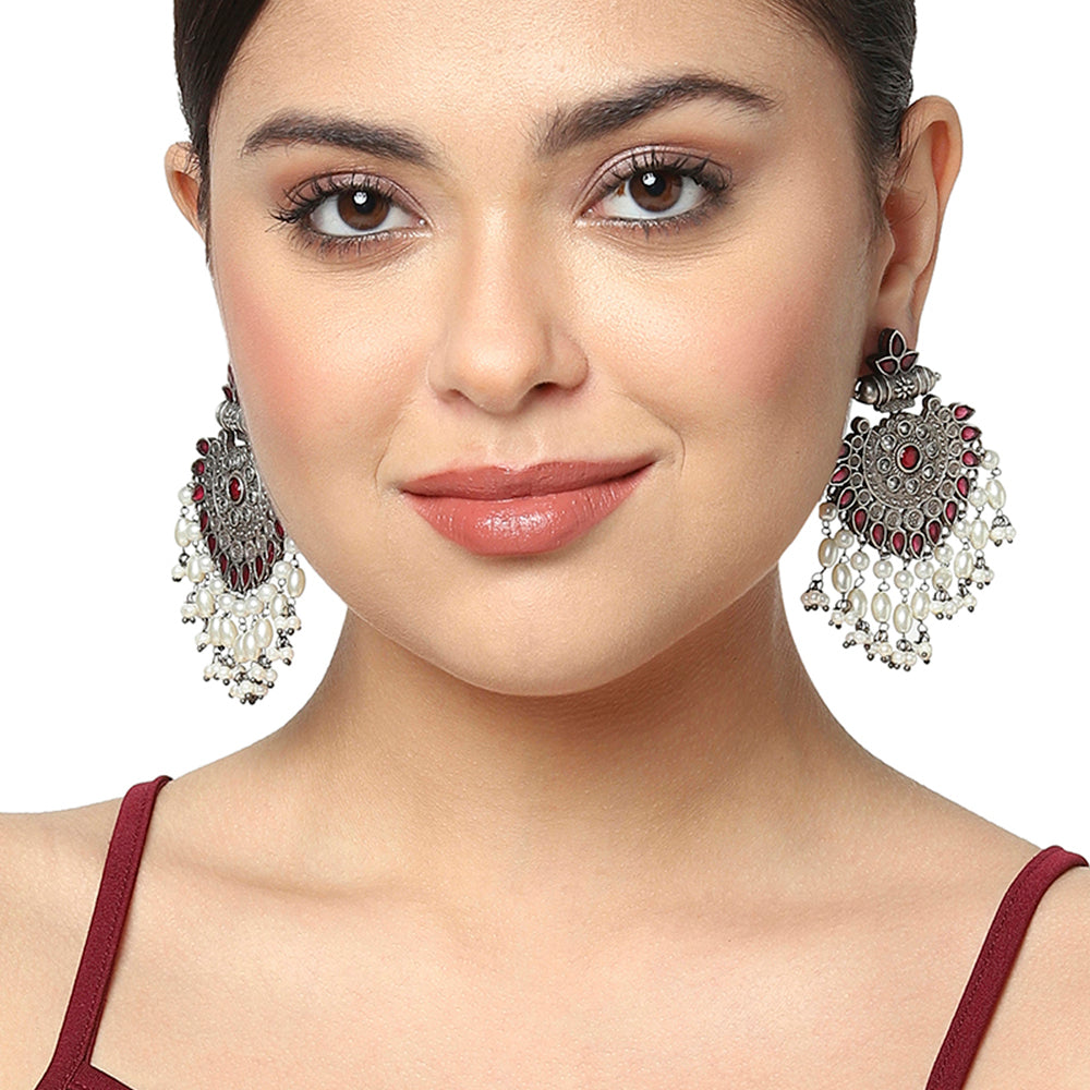 Heavily embellished with faux pearls and red stones, these drop earrings have been fashioned out of brass. Oxidised silver plating to their rustic, vintage charm. Lightweight and comfortable, the earrings will pair well with a wide variety of ethnic and Indo-Western outfits.