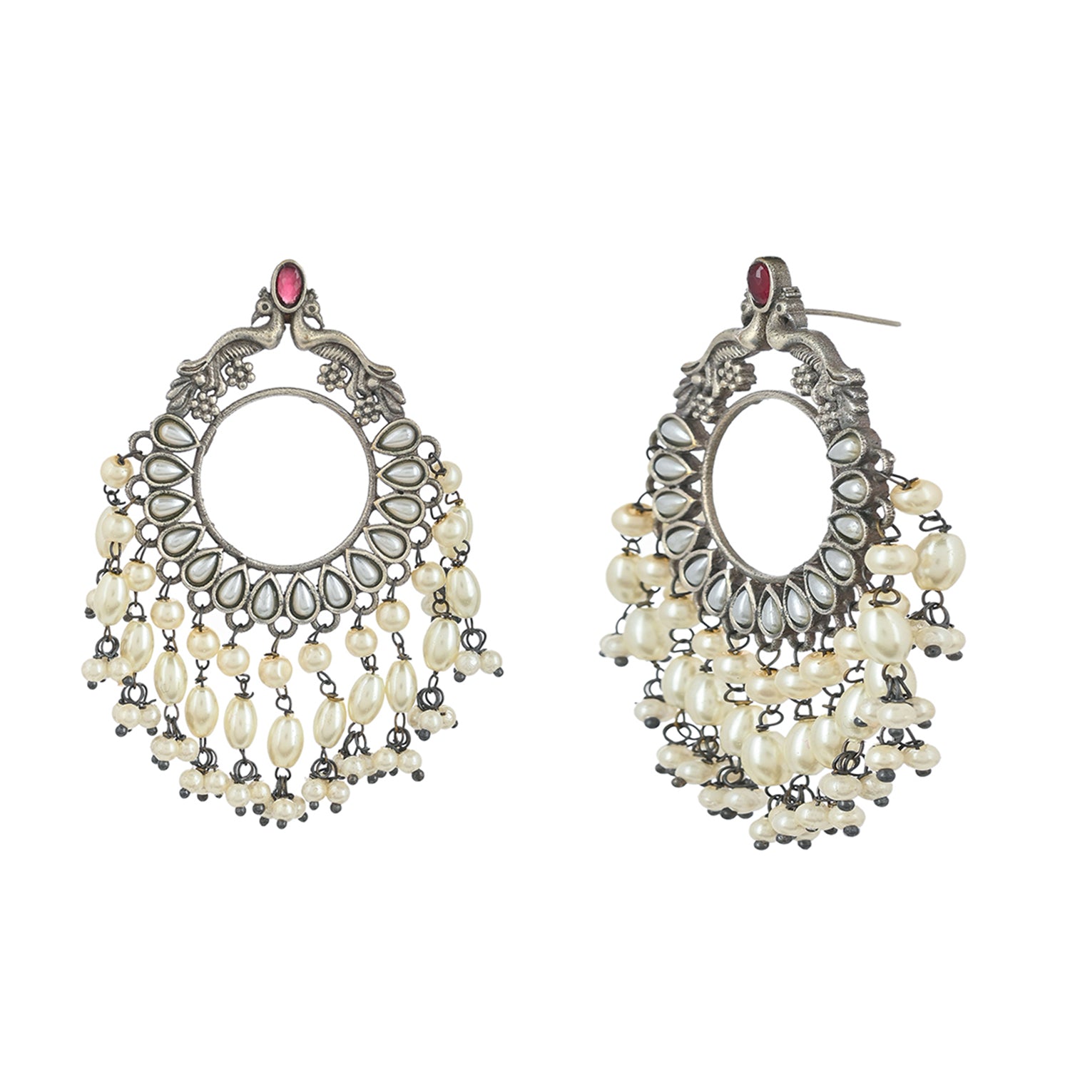 Ethnic antique style earrings, made from brass and featuring delicate peacock motifs. Embellished with white faux pearls and oxidised silver plated, the earrings are a good match for ethnic looks of all kinds.