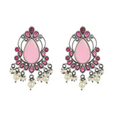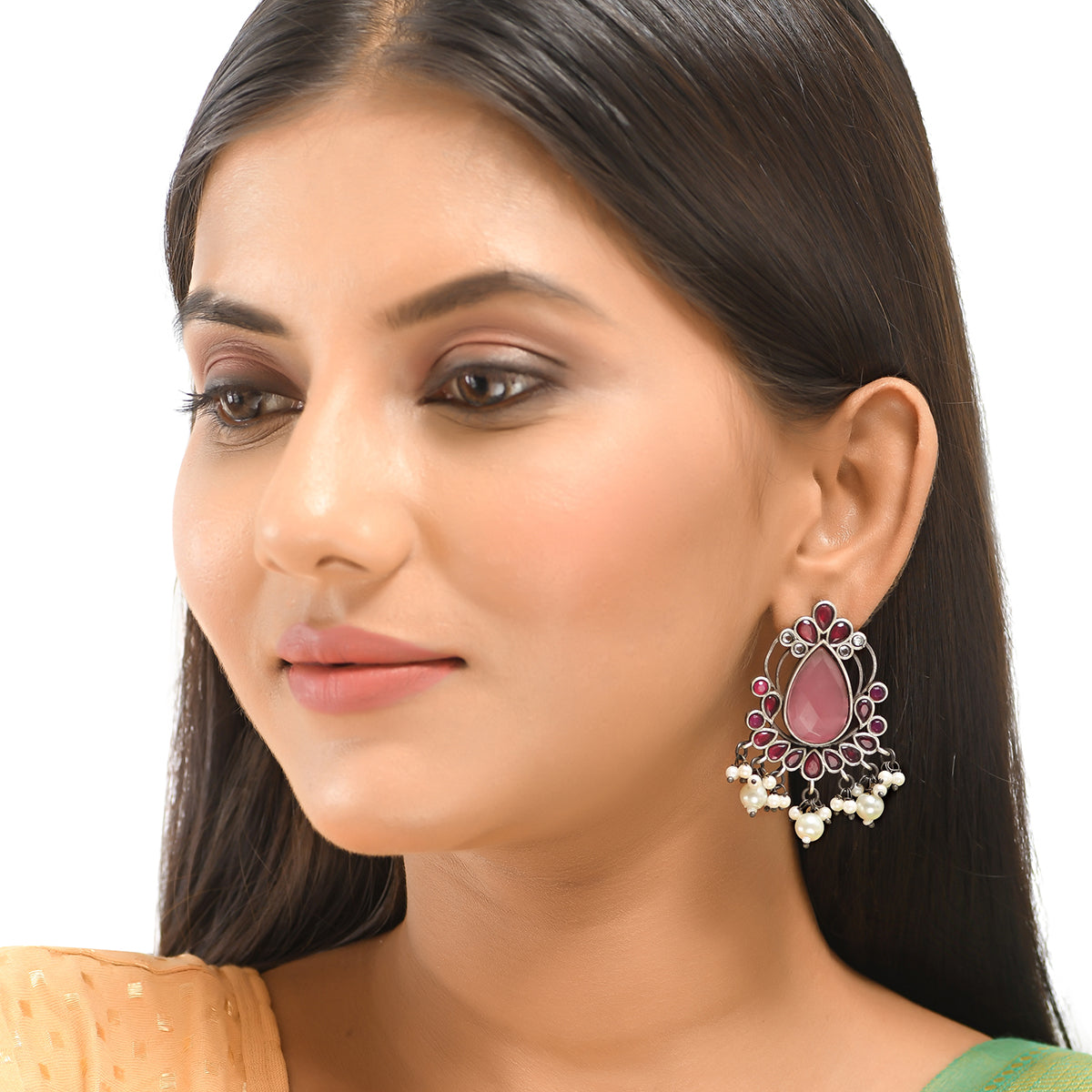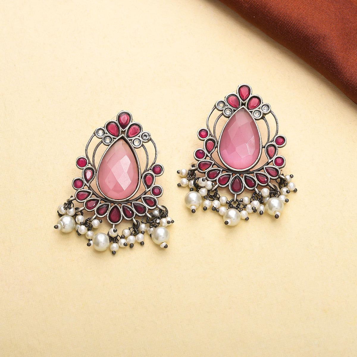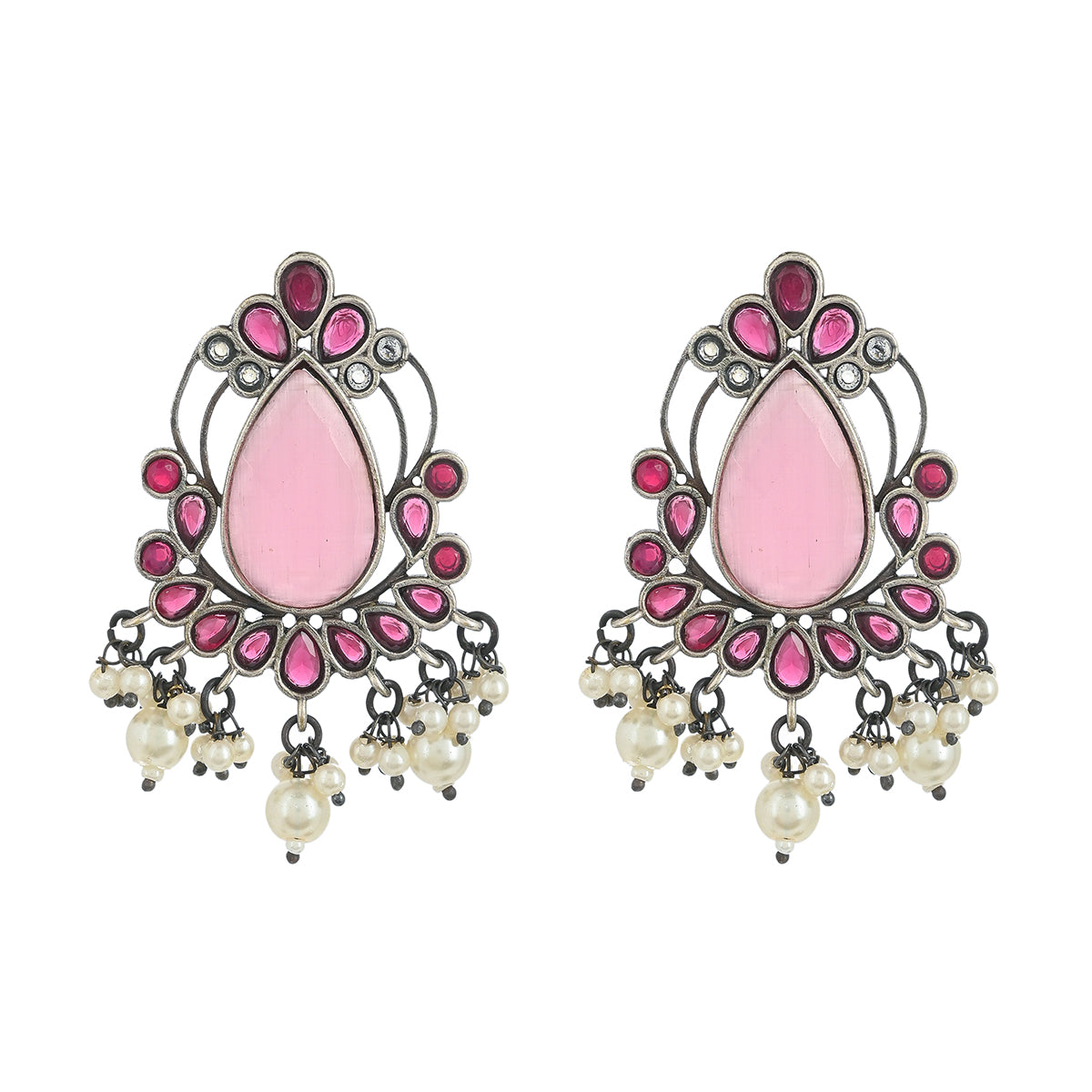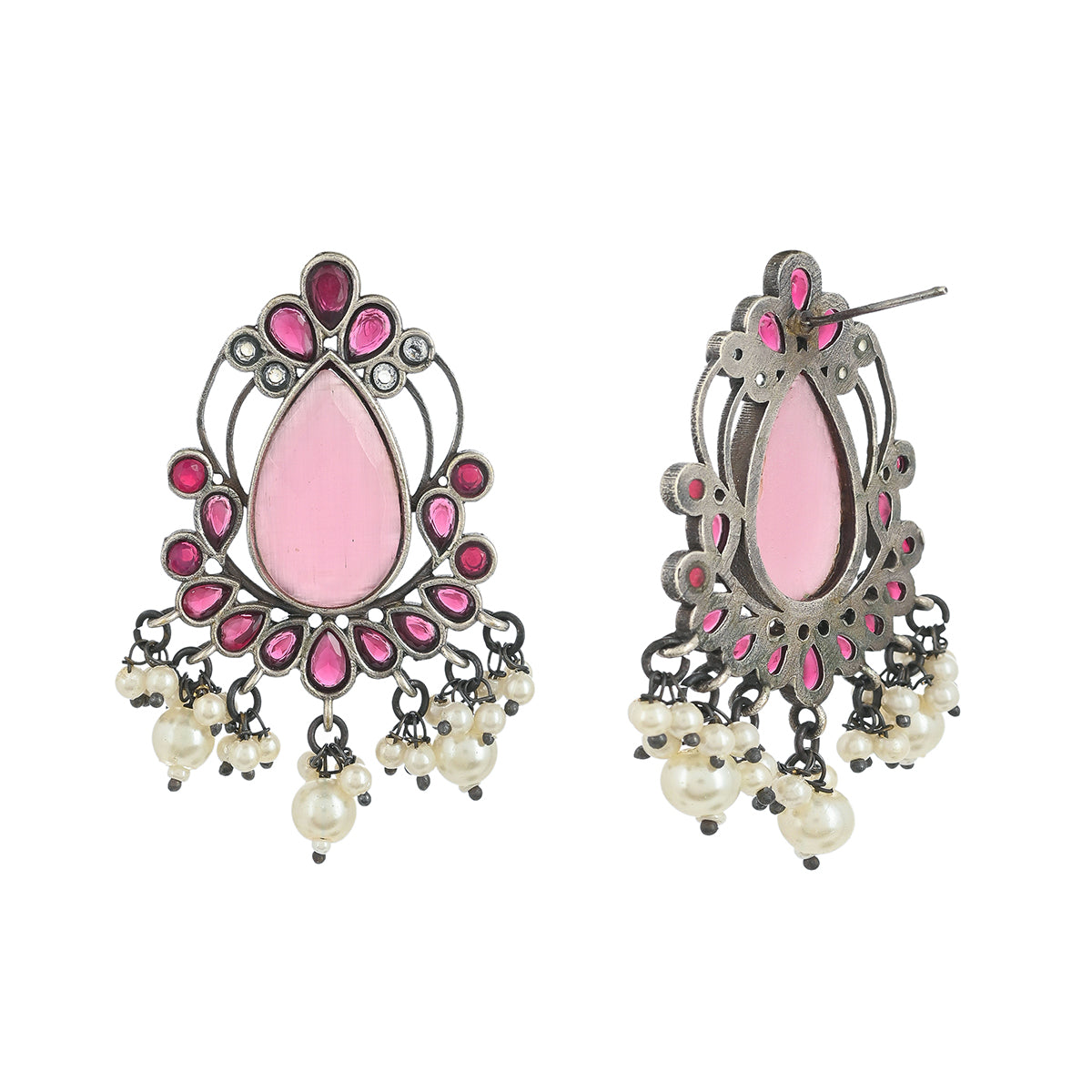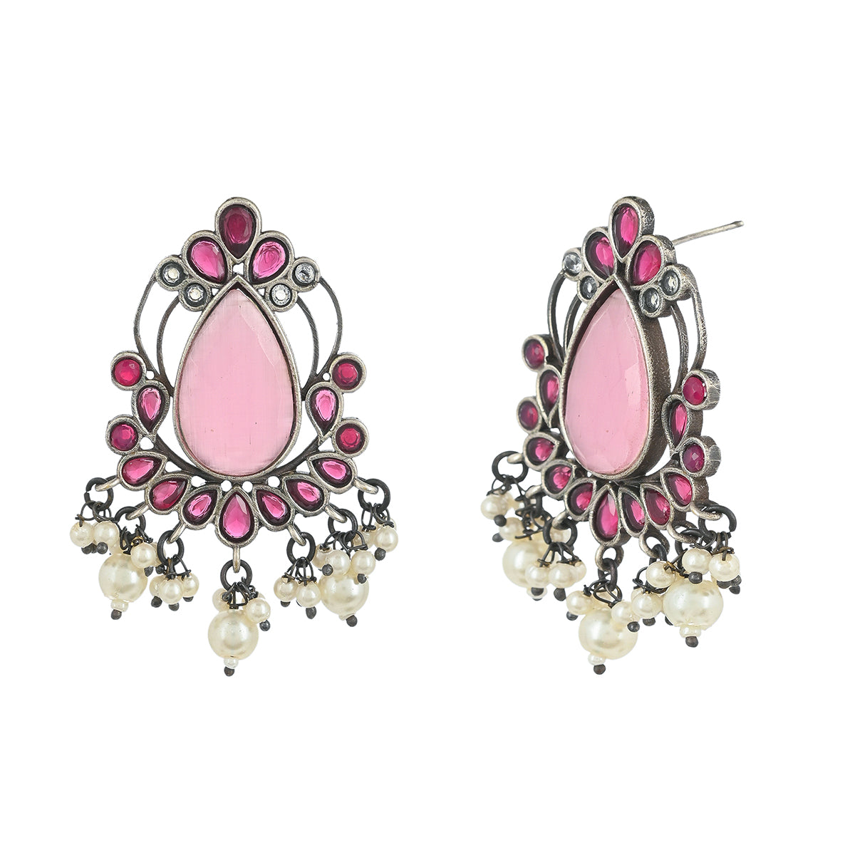 Ethnic antique inspired brass earrings with a classic oxidised silver plating. Embellished with pink kundan gems in a teardrop cut and faux pearls, the earrings are a good match for Indian looks of all kinds.