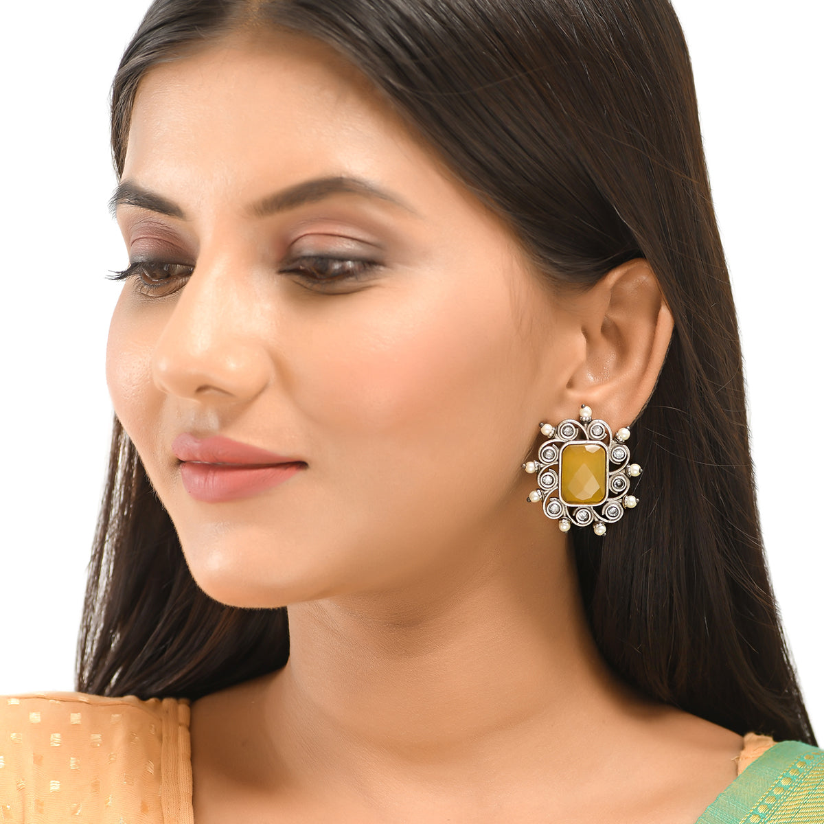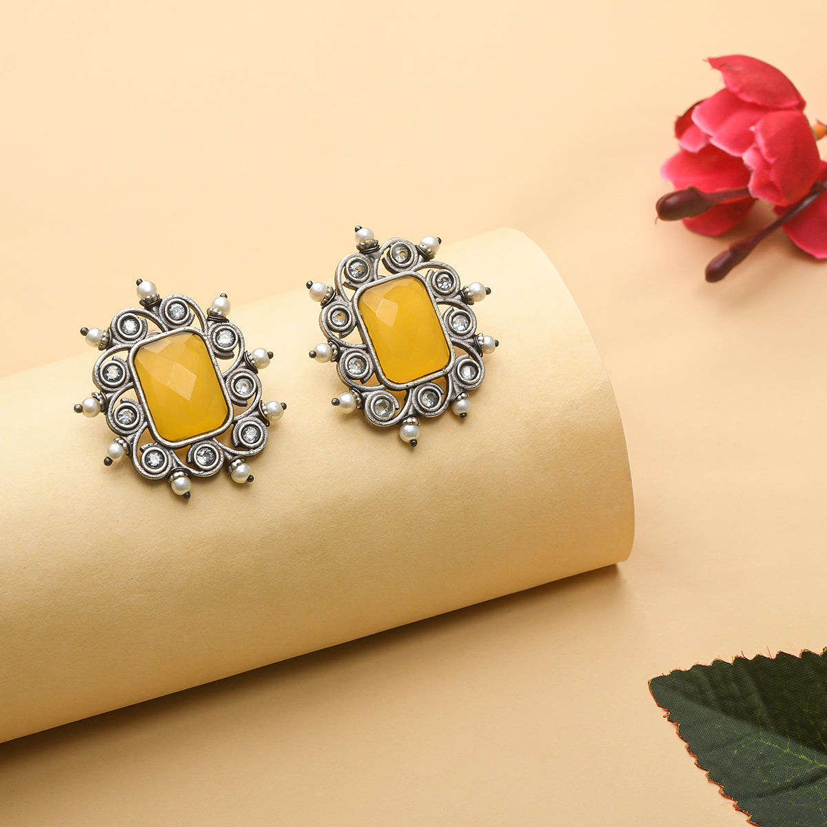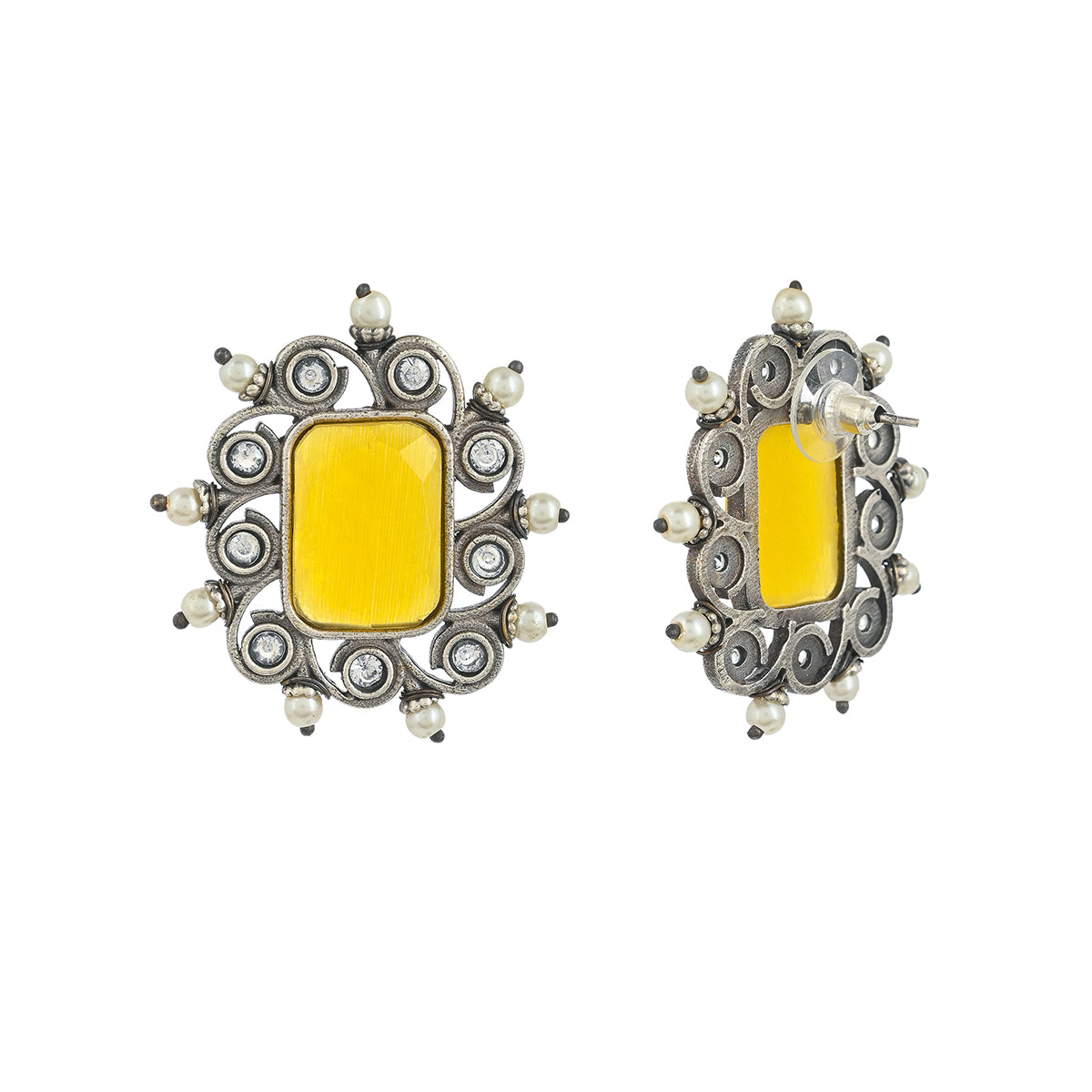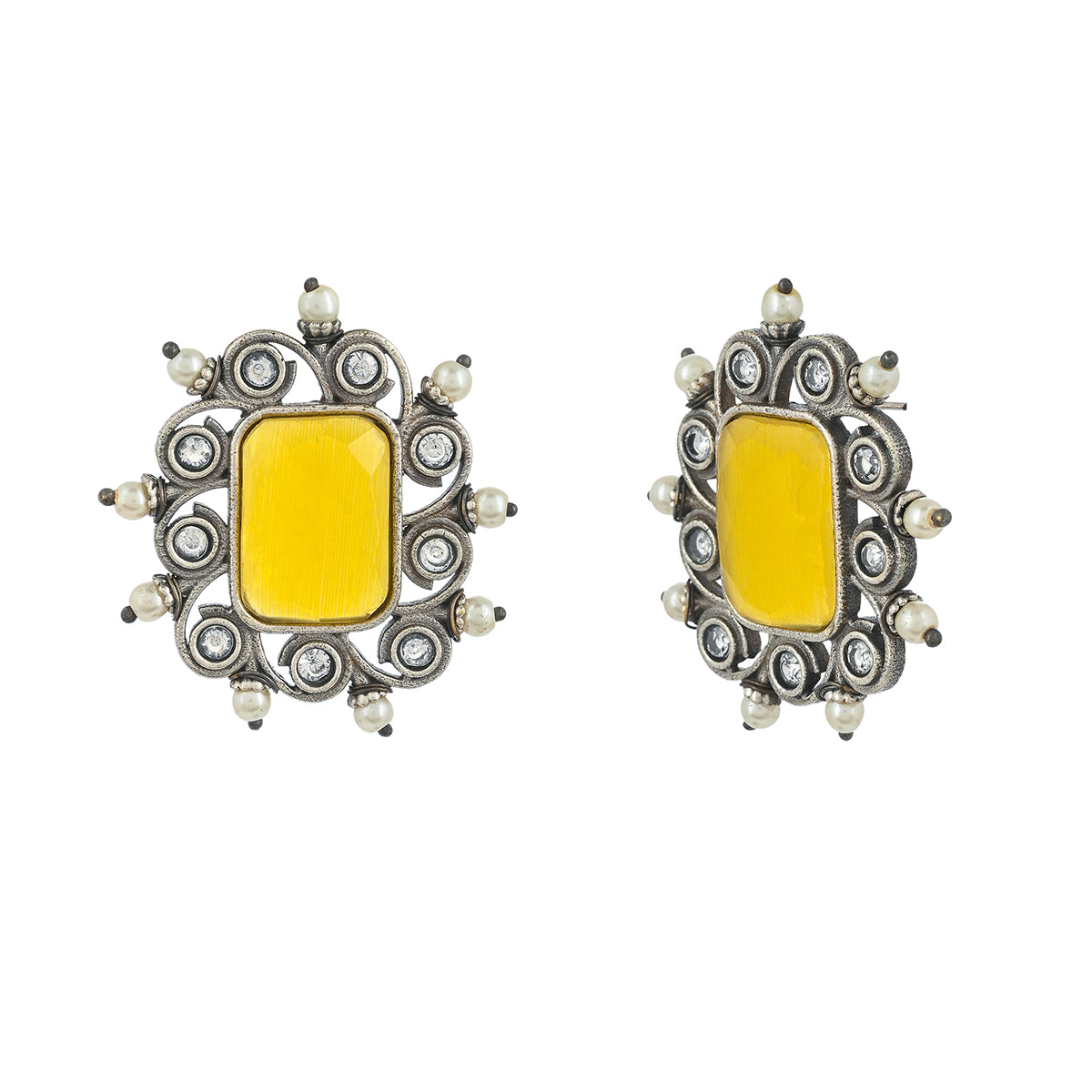 Faux pearls and square cut faux kundan gem adorned brass earrings. Oxidised silver plated and featuring a delicate, antique inspired design. Pair with a designer saree.