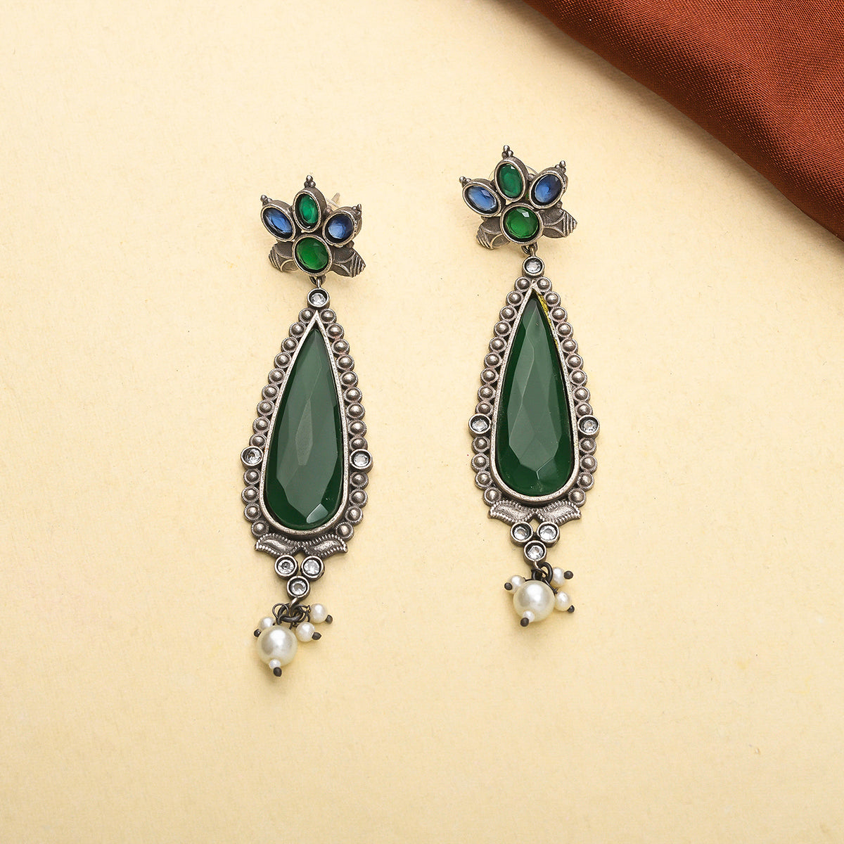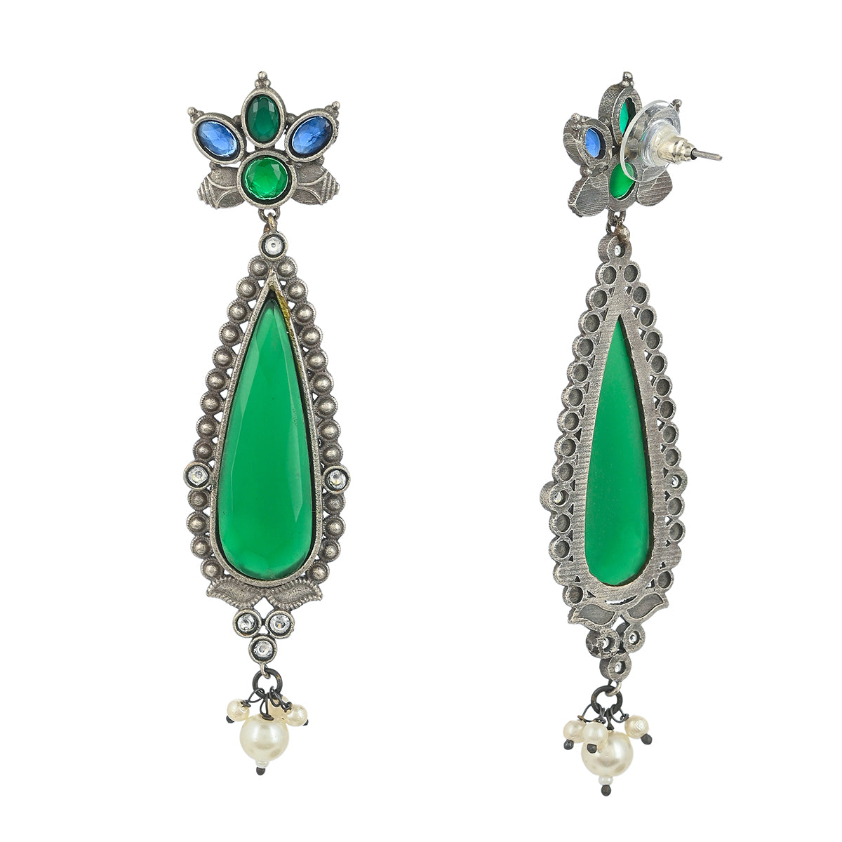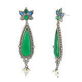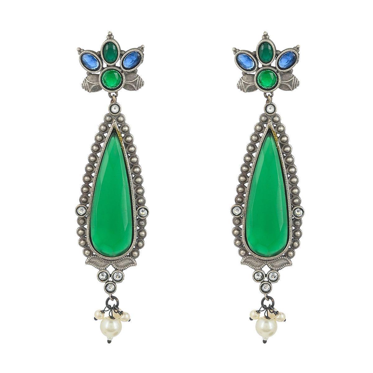 Teardrop earrings with green gemstones and faux pearls. Made from brass and oxidised silver plated, the lightweight and comfortable earrings will pair well with a traditional saree.