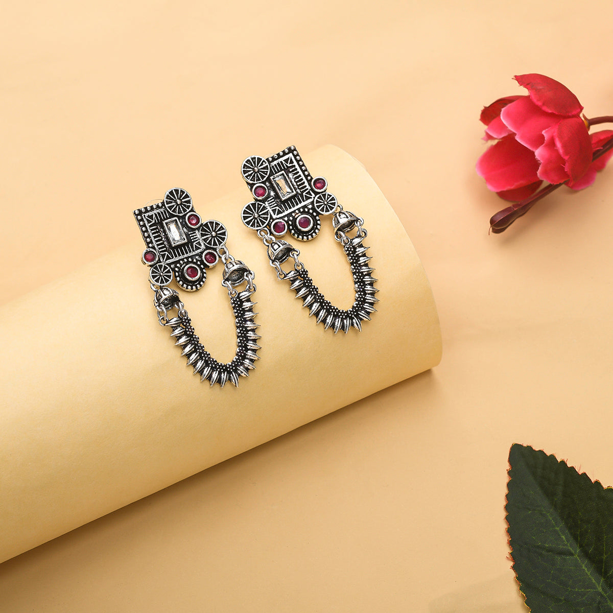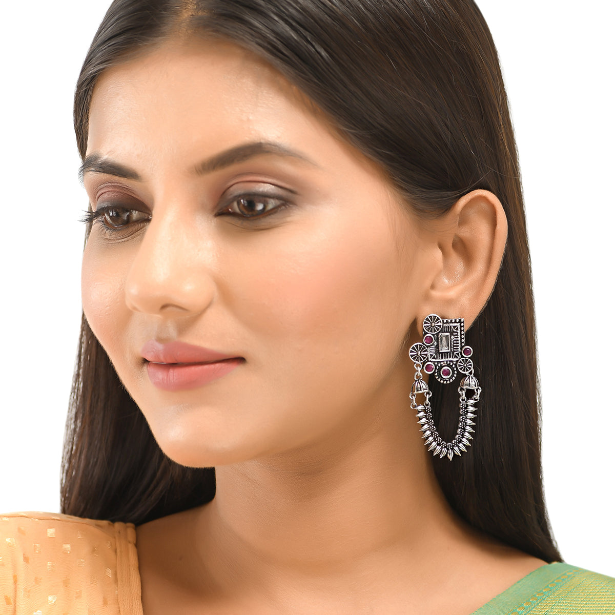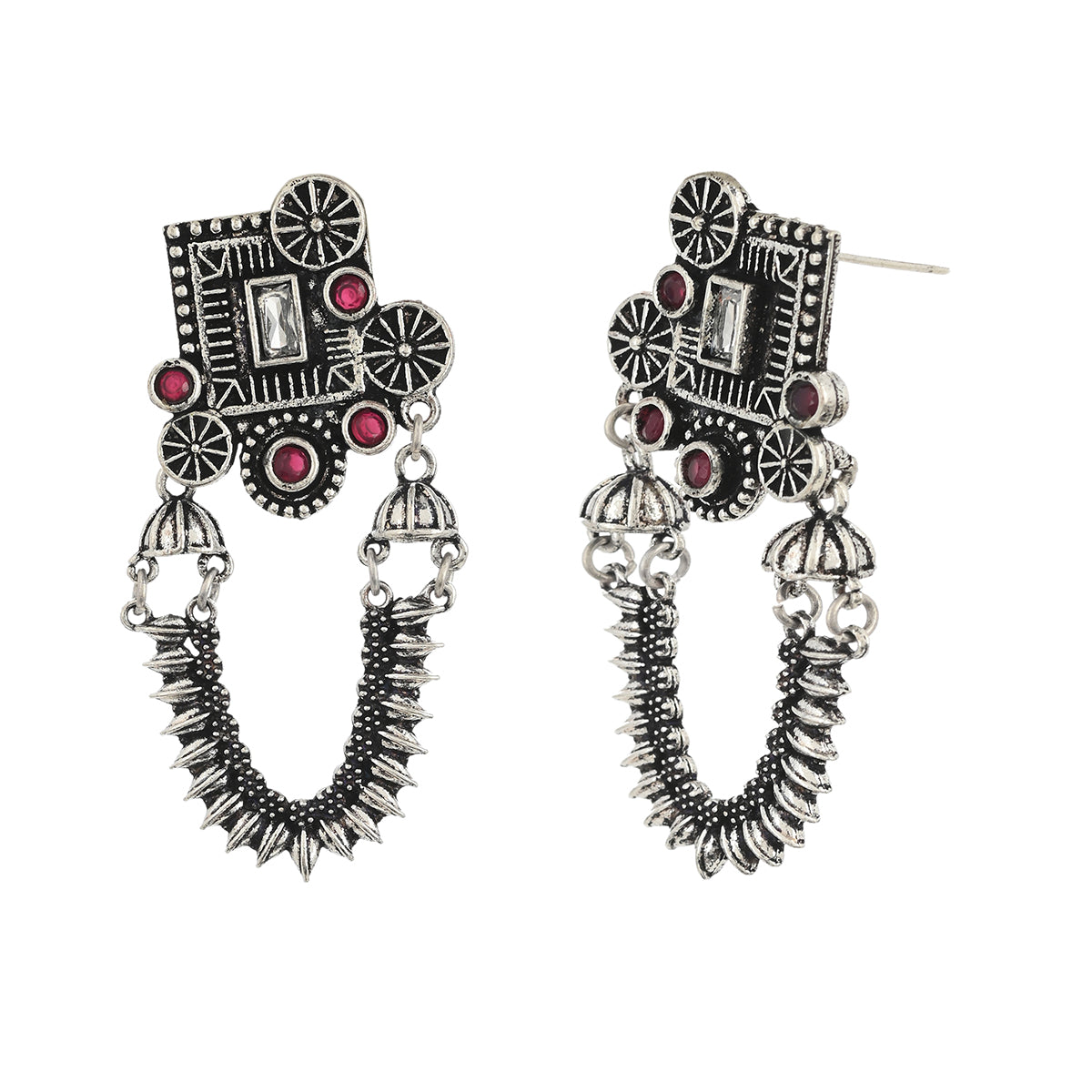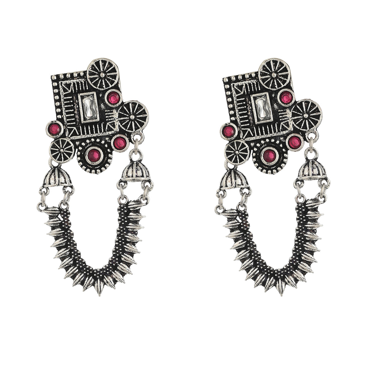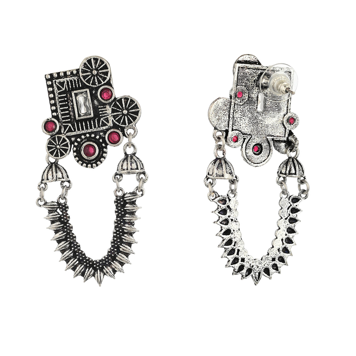 Temple inspired drop earrings, lightly embellished and oxidised silver plated. The pair has been crafted from high quality brass and promises to be a comfortable wear at all times. A good match for ethnic looks of all kinds.