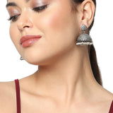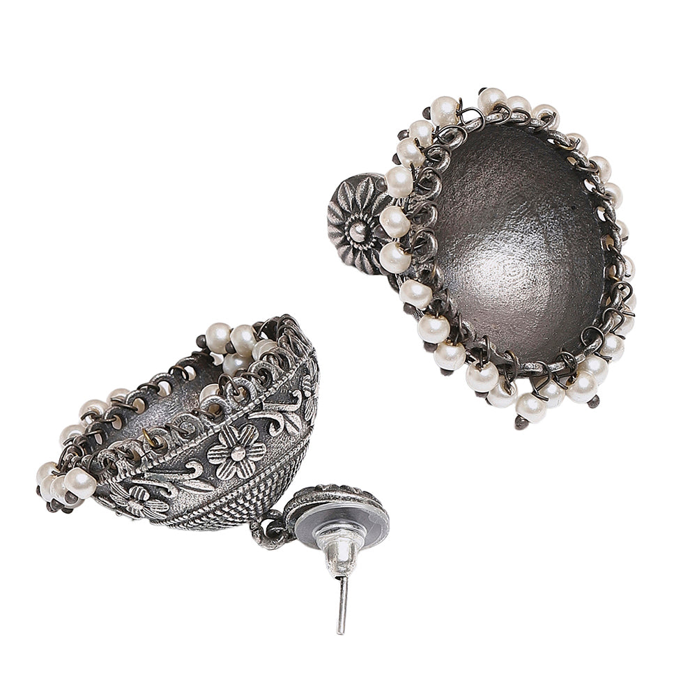 Vintage inspired classic jhumka earrings, fashioned out of quality brass and embellished with faux pearls. Oxidised silver plating and a textured surface design adds to the antique charm of this lightweight pair. The earrings will go splendidly with a traditional silk saree.