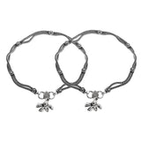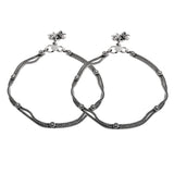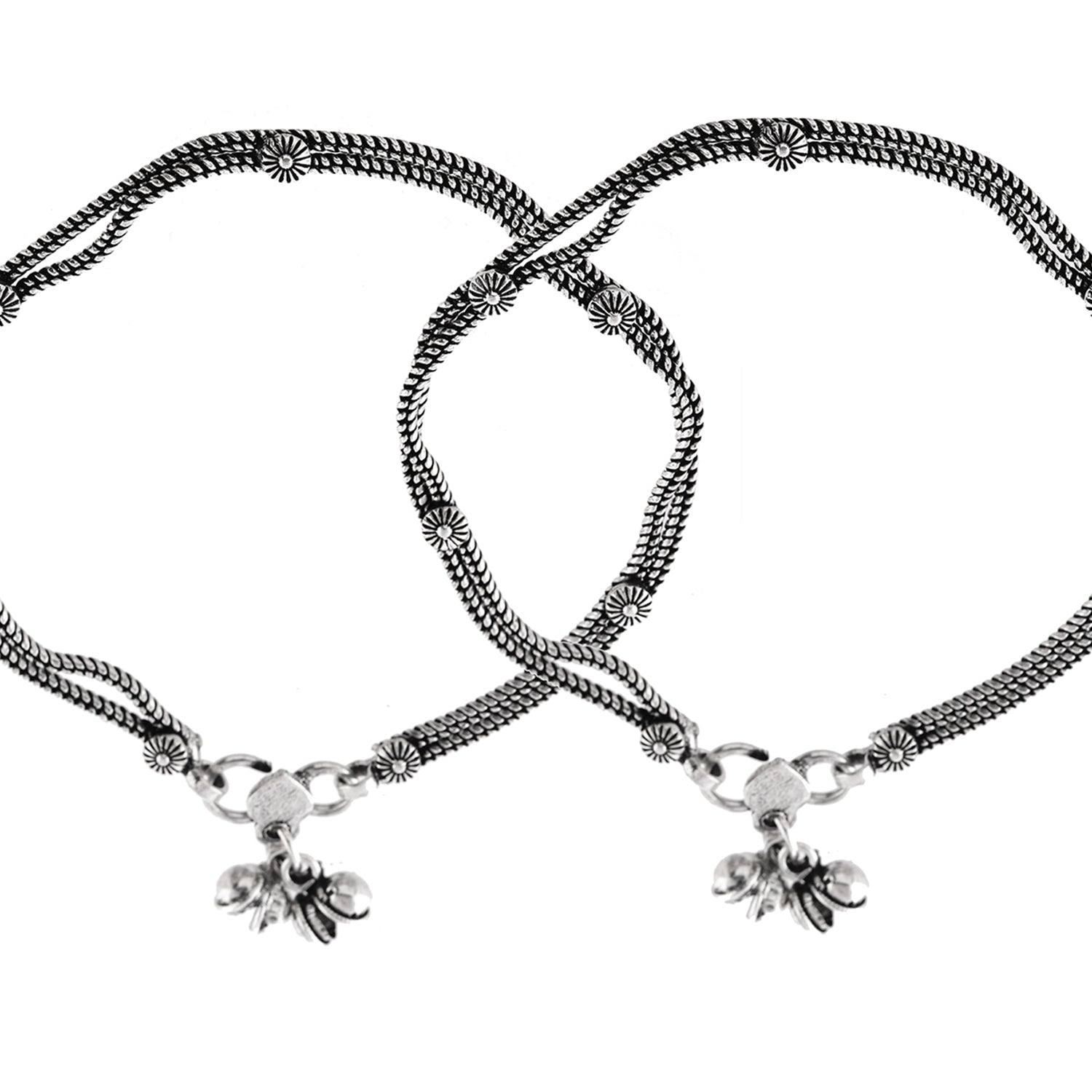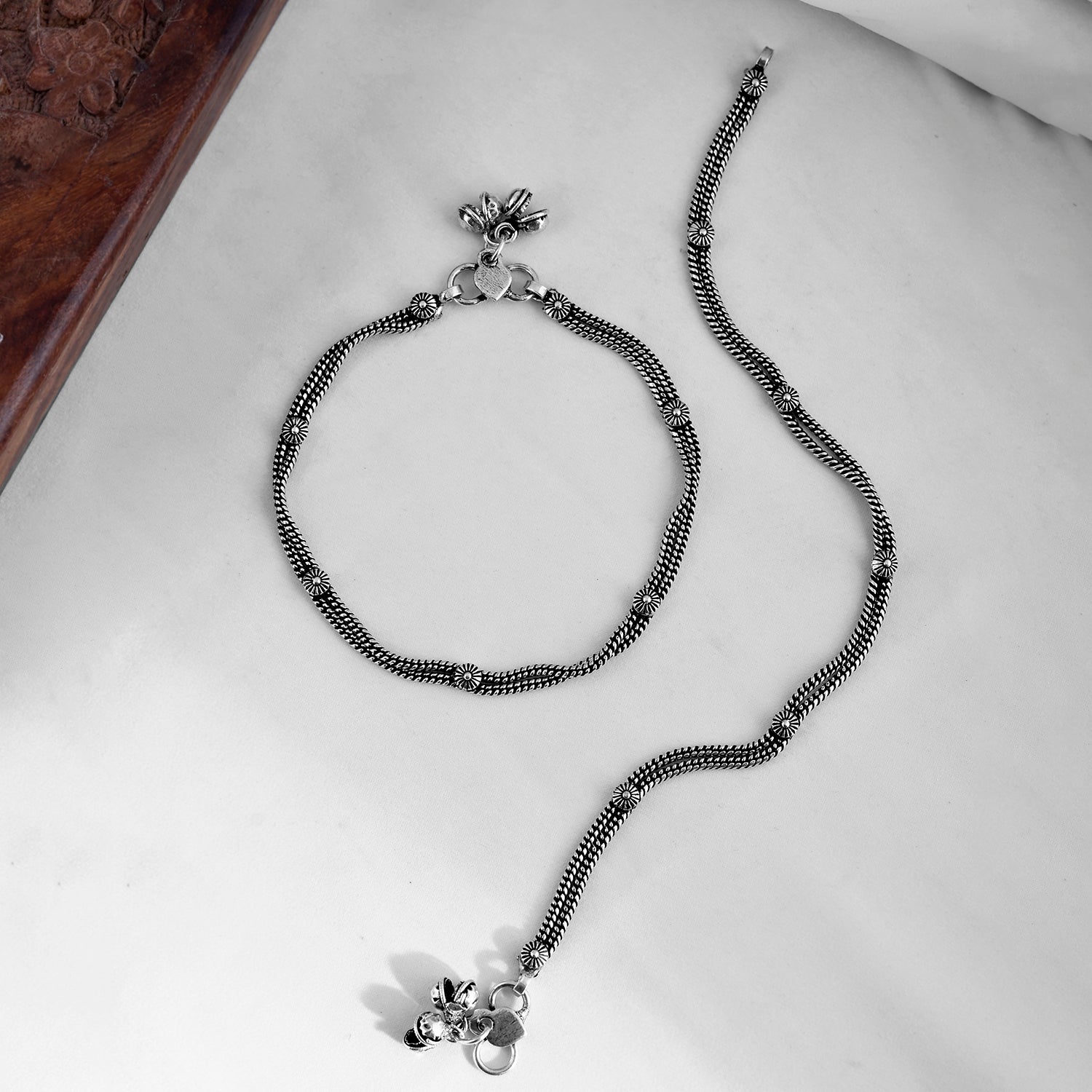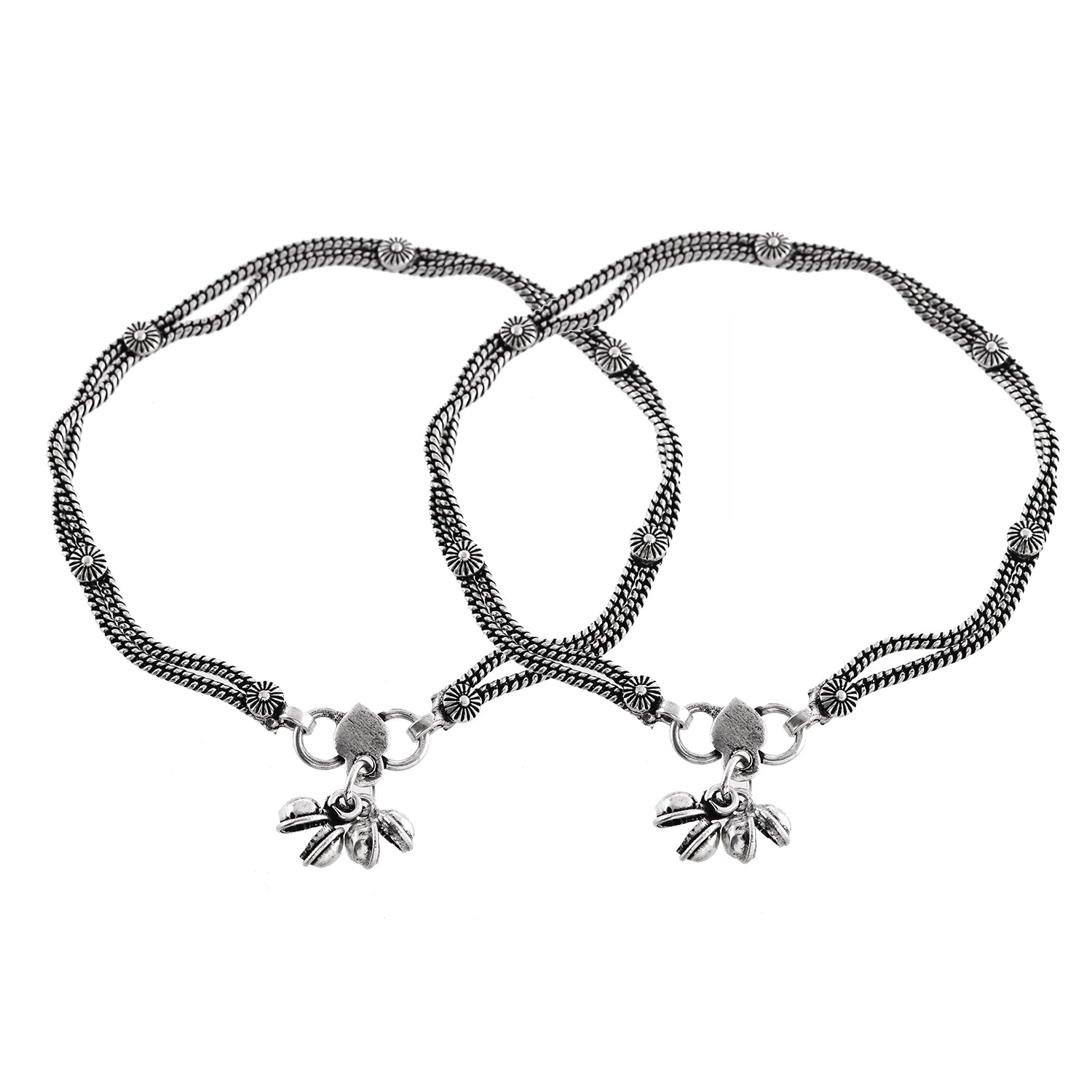 The Kashish Oxidised Anklet Set is a stunning piece of jewelry crafted from high-quality brass with a beautiful silver oxidised plating, making it a perfect addition to the Antique Essentials collection. These ethnic anklets, also known as payal, feature intricate detailing with small floral motifs and ghungroo accents that add a touch of traditional elegance. The versatile design makes them suitable for various occasions, whether it's everyday wear, work wear, or special events like pooja, holi, weddings, and more. The silver oxidised finish gives these anklets a timeless appeal, making them an ideal gift for women, whether it's for Valentine's Day, Diwali, Rakshabandhan, Christmas, New Year, or any other special occasion. These statement anklets are perfect for styling with ethnic outfits, adding a touch of sophistication and charm. They make a thoughtful gift for sisters, girlfriends, wives, mothers, or any loved one, ensuring they feel cherished and special.