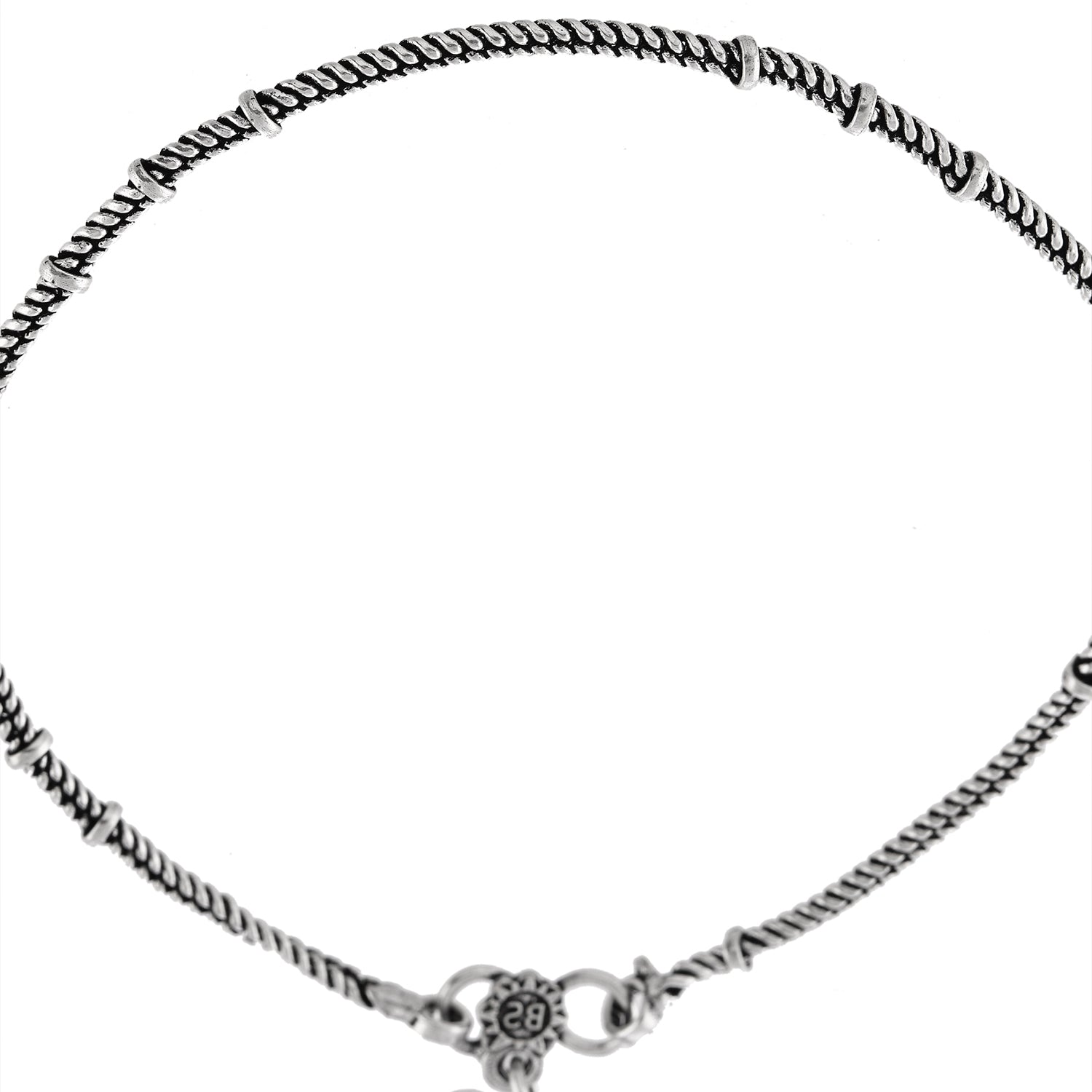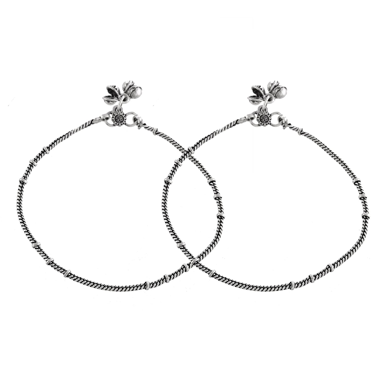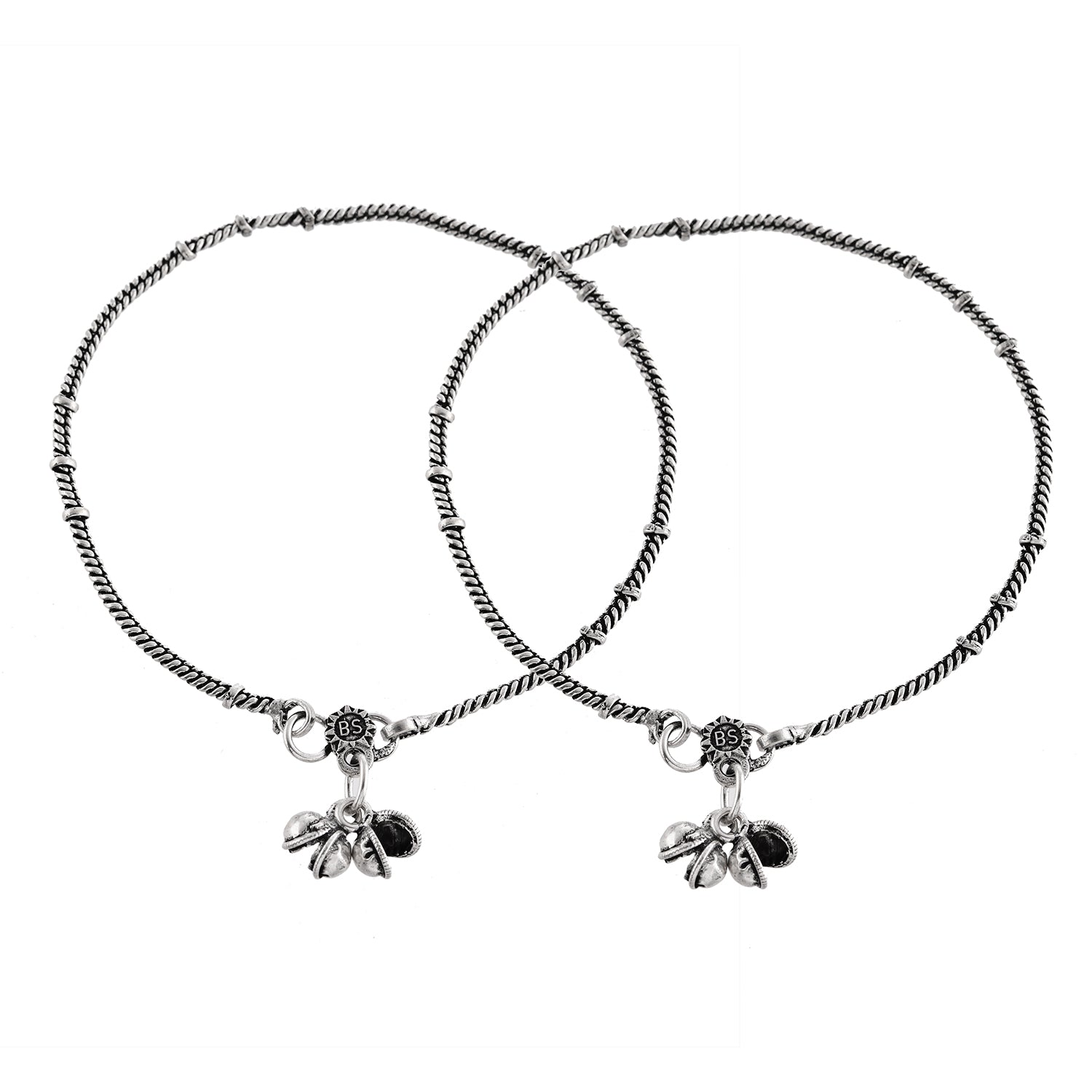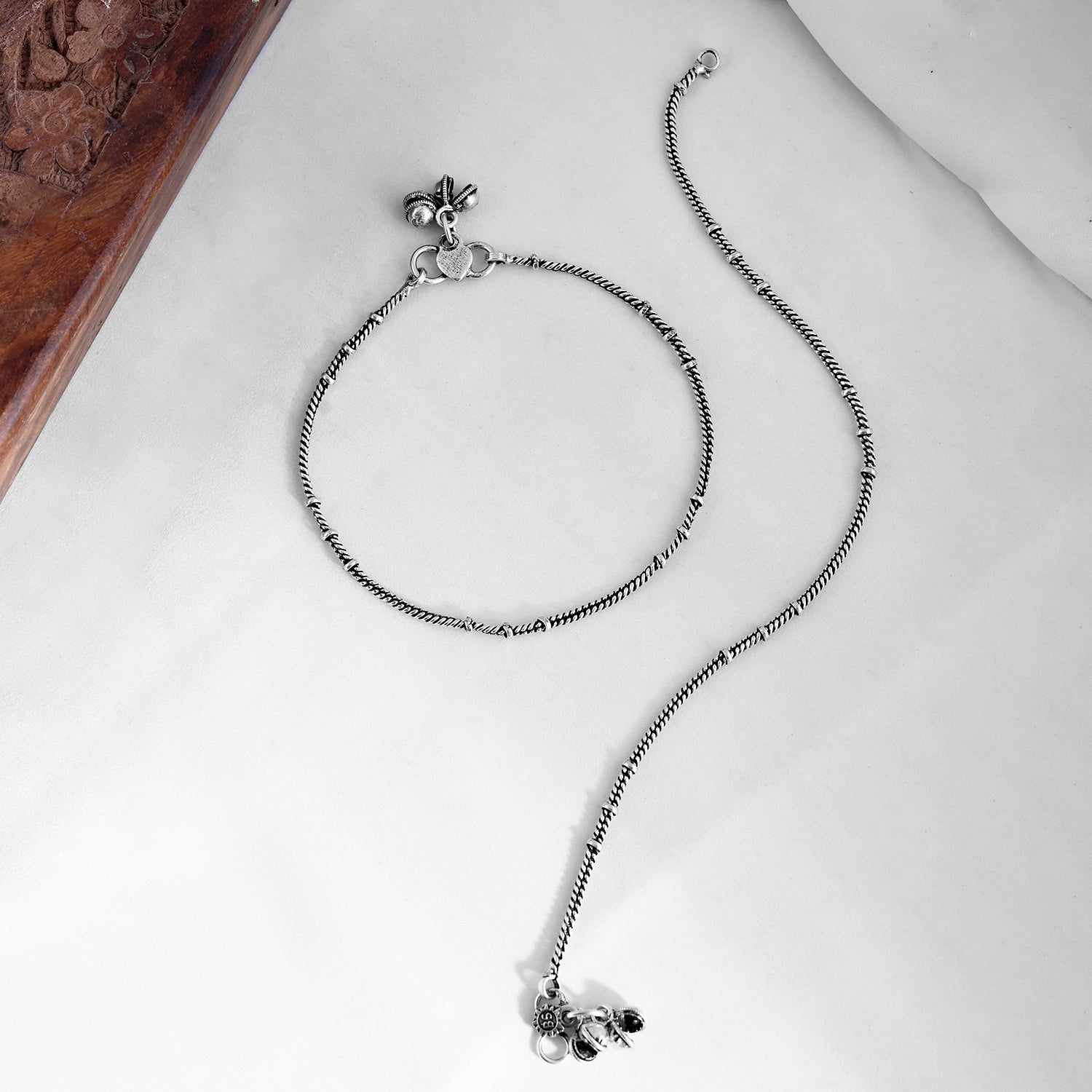 The Nazakat Oxidised Anklet Set is a stunning piece of jewelry crafted from high-quality brass with a beautiful silver oxidised plating, making it a perfect addition to the Antique Essentials Collection. These ethnic anklets, also known as payal, feature intricate detailing and a delicate design that exudes elegance and charm. The oxidised finish gives them a vintage appeal, making them ideal for both everyday wear and special occasions such as weddings, poojas, Holi, and more. These statement anklets are versatile and can be styled with traditional Indian attire or contemporary outfits, adding a touch of sophistication to any look. The ghungroo details enhance their ethnic charm, making them a perfect gift for women on occasions like Valentine's Day, Diwali, Rakshabandhan, Christmas, New Year, and more. Whether you're looking for a gift for your sister, girlfriend, wife, mother, or lover, these anklets are sure to impress and delight.