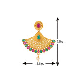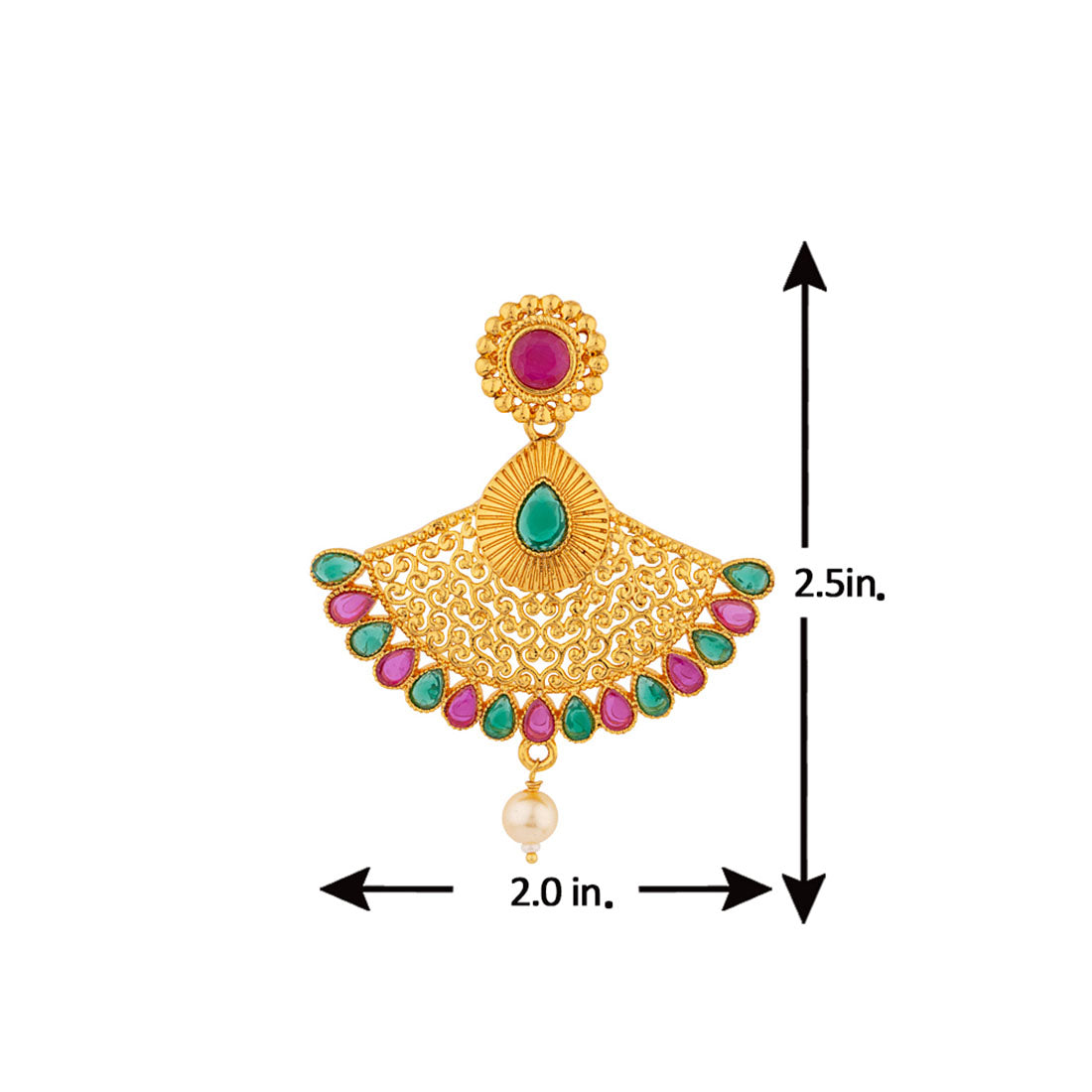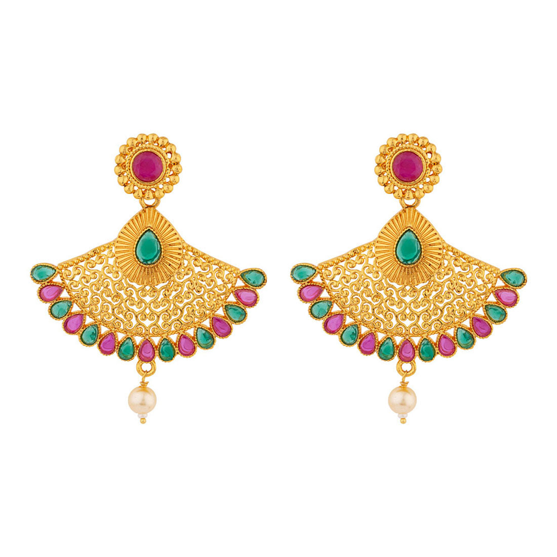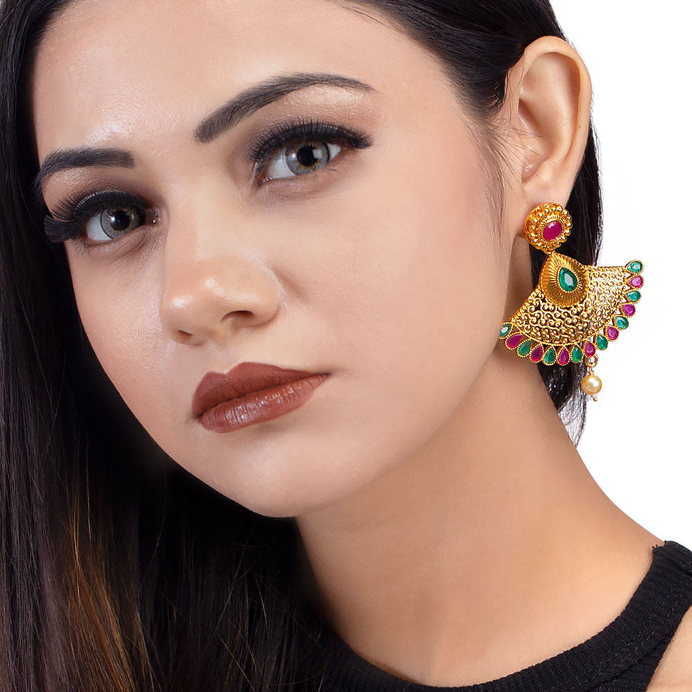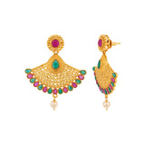 Antique inspired earrings made from brass. Yellow gold plated and coloured American Diamond gems embellished. Wear with a traditional saree.