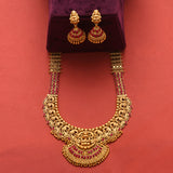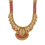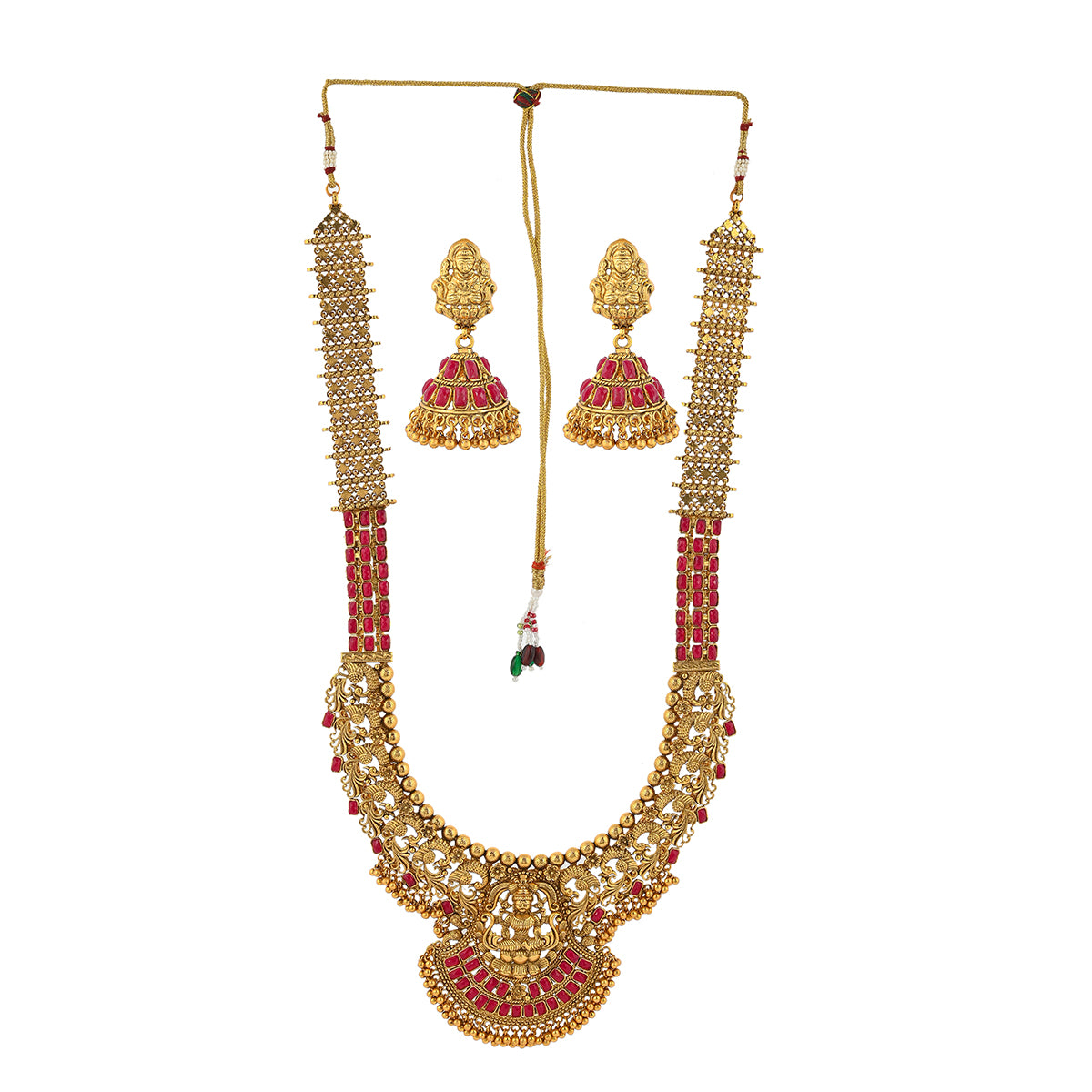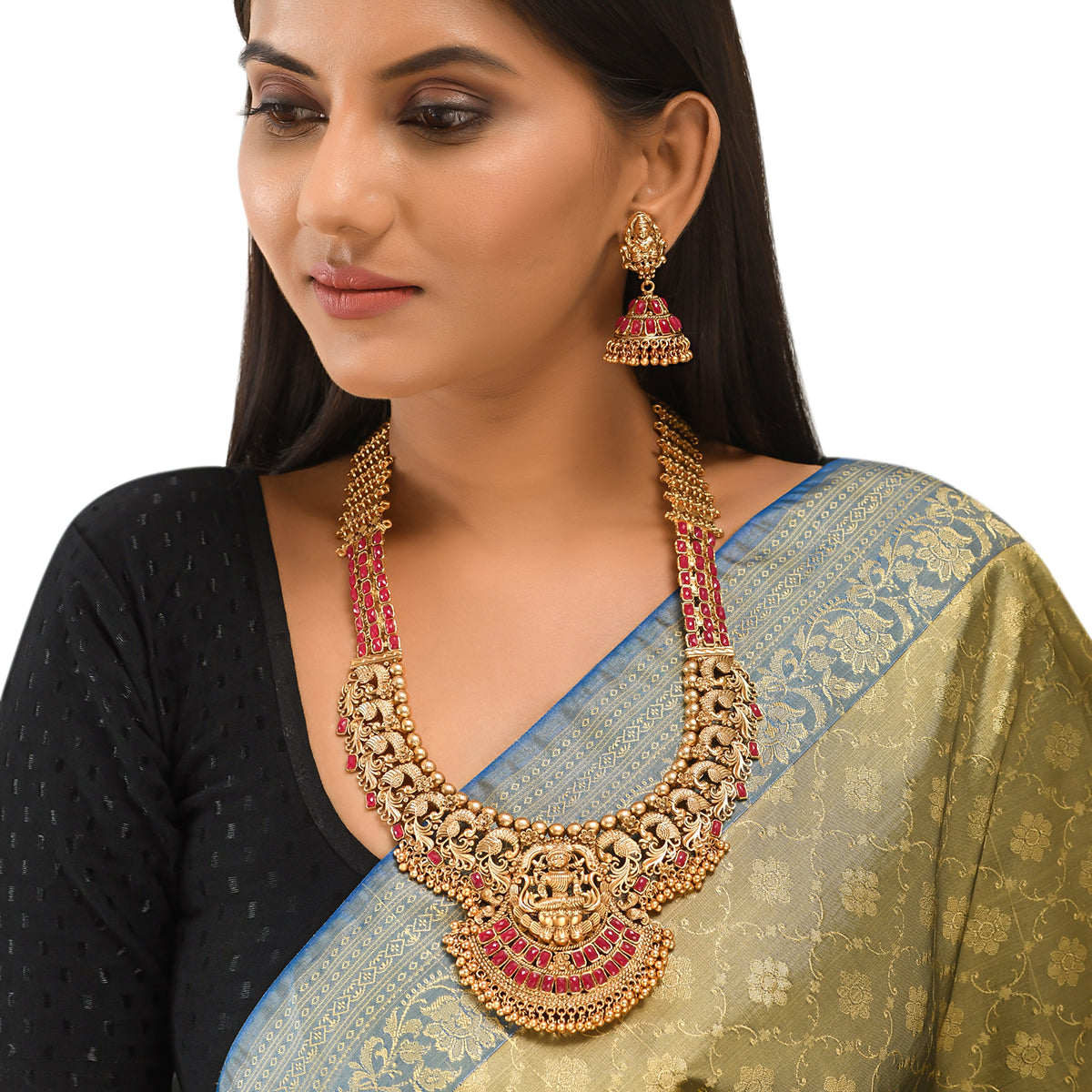 Antique inspired temple jewellery set, made from brass. Yellow gold plating adds to the opulence of the long necklace and earrings, which have been embellished with zircon gems and feature goddess Lakshmi motifs. Pair the set with a traditional silk saree.