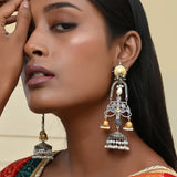 Celebrate the festive season with these exquisite Voylla Earrings for women, perfect for Navratri, Diwali, Durga Puja, Rakhi, and Rakshabandhan. These long chandbali jhumka earrings are crafted from high-quality brass, featuring intricate designs with a blend of gold and silver tones. The earrings showcase delicate floral patterns, adorned with pearl-like beads and golden jhumkas, making them an ideal gift for her - be it your wife, sister, girlfriend, mother, or friend. These dangler earrings are not just accessories but a statement piece that adds elegance and charm to any festive attire. Perfect for puja and other celebrations, these earrings are a must-have in your festive jewelry collection.