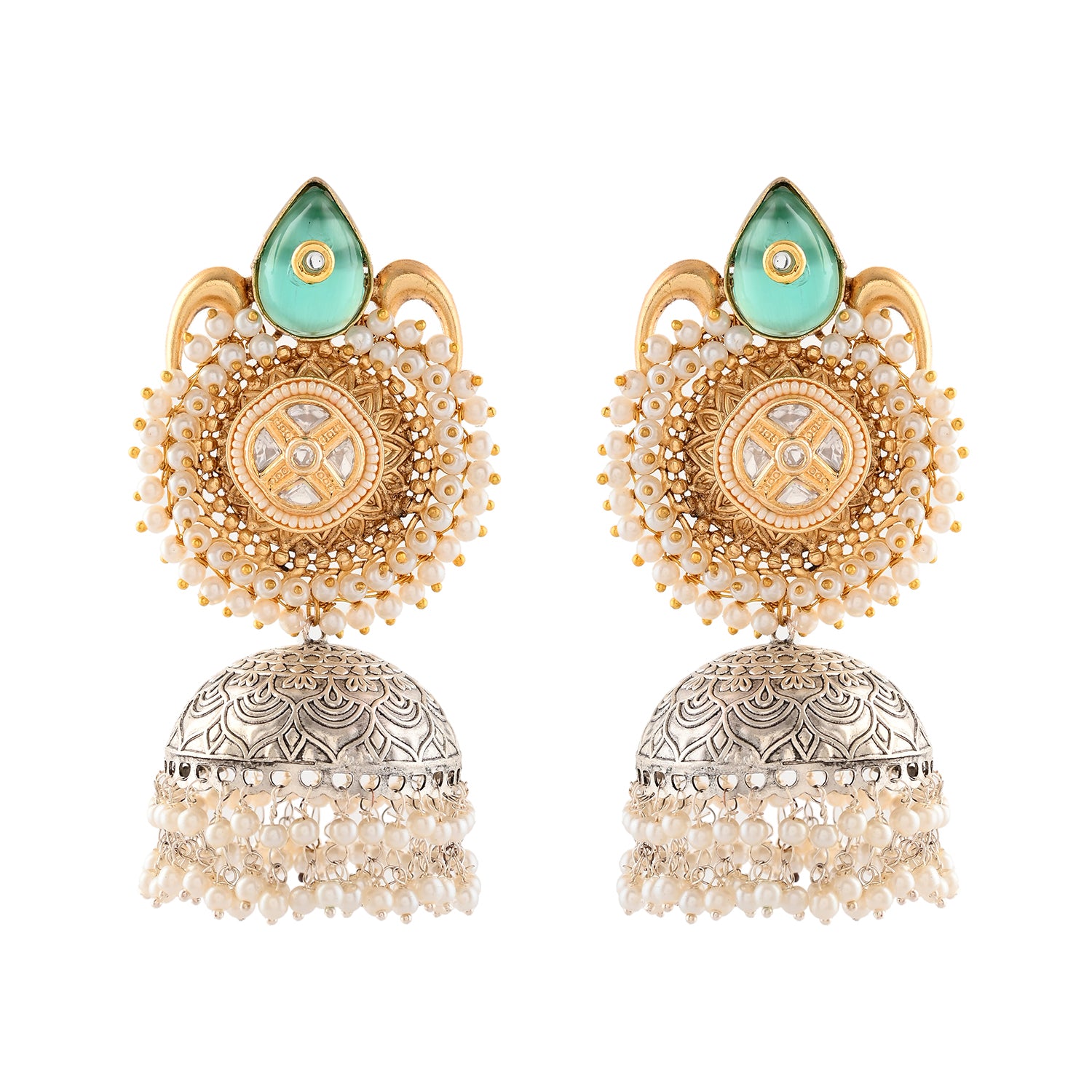 Elevate your festive look with these exquisite Voylla Long Chandbali Jhumka Earrings, crafted from high-quality brass. These earrings for women feature a stunning combination of intricate gold and silver detailing, adorned with delicate pearls and a striking green teardrop accent. Ideal for Navratri, Diwali, Durga Puja, Rakhi, and other festive occasions, these earrings make a perfect gift for her - be it your wife, sister, girlfriend, mother, or friend. Embrace the elegance of chandbali earrings and make a statement with these beautiful dangler earrings. Perfect for adding a touch of traditional charm to your festive attire.