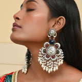 Celebrate the festive season with these exquisite Voylla Earrings for women, perfect for Navratri, Diwali, Durga Puja, Rakhi, and Rakshabandhan. These long Chandbali earrings are crafted from high-quality brass, featuring intricate designs adorned with vibrant blue, pink, and green stones. The earrings are embellished with delicate pearl-like danglers, adding a touch of elegance and grace. Ideal as a gift for her, whether it's for your wife, sister, girlfriend, mother, or friend, these earrings are a stunning addition to any festive attire. Embrace the spirit of the festivities with these beautiful dangler earrings that are sure to make a statement.
