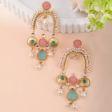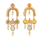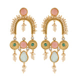 Elevate your festive look with these exquisite Voylla Long Chandbali Earrings, crafted from high-quality brass. These earrings for women feature a stunning design adorned with intricate detailing, perfect for Navratri, Diwali, Durga Puja, Rakhi, and other festive occasions. The earrings showcase a beautiful combination of pastel pink and green stones, complemented by delicate pearl accents, making them an ideal gift for her - be it your wife, sister, girlfriend, mother, or friend. These dangler earrings are not just a piece of jewelry but a statement of elegance and tradition, perfect for adding a touch of glamour to your festive attire.