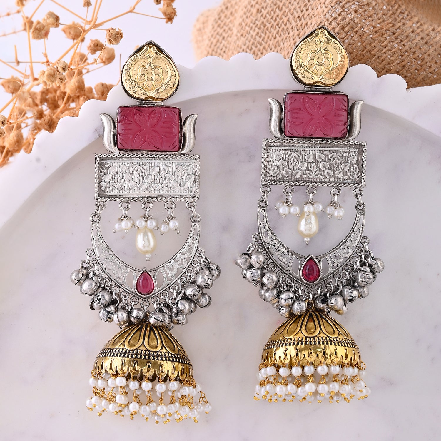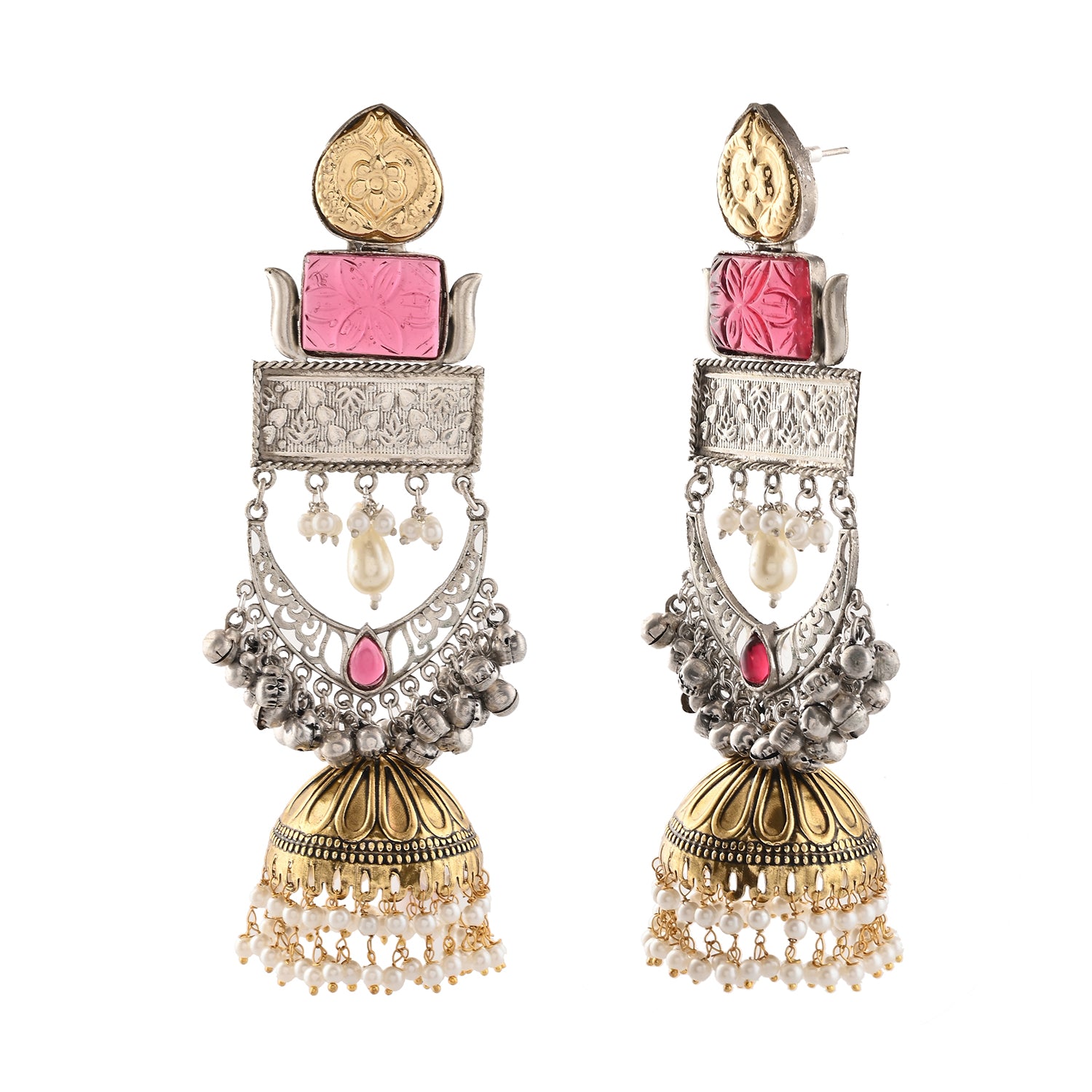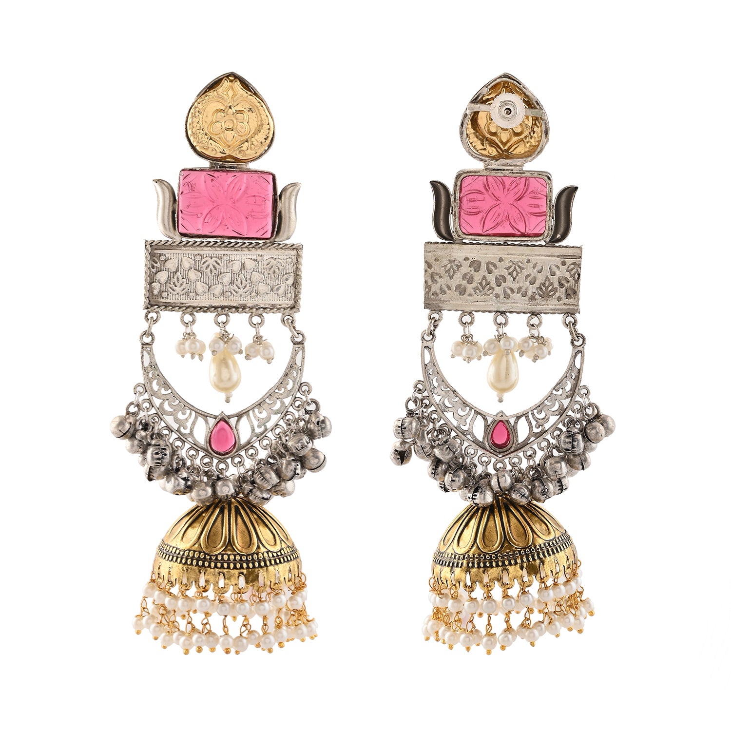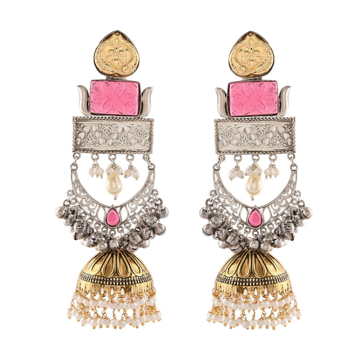 Elevate your festive look with these exquisite Voylla Long Chandbali Earrings, crafted from high-quality brass. These earrings for women feature an intricate design with a blend of gold and silver tones, adorned with delicate pearls and vibrant pink accents. Ideal for Navratri, Diwali, Durga Puja, Rakhi, and other festive occasions, these dangler earrings are a perfect gift for her - be it your wife, sister, girlfriend, mother, or friend. Celebrate the festive season in style with these stunning Navratri earrings for women, making every moment special and memorable.