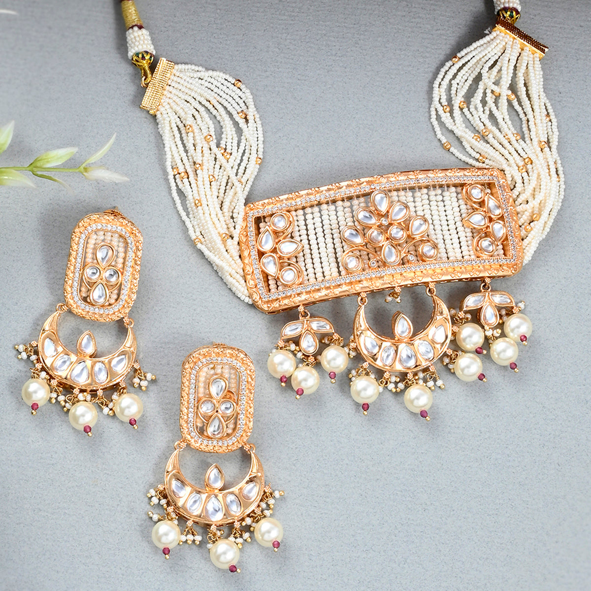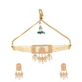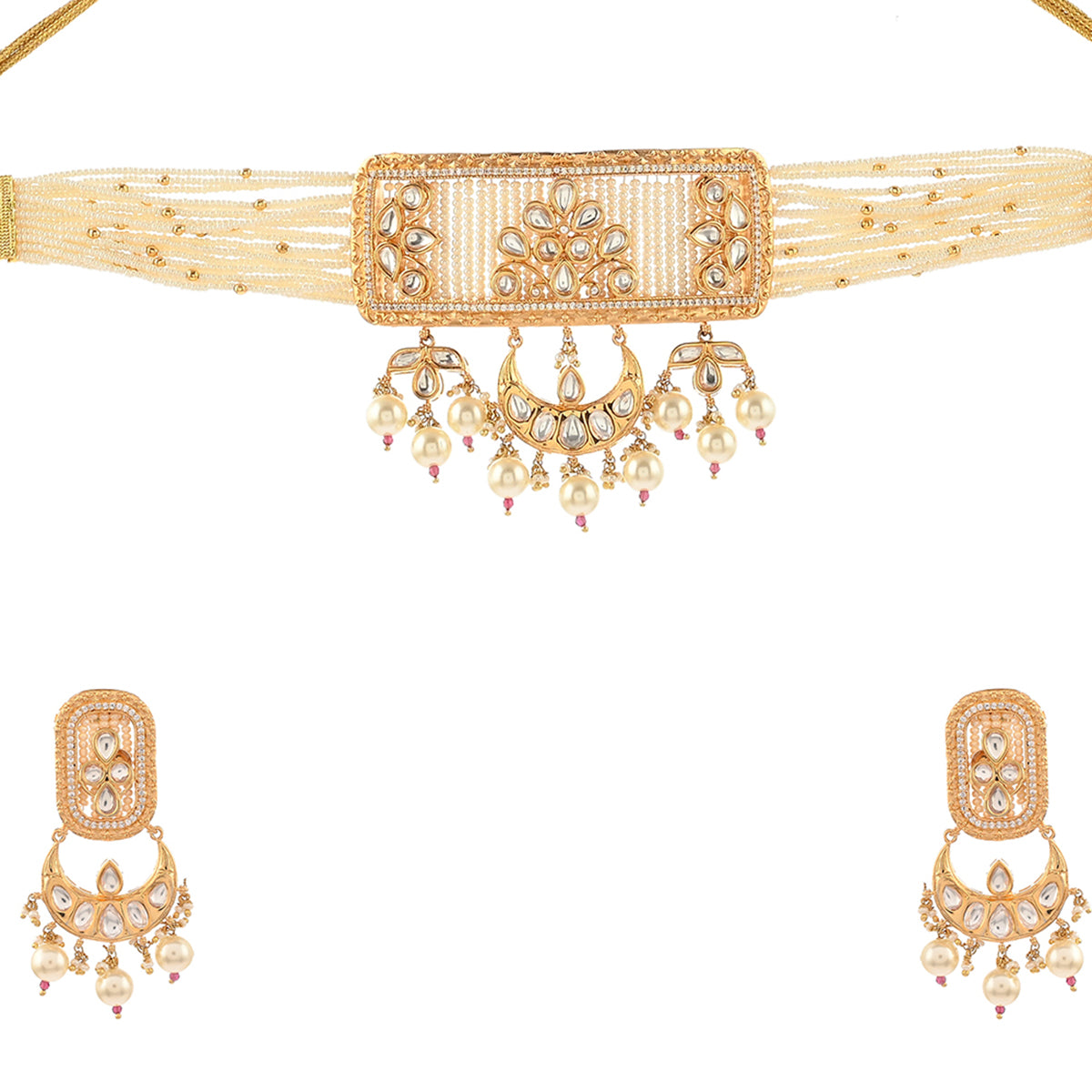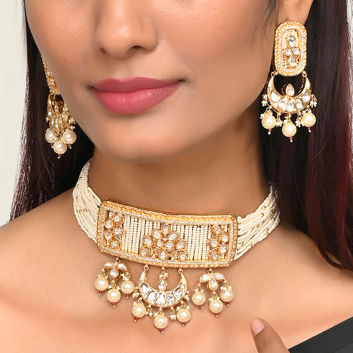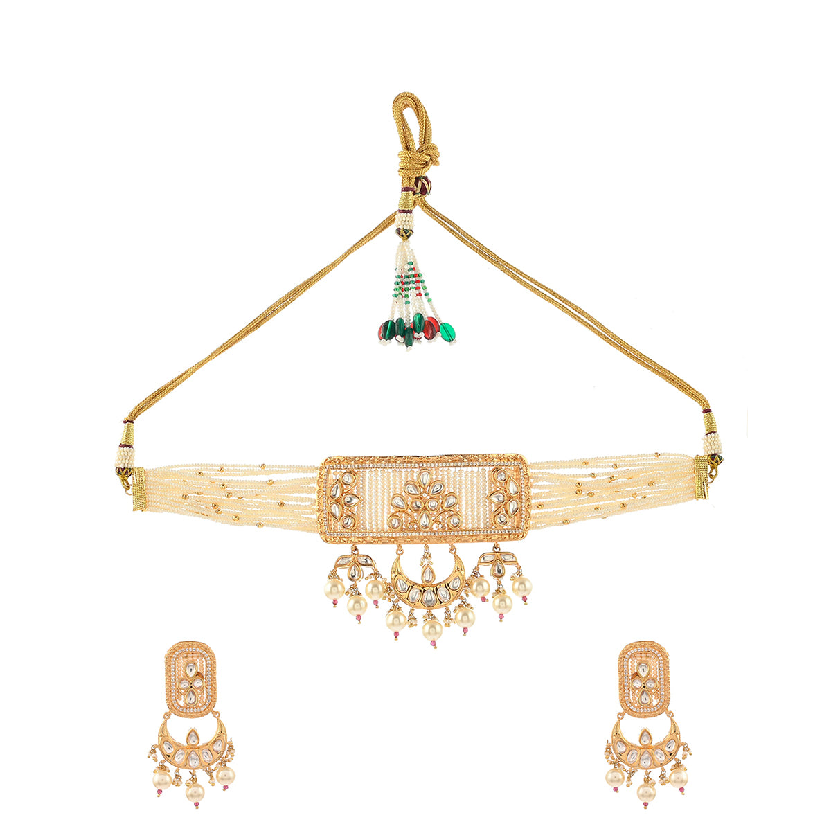 Heavily embellished with faux kundan gemstones and pearls, this jewellery set has been fashioned out of brass. Yellow gold plating adds to the opulence of the choker necklace and matching drop earrings. A good match for formal Indian and Indo.