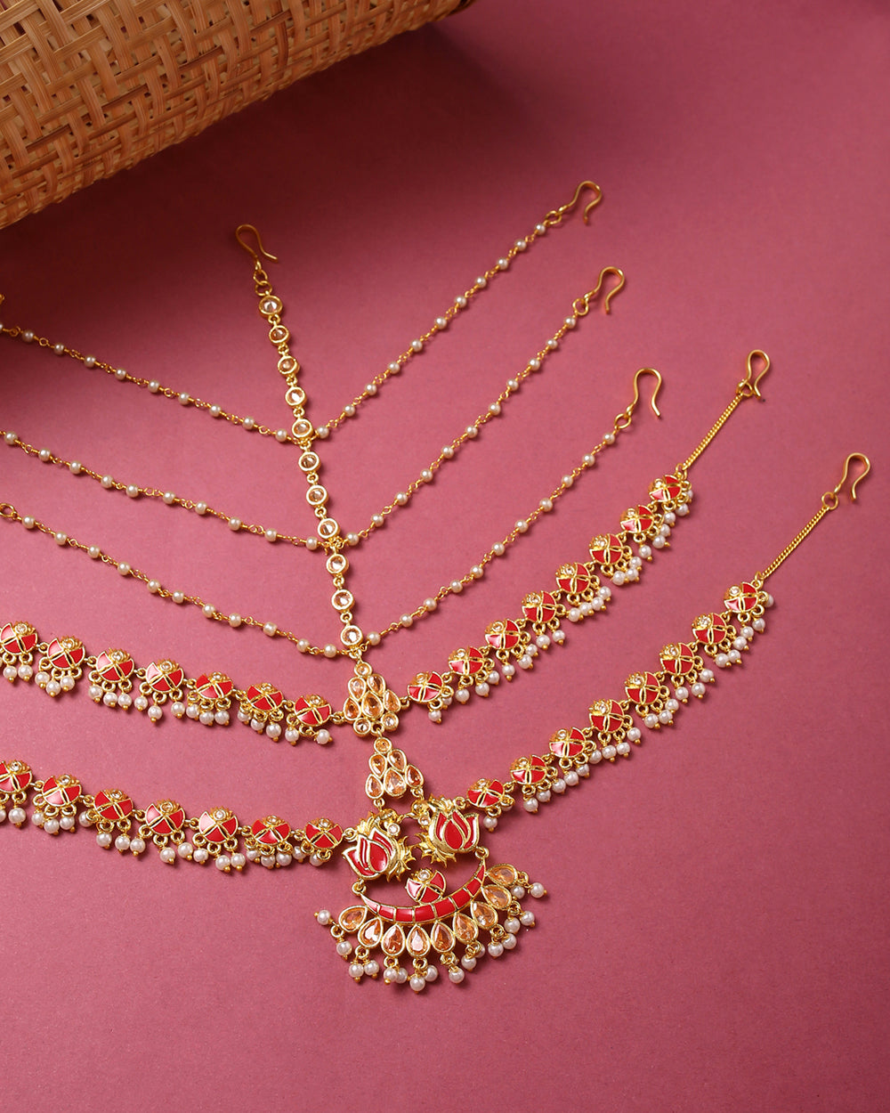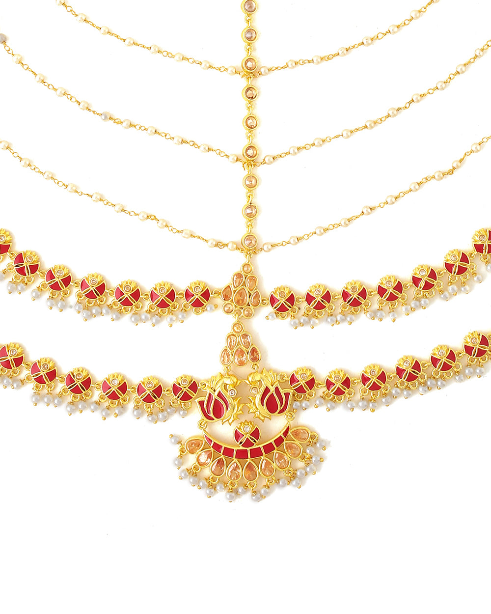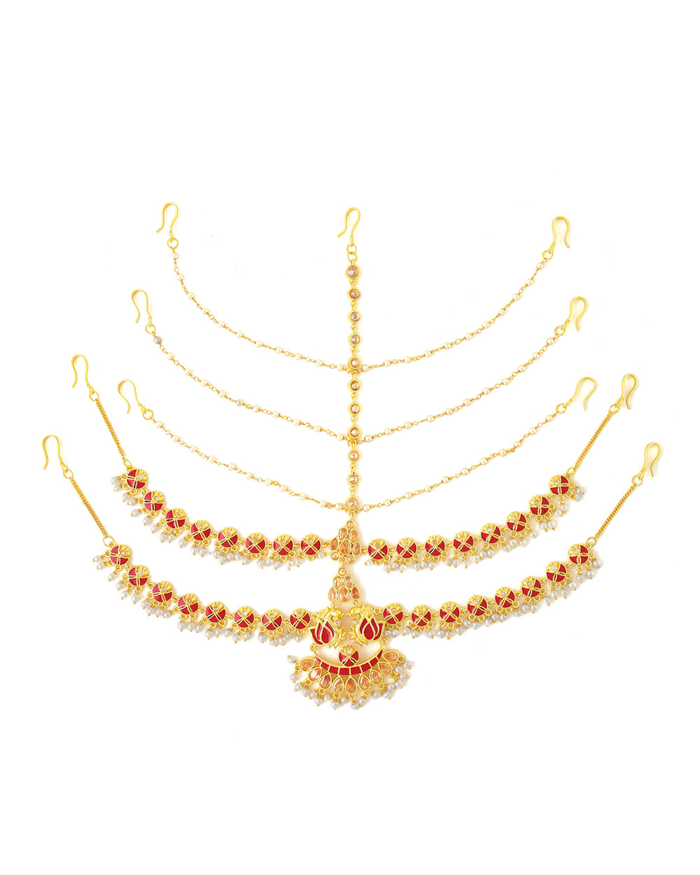 For your big day, you have the full permission to go all out when we talk about the glam factor, and nothing talks glam like the matha patti does. Wear this stunning brass matha patti and killed your bridal look. Talking about its design, it has lotus and crescent moon motifs with red enameling on the die gold base. Also, it has an embellishment of beige color faux stone and pearl drops.