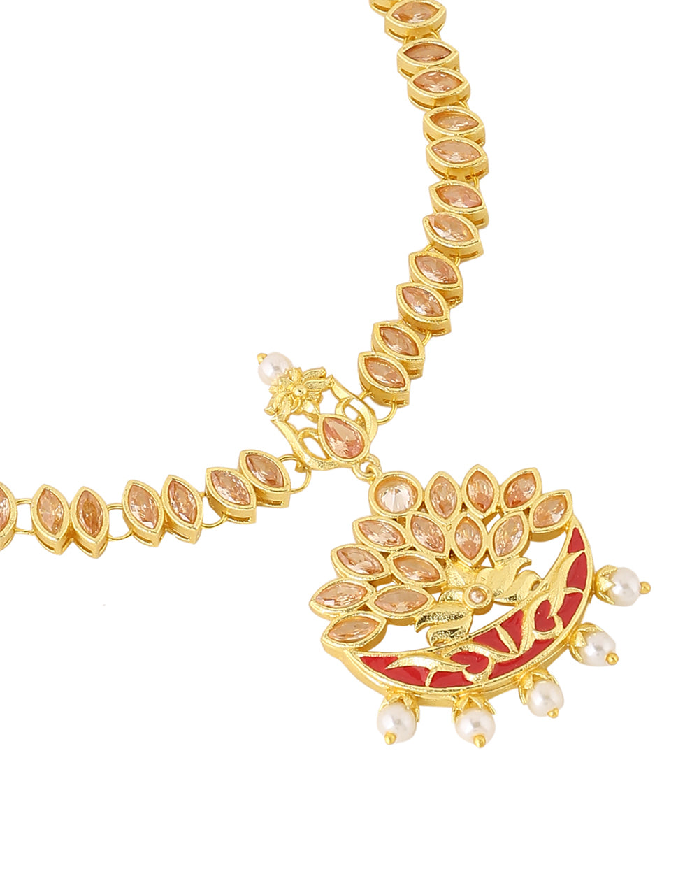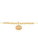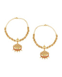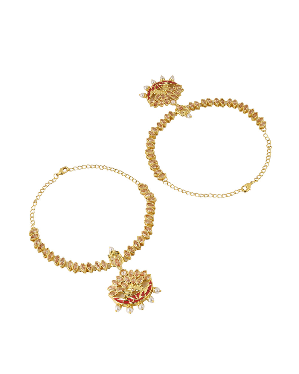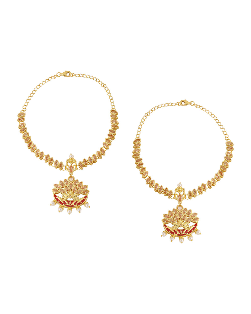 The Apsara Bridal armlets are an ideal choice to add a little something extra to your outfit, especially if you have shorter sleeves. Plus, if you have thin arms, then why not show them off. The drop pattern studded with beige color faux stones and the red enameled crescent moon centerpiece render an exotic look. The yellow gold polish and pearls give it a classic and luxurious look. Perfect for festive occasions, this set will complement your attire and show off your unique fashion sense. Pair it up with a silk saree or lehenga, it is sure to draw all attention.