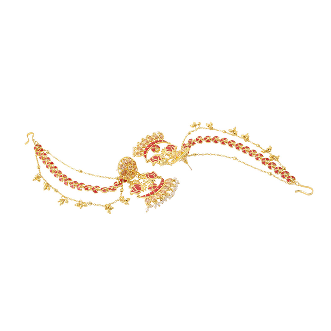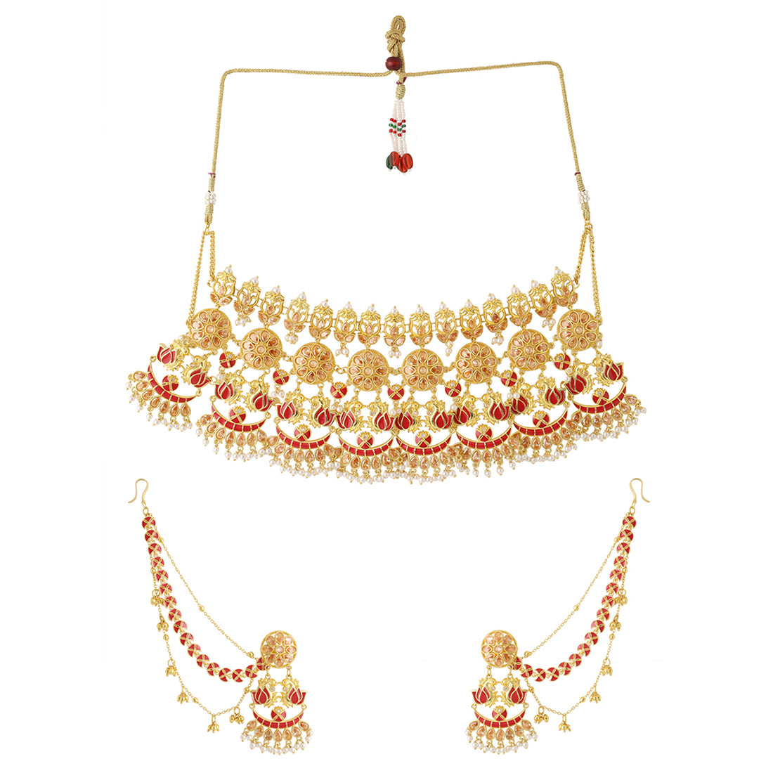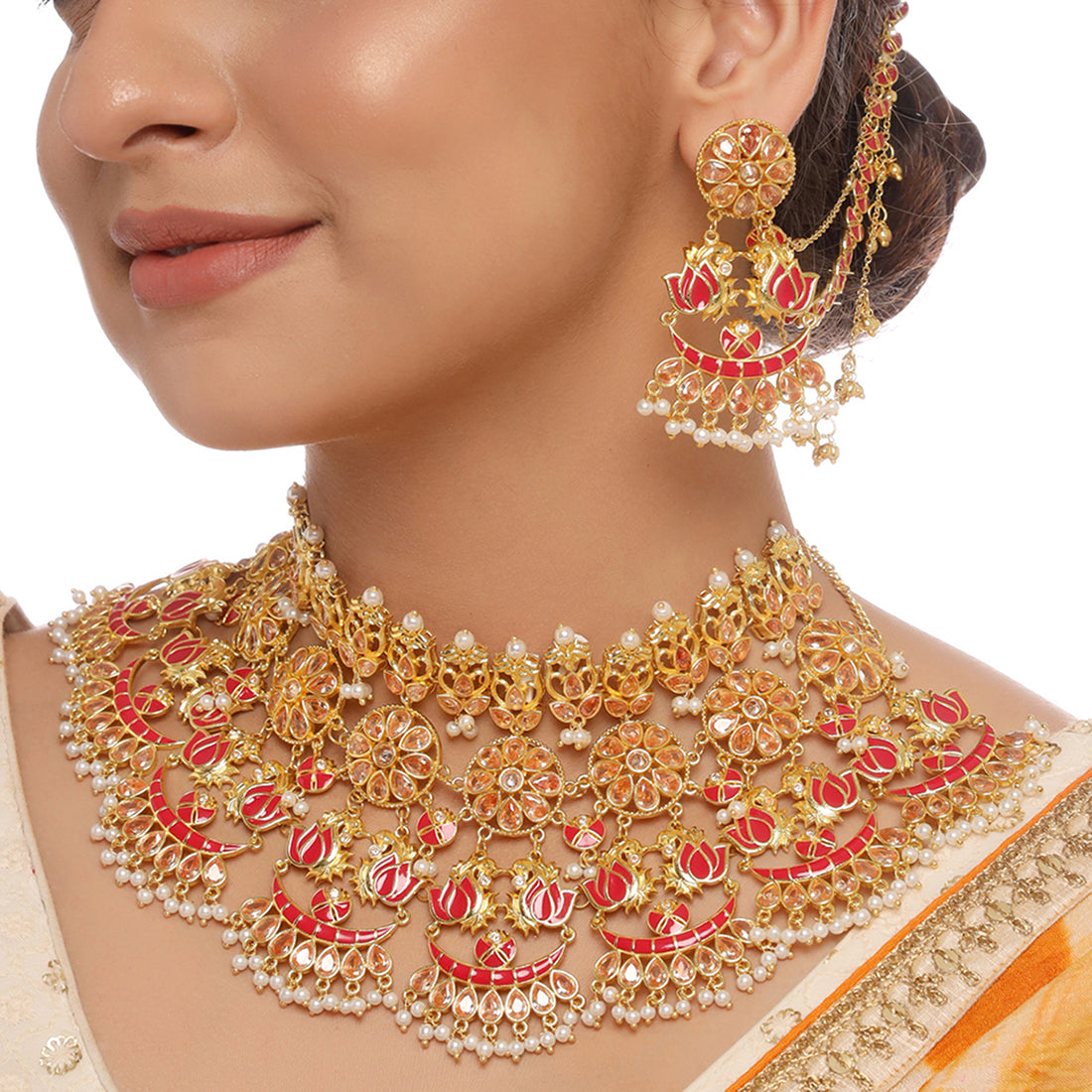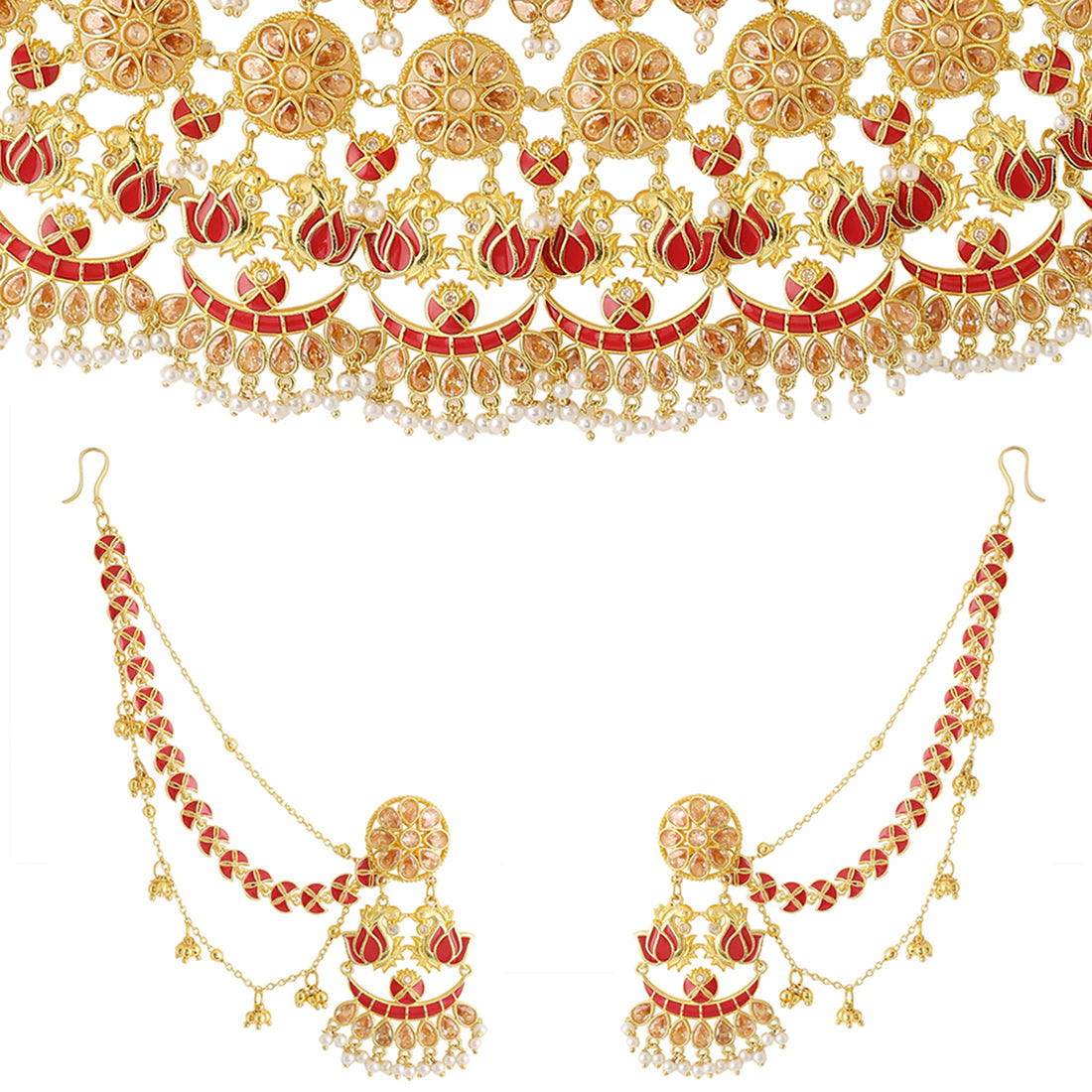 Apsara Bridal Red Enamelled with Pearl Lotus Jewellery Set