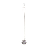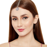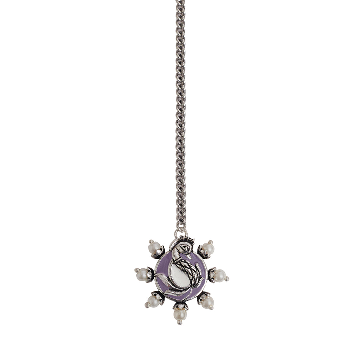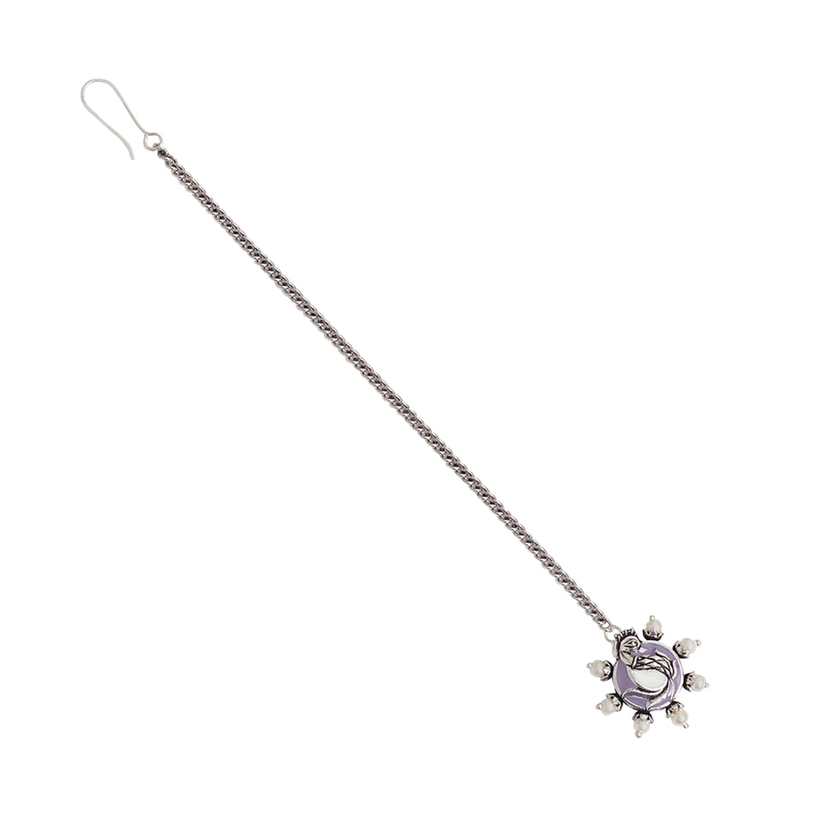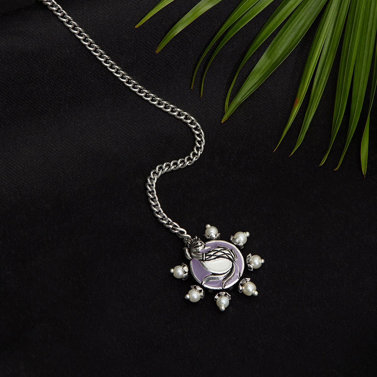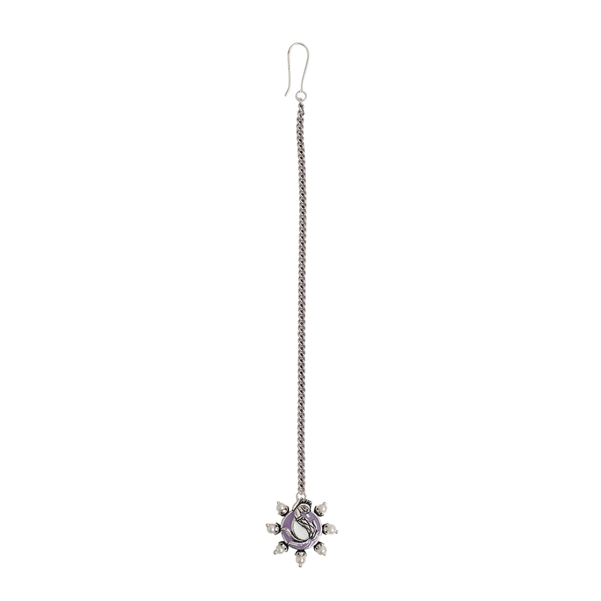 Silver plated maang tika, made from brass and featuring a peacock motif. Embellished with faux pearls, the enamelled piece is lightweight and comfortable. The tika is versatile enough to be paired with a wide range of ethnic, Indo-Western and even Bohemian looks.