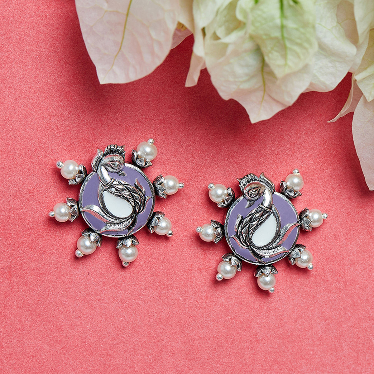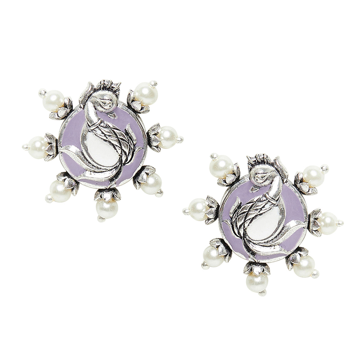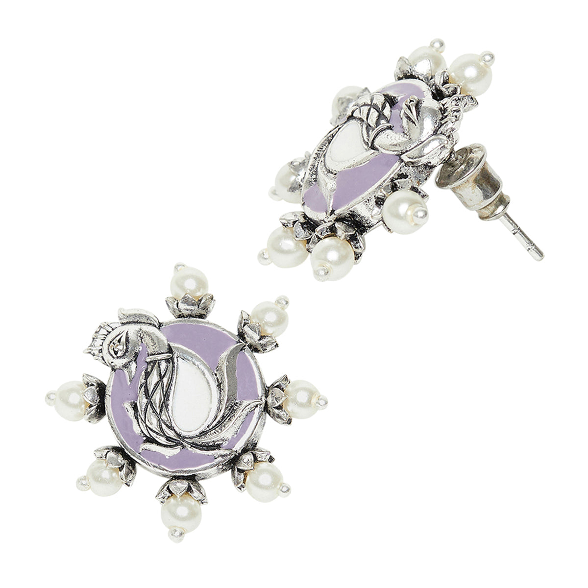 Shwet Kamal Floral Motif Faux Pearls Adorned Silver Toned Stud Earrings