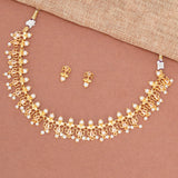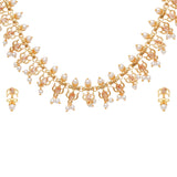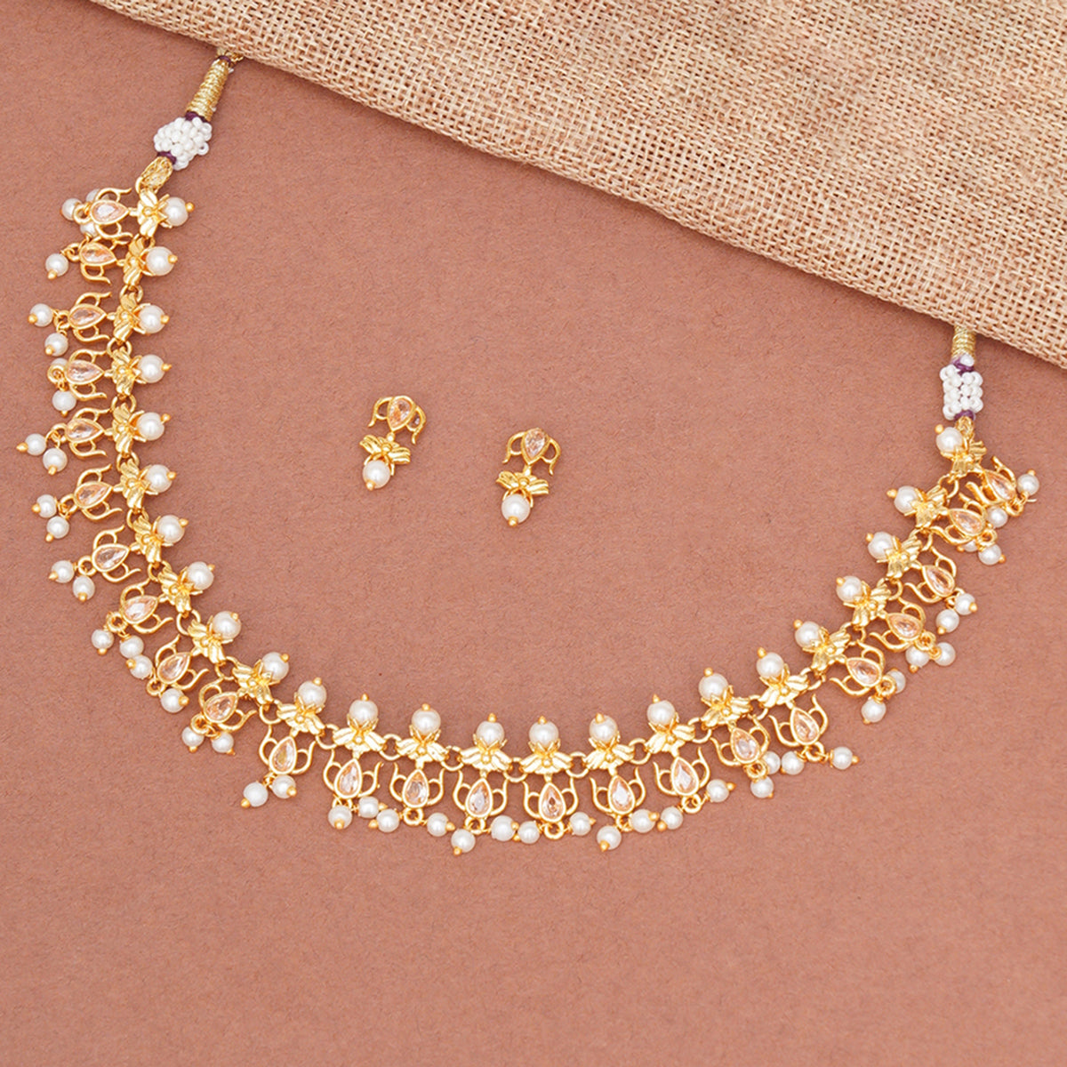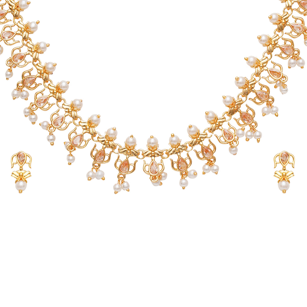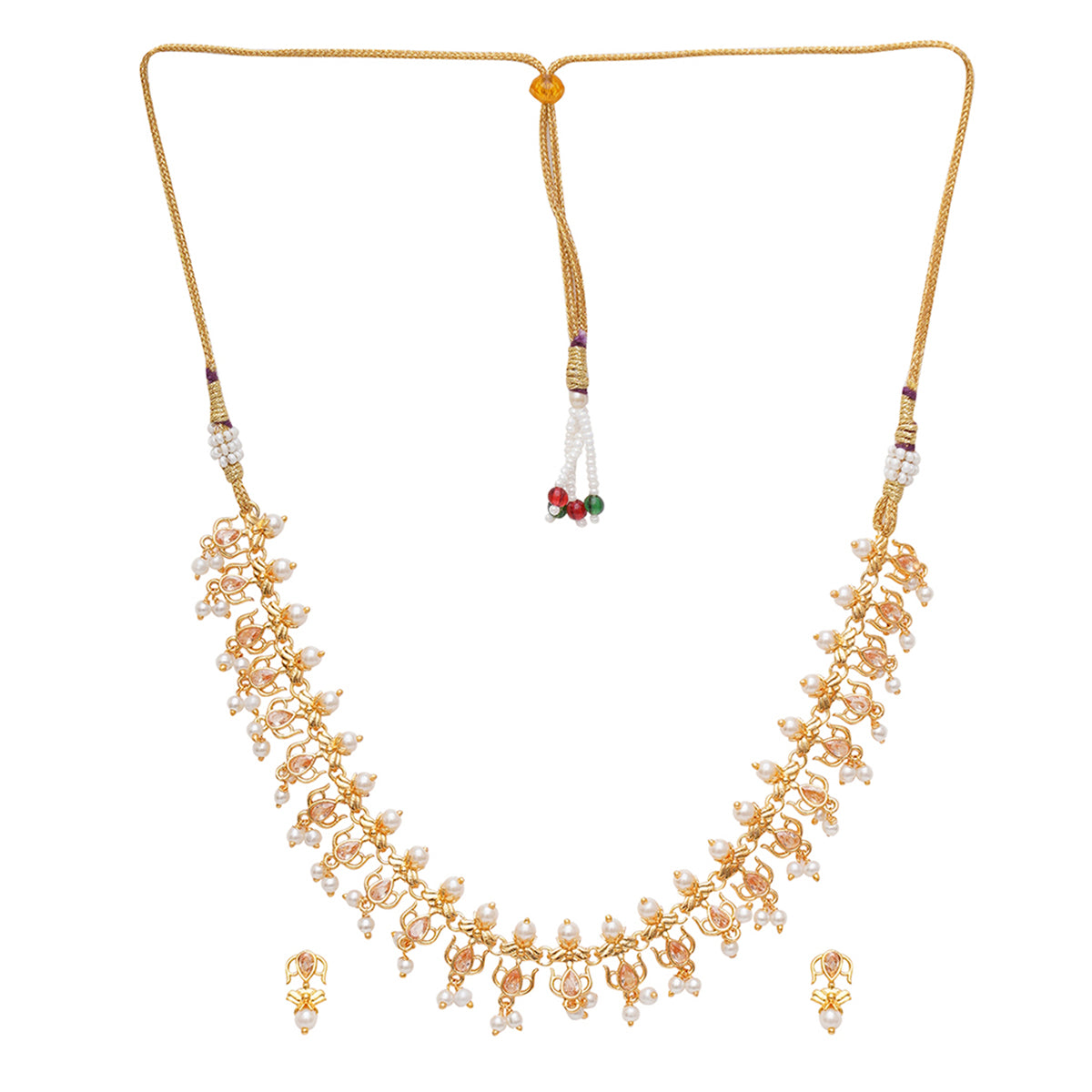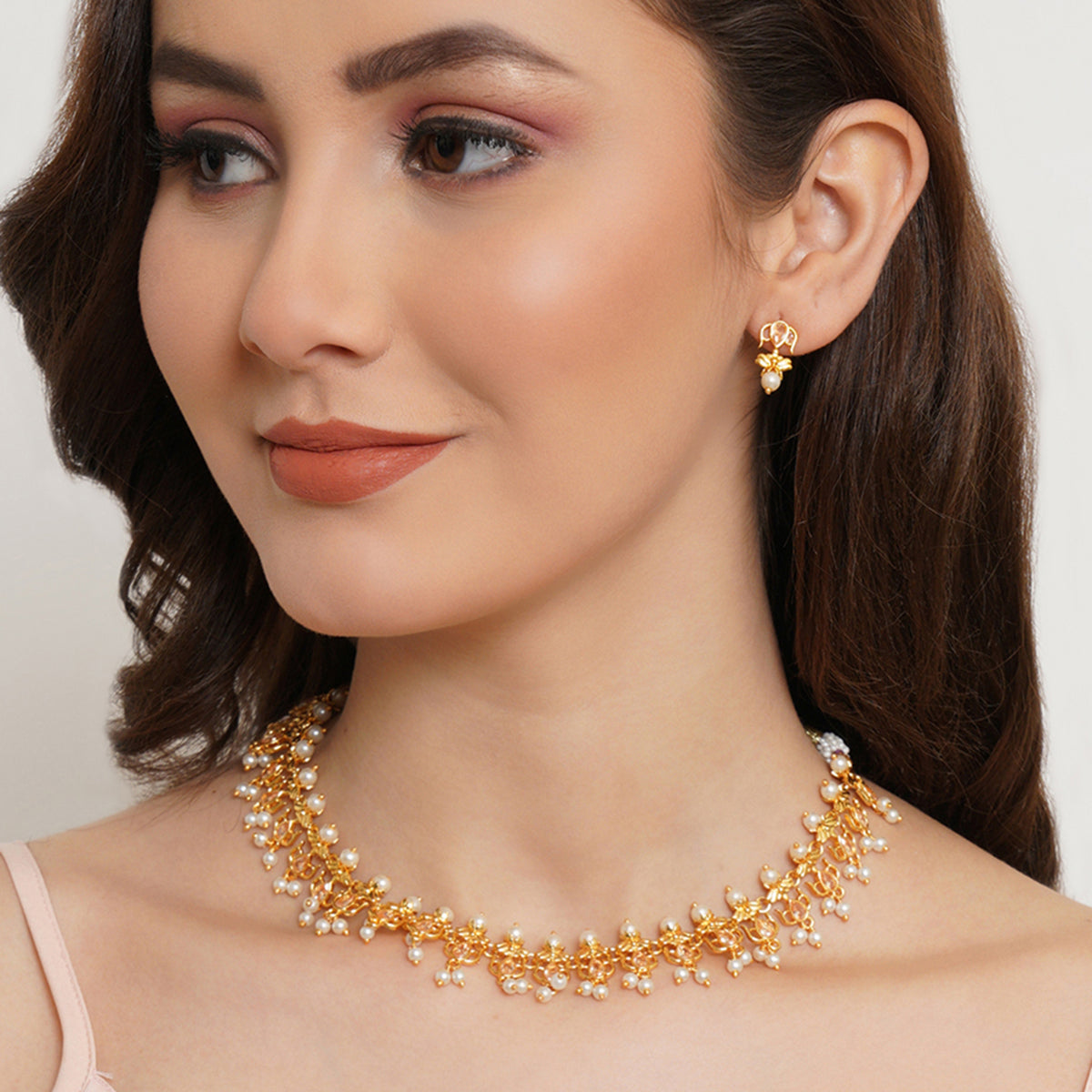Brass jewellery set fashioned into floral motifs and pearls embellished. Gold plated for added charm. Pair with a traditional saree.