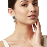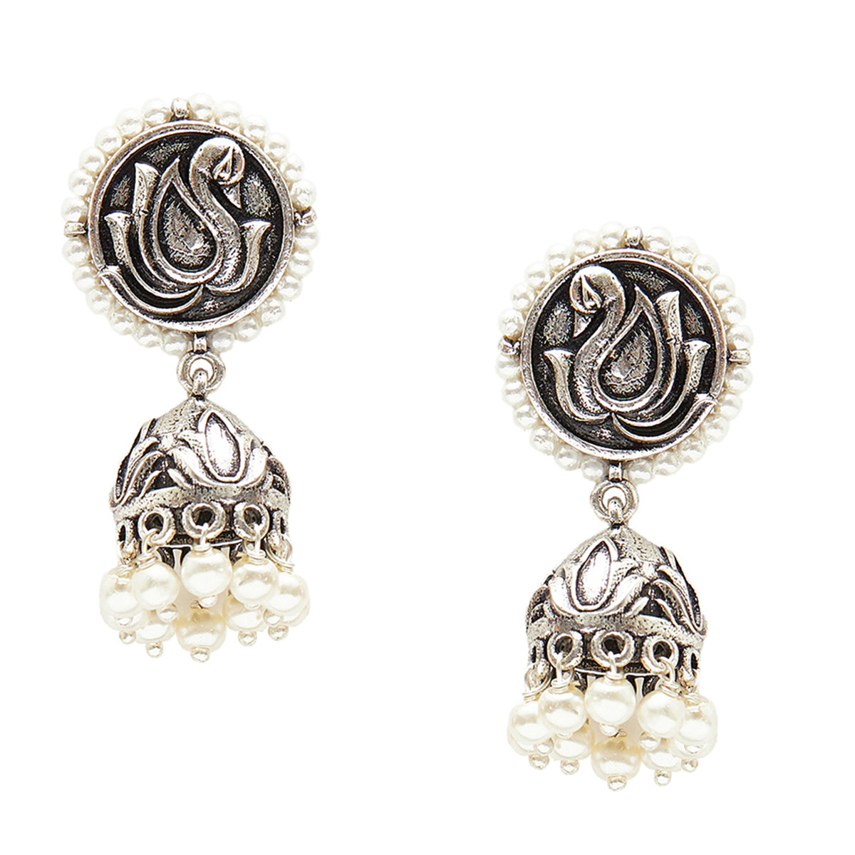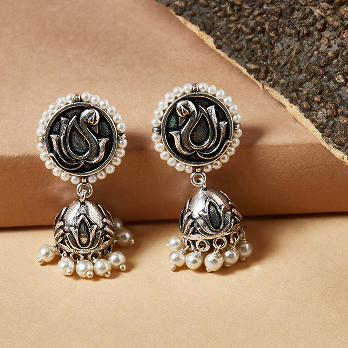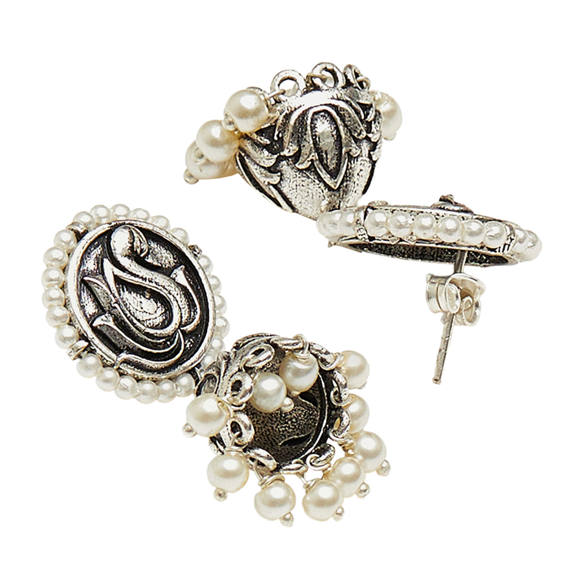 Apsara Peacock Motif Faux Pearls Adorned Brass Silver Toned Jhumka Earrings