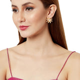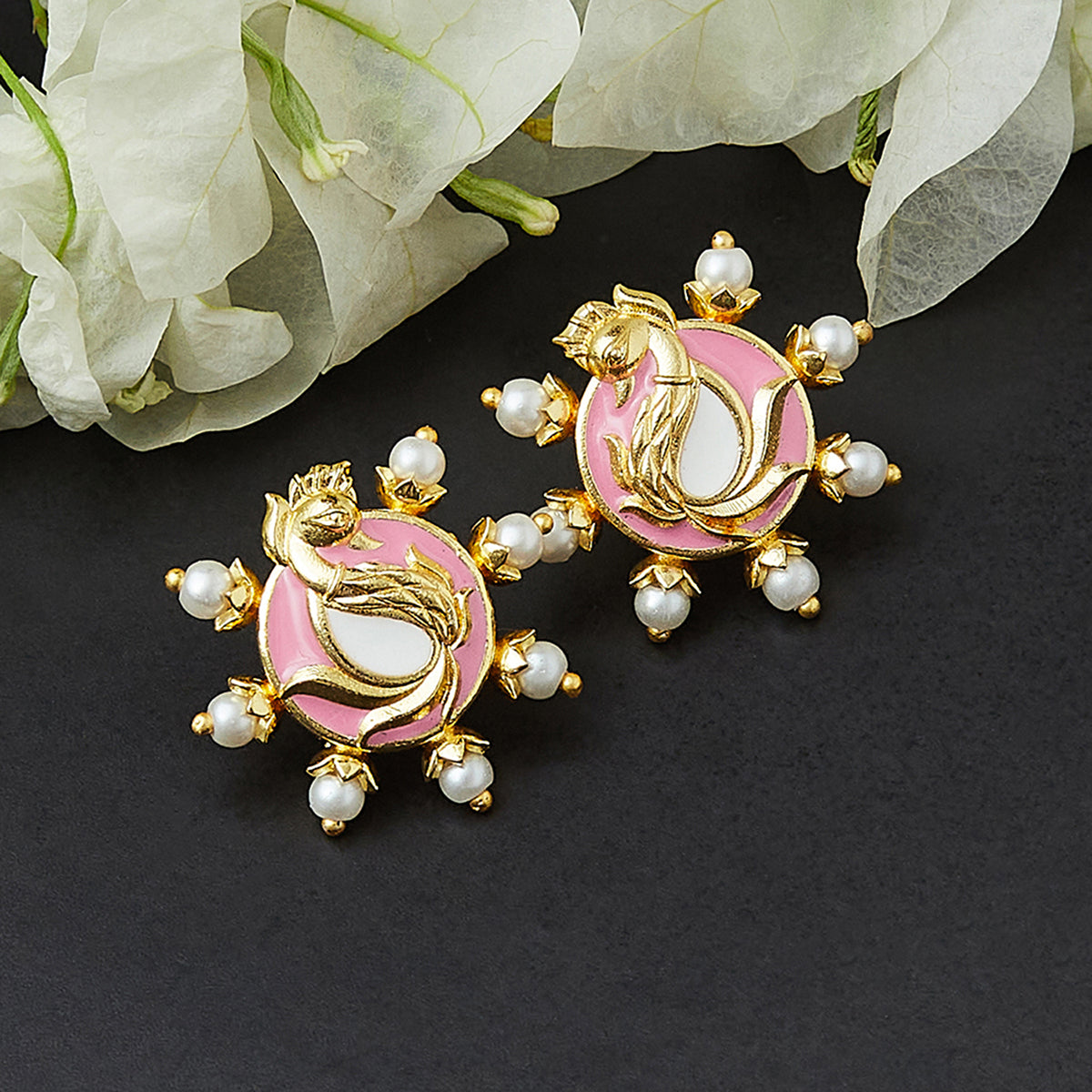 Lovely floral motifs adorned stud earrings, made from brass and yellow gold plated. Embellished with faux white pearls and featuring pink enamel details, the pair is lightweight and comfortable. Pair the earrings with a casual ethnic skirt, kurta and jeans outfit or even a traditional silk saree.