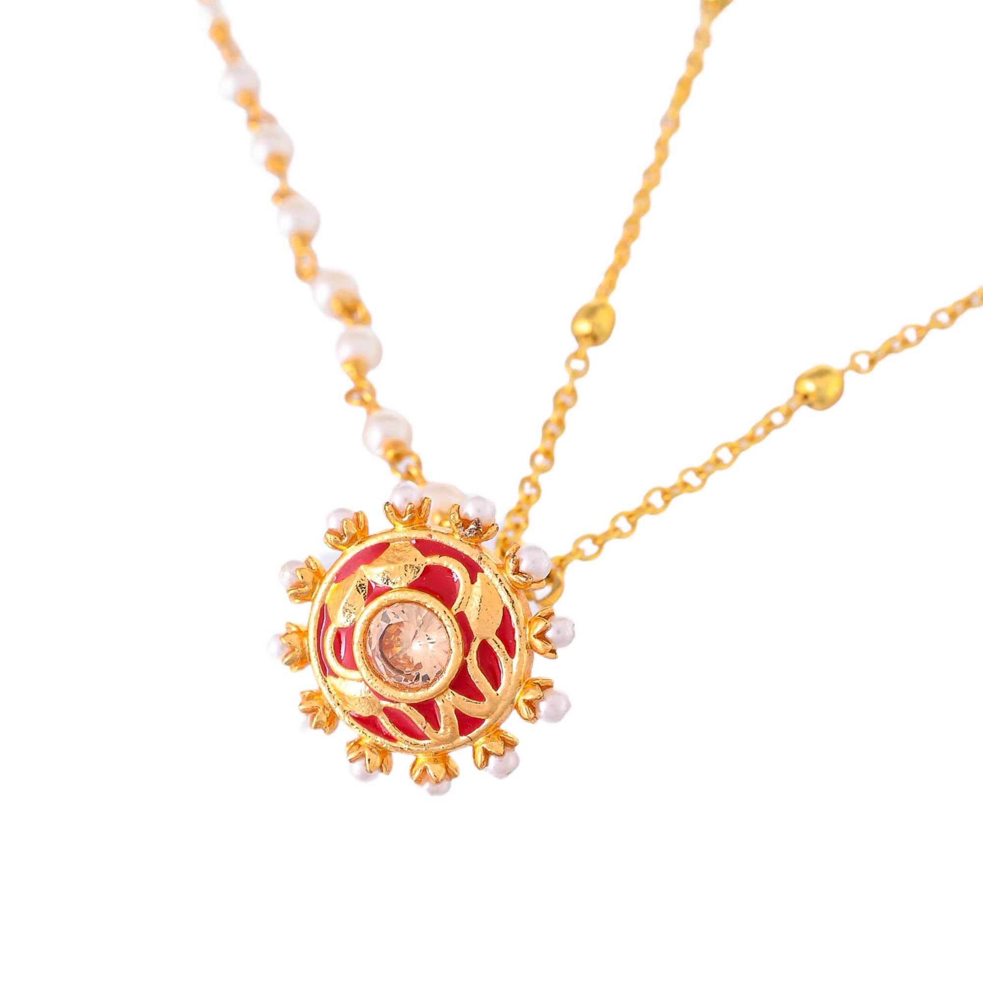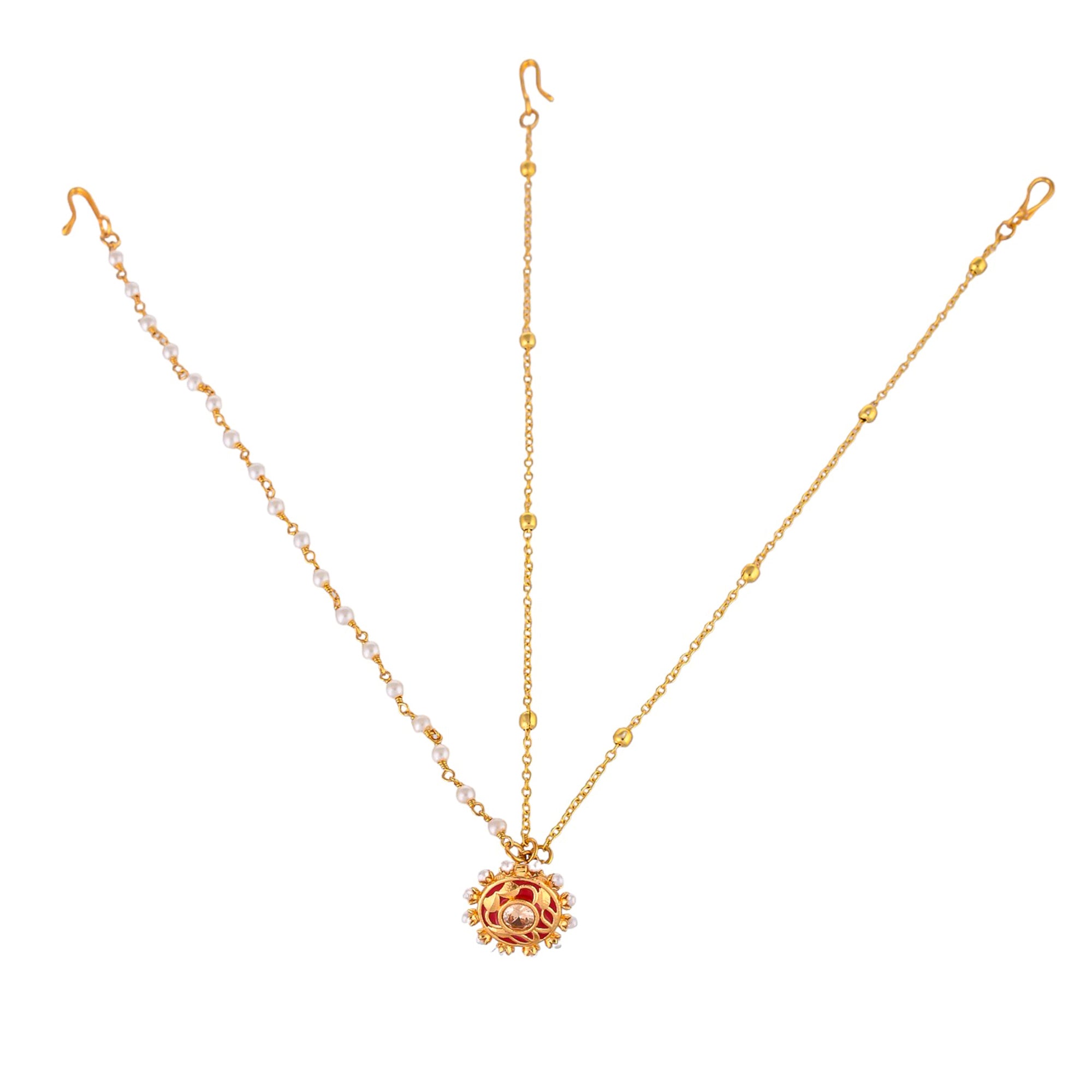 A matha patti style maang tika, in an ethnic inspired design, fashioned out of brass and enamelled. The yellow gold plated tika has been embellished with white faux pearls and is a lightweight and comfortable wear. Pair with formal ethnic and Indo-Western outfits.