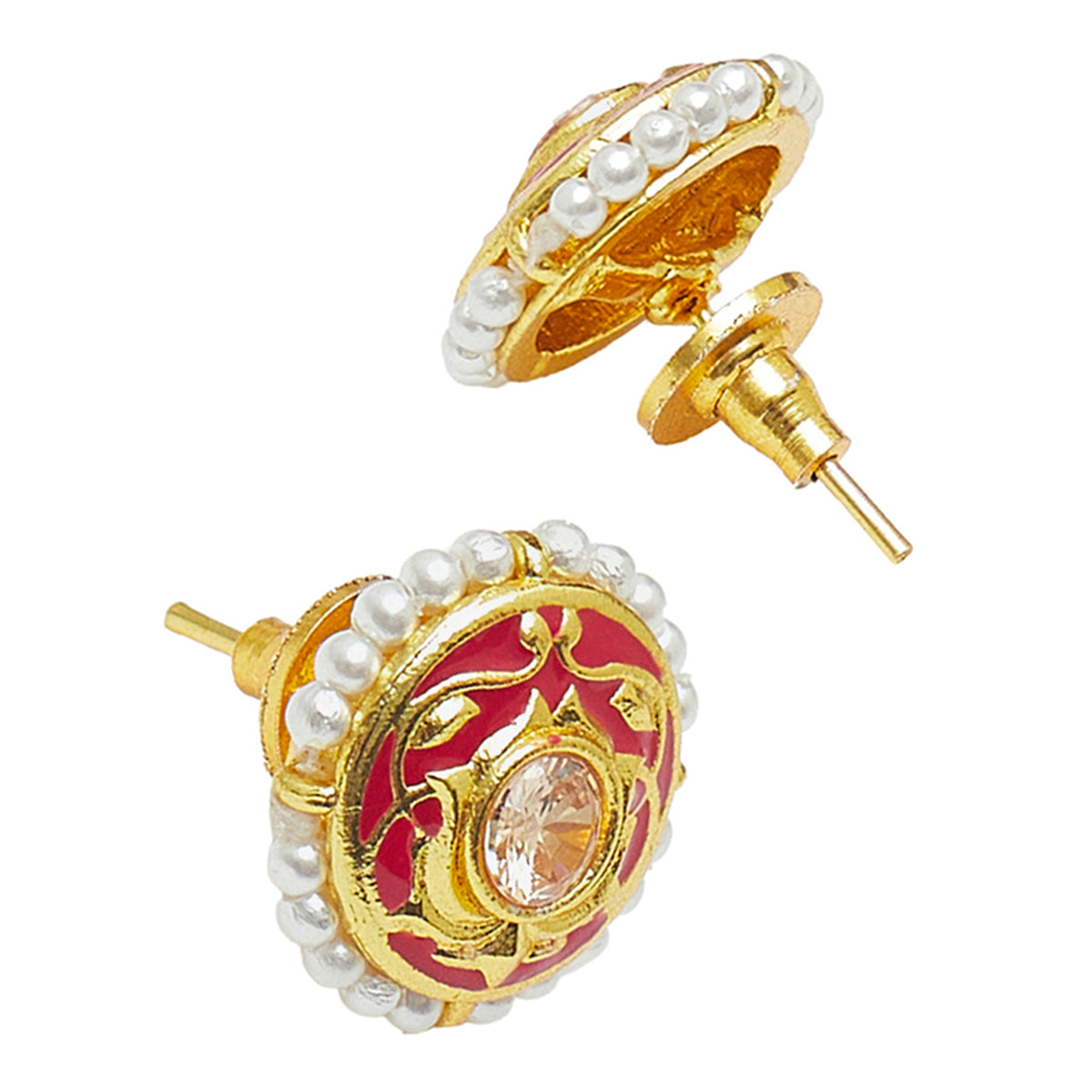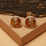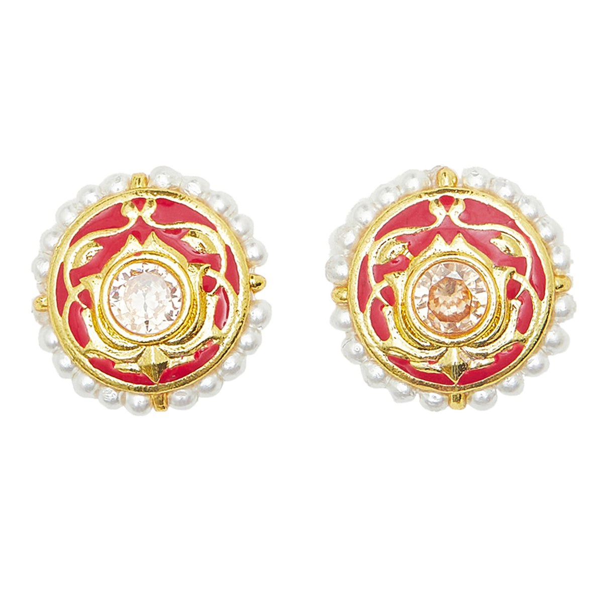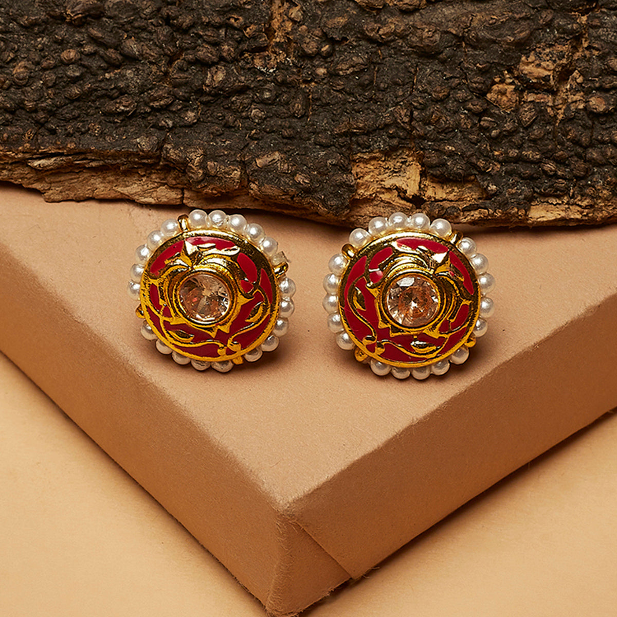 For the ones who like minimalistic and subtle jewellery, appearance but have a soft corner for blings at the same time, this is a must have pair of earrings for your jewellery collection. It comes with a ravishing red colour with golden hints and centrally placed silver zircon. This studd design is completely looks outstanding with the subtle boundary of pearls around.