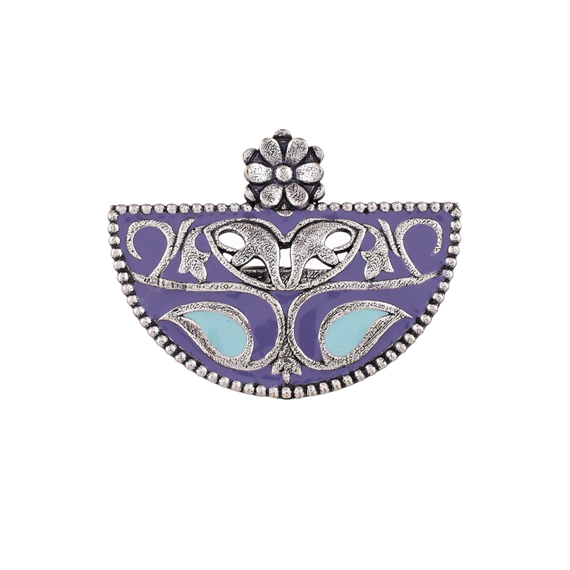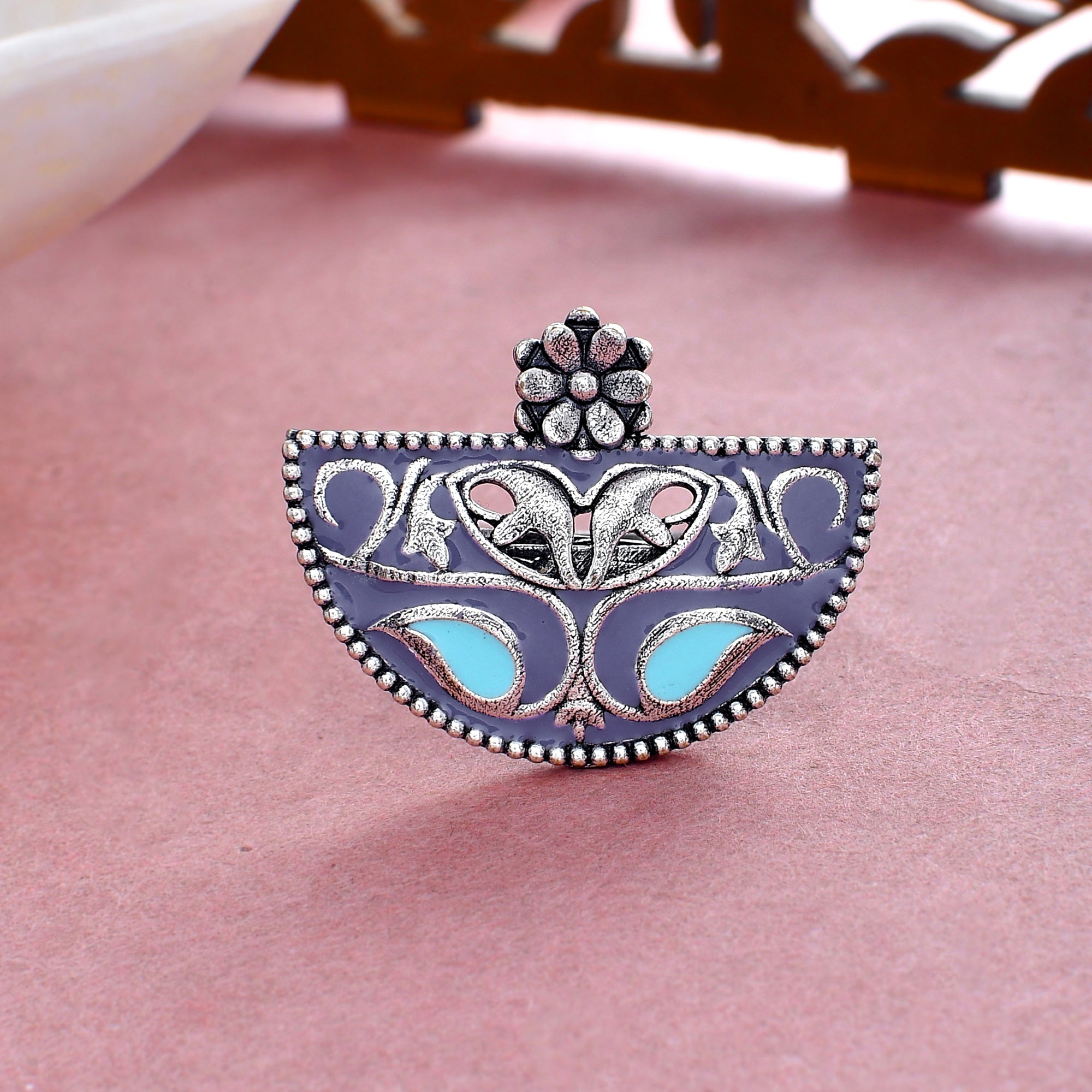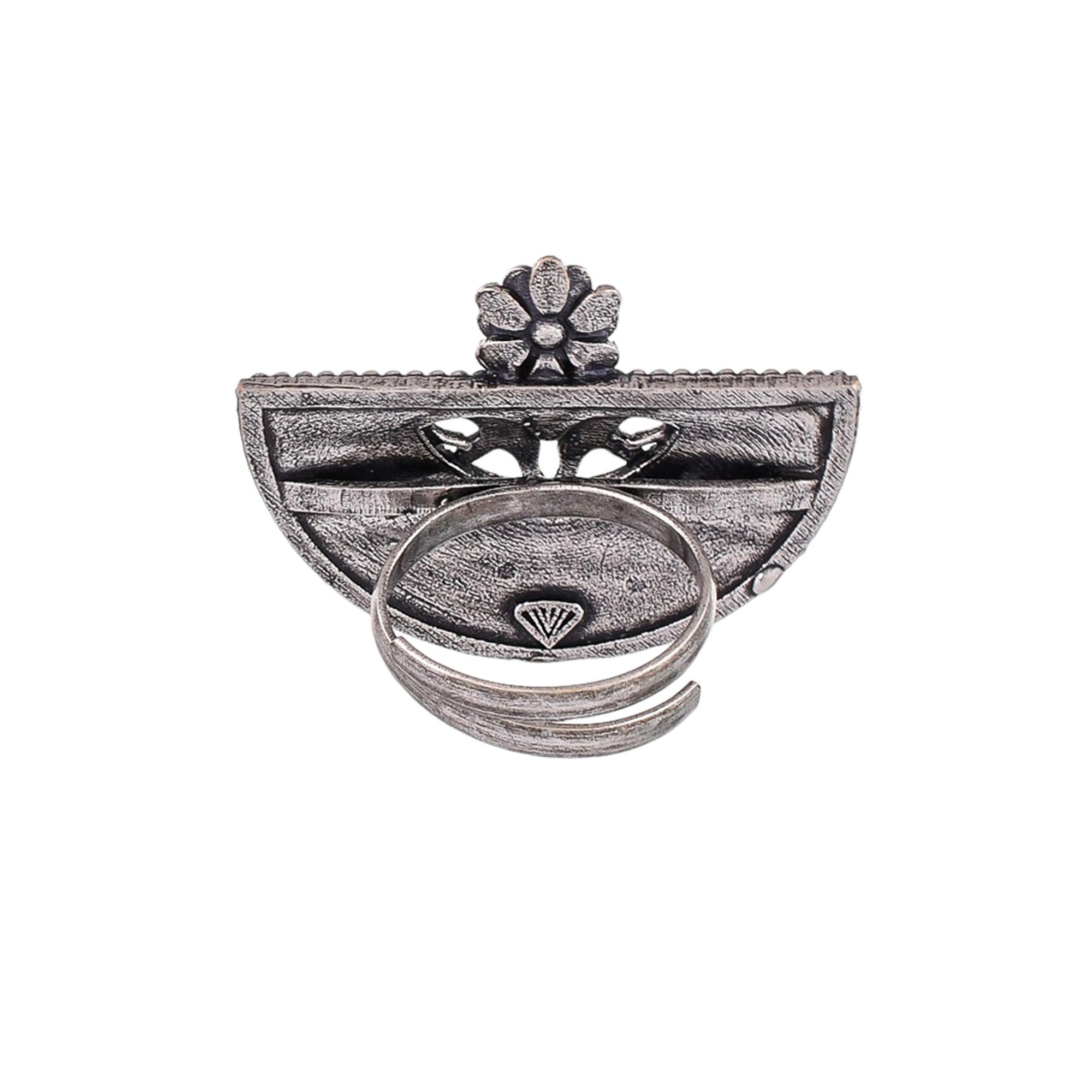 Featuring cutwork patterns, this enamelled finger ring has been made from high quality brass. Oxidised plating adds to its rustic charm. The adjustable ring has been lightly embellished and can be paired with Indo-Western and Bohemian looks.