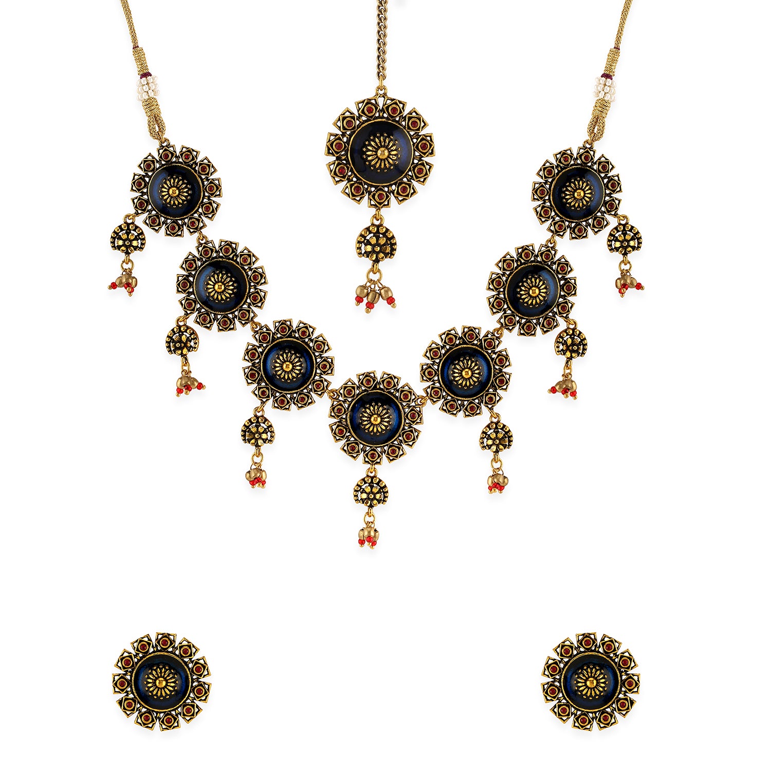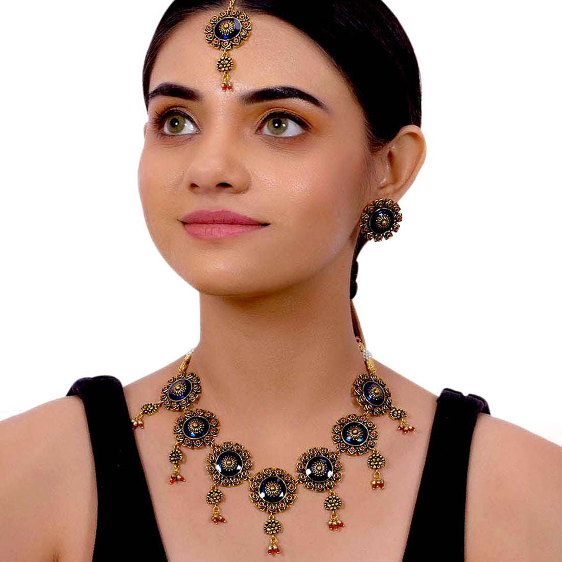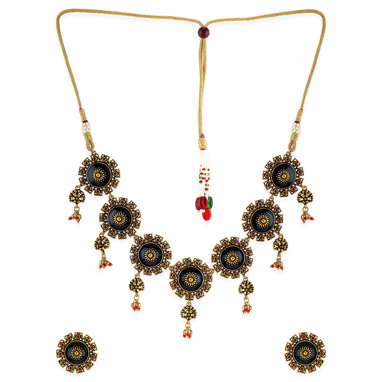 The Arabian Nights Round Brass Necklace with Antique Gold Plating in Brass Material with genuine gems is the best thing that could happen to you. This piece gives you the confidence that you were looking for to walk into any party and make people take notice of you. Get this one in silver now and add this to your wardrobe.