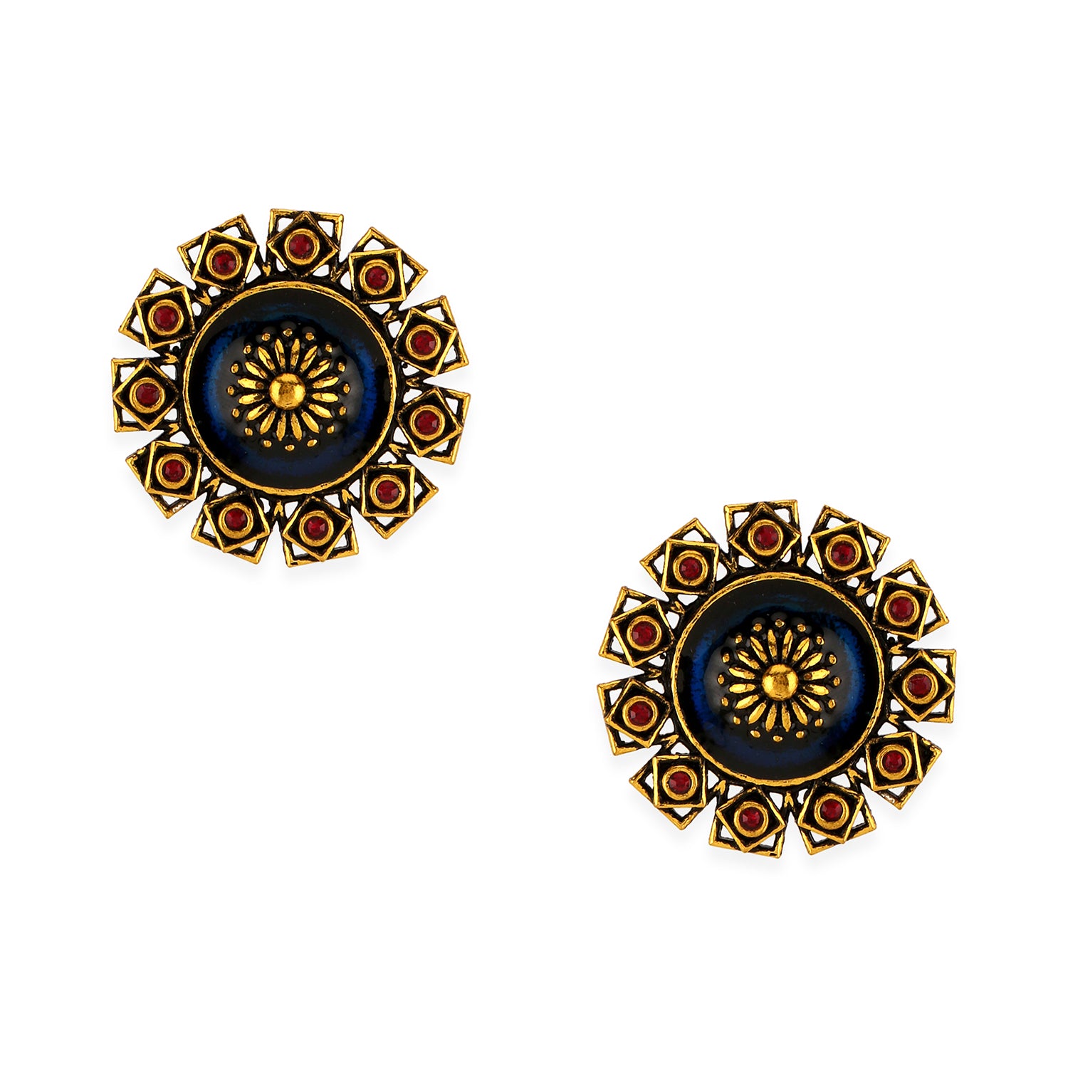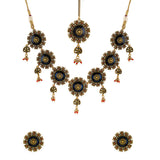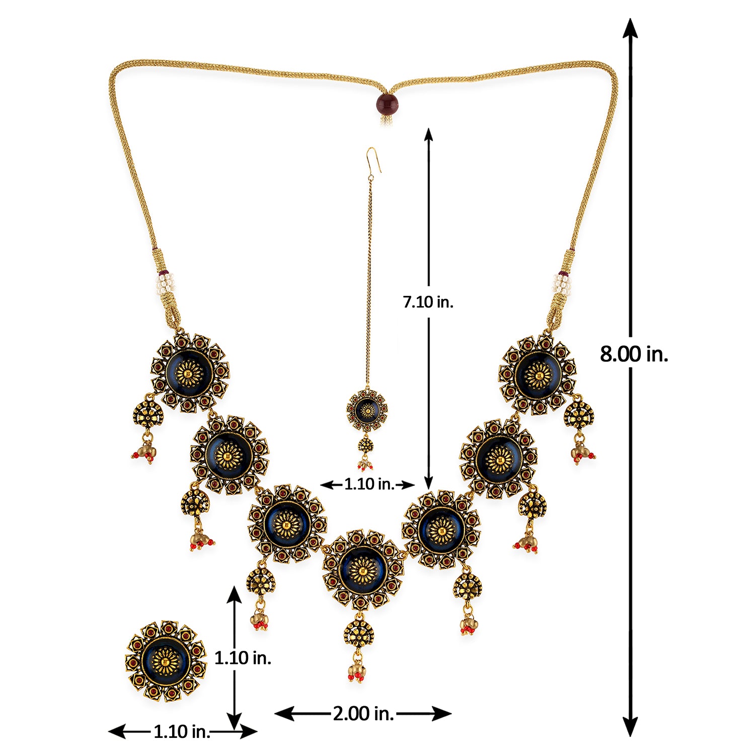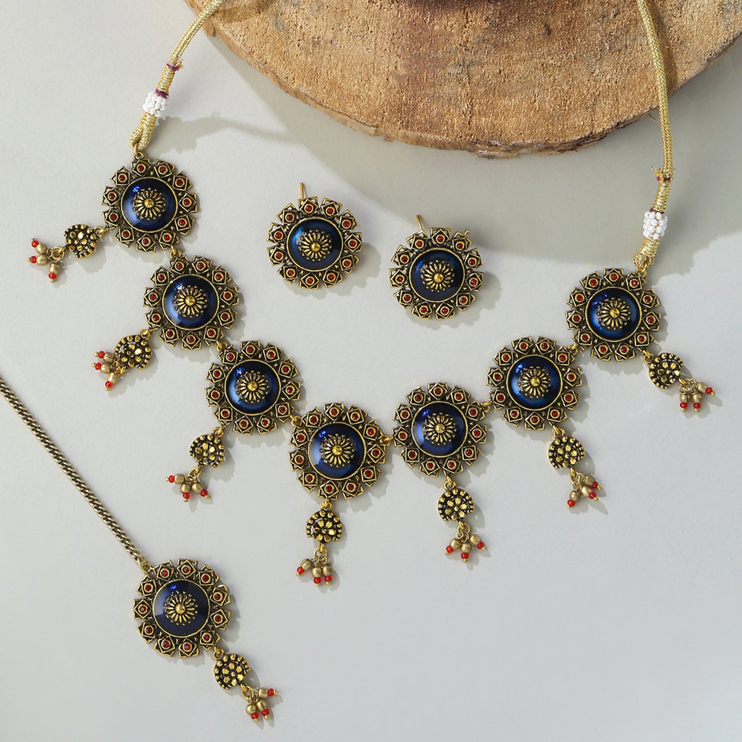 The Arabian Nights Round Brass Necklace with Antique Gold Plating in Brass Material with genuine gems is the best thing that could happen to you. This piece gives you the confidence that you were looking for to walk into any party and make people take notice of you. Get this one in silver now and add this to your wardrobe.