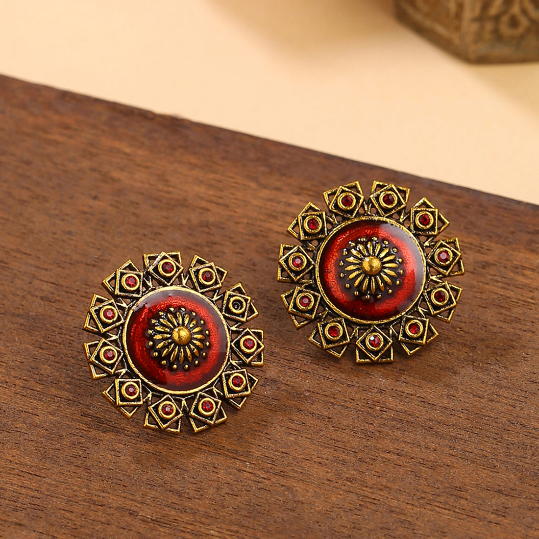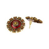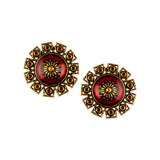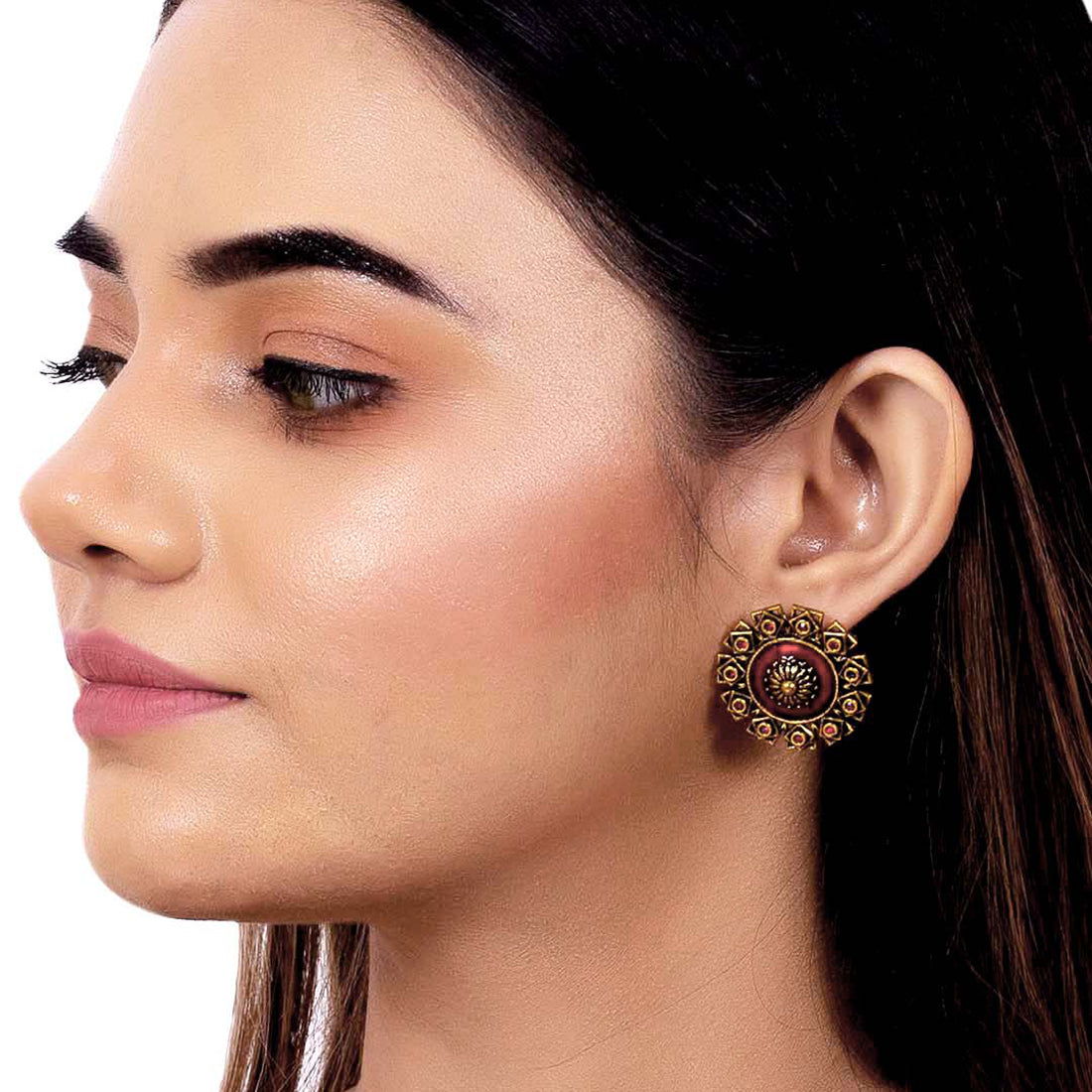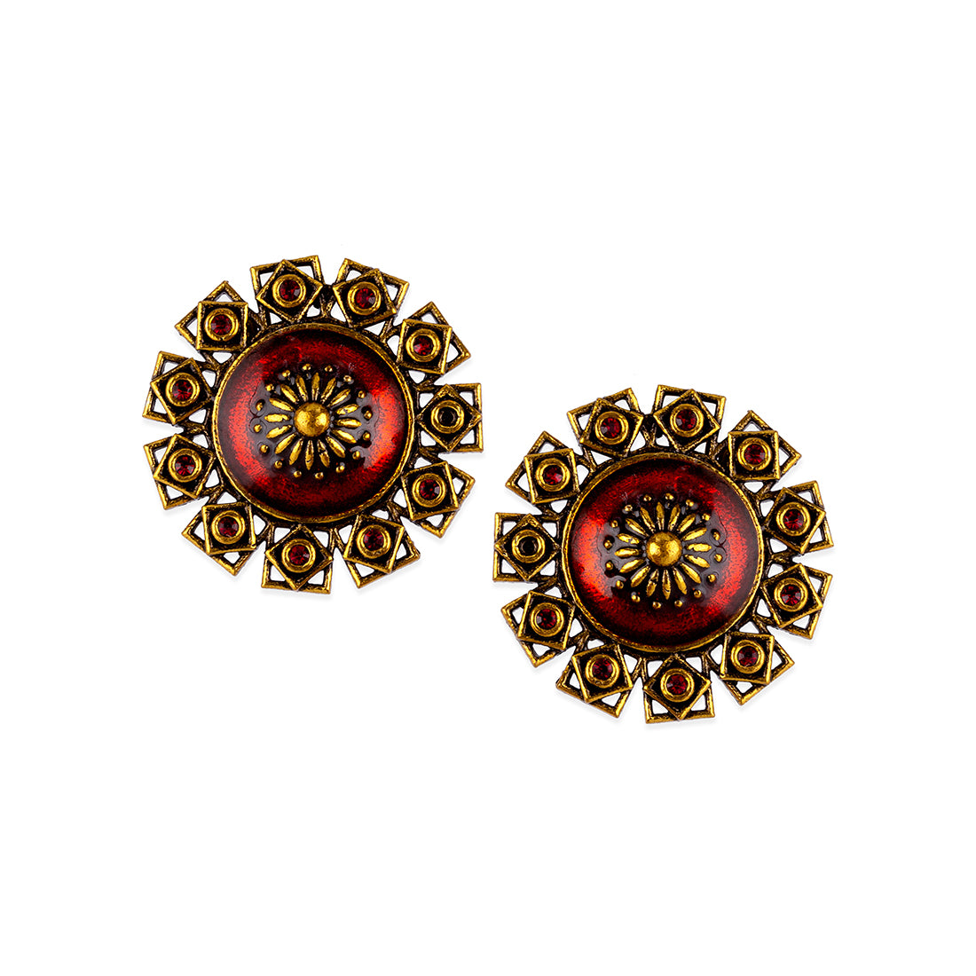Arabian Nights Brass ear-rings with Antique gold plating in Brass material With royal designs makes it very contemporary and makes it fit for your boho-chic days. Turn up in style to any occasion with this accessory adorned on your wrist. Get this piece in red and gold and amp up our style quotient.