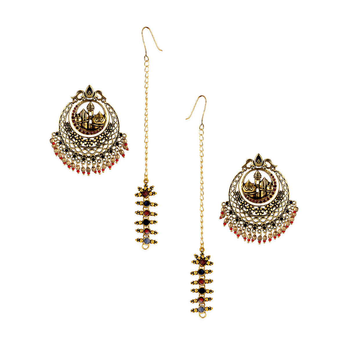 Get your hands on this antique necklace set with complete festive vibes. It features a crescent moon design with the embellishment o stones and ghungroos. The antique gold polish gives it a rich and royal look. This will be your go to jewelry piece when you want to feel special and feminine.