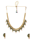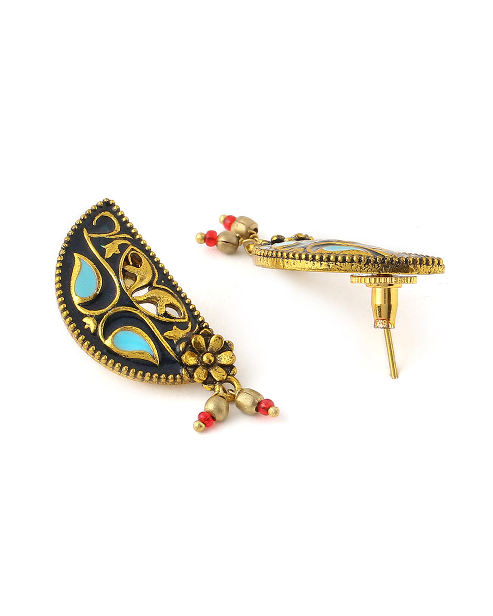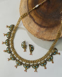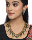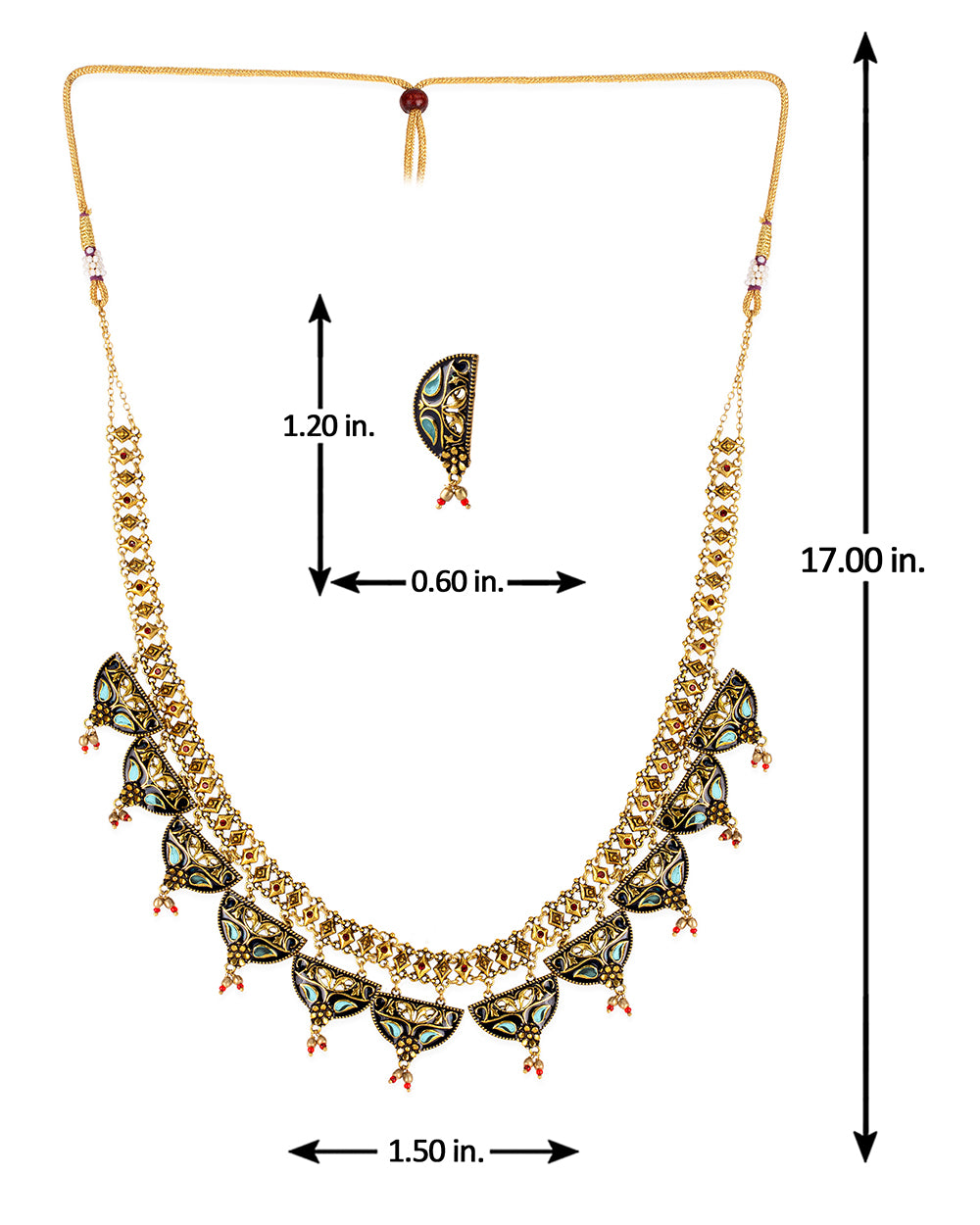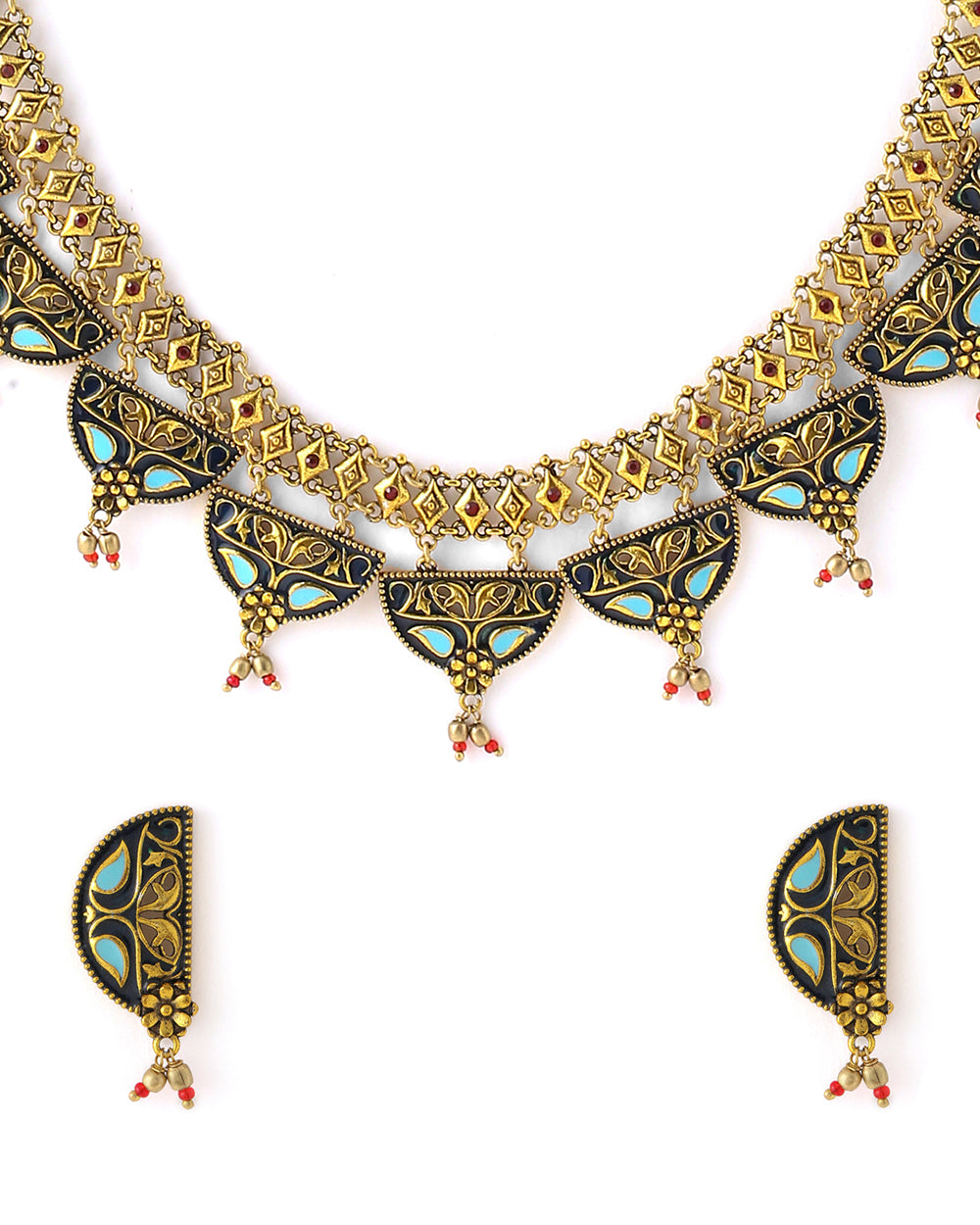 Featuring a charming antique gold plating, this tribal inspired jewellery set has been fashioned out of brass. Enamelled and lightly embellished, the necklace and matching earrings are lightweight and comfortable. Pair the set with your favourite casual saree or even a jeans and kurta ensemble.