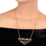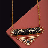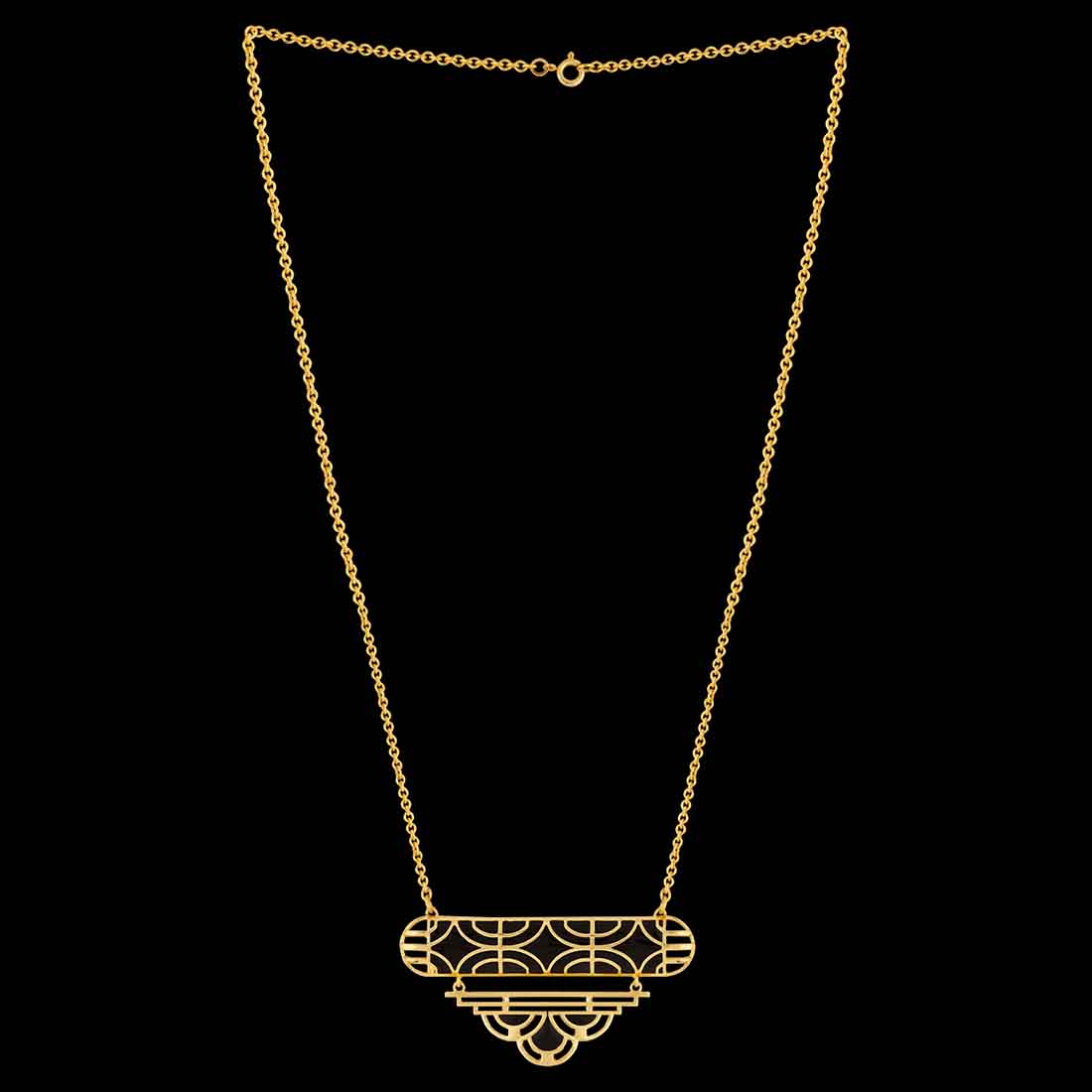 Filigree pattern necklace, inspired by the bold, striped surfaces interior decoration trend. Made from brass and yellow gold plated. Wear with party outfits.