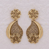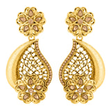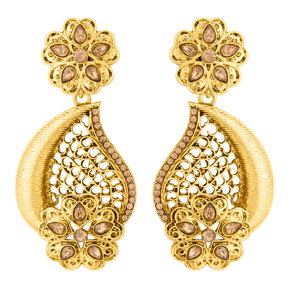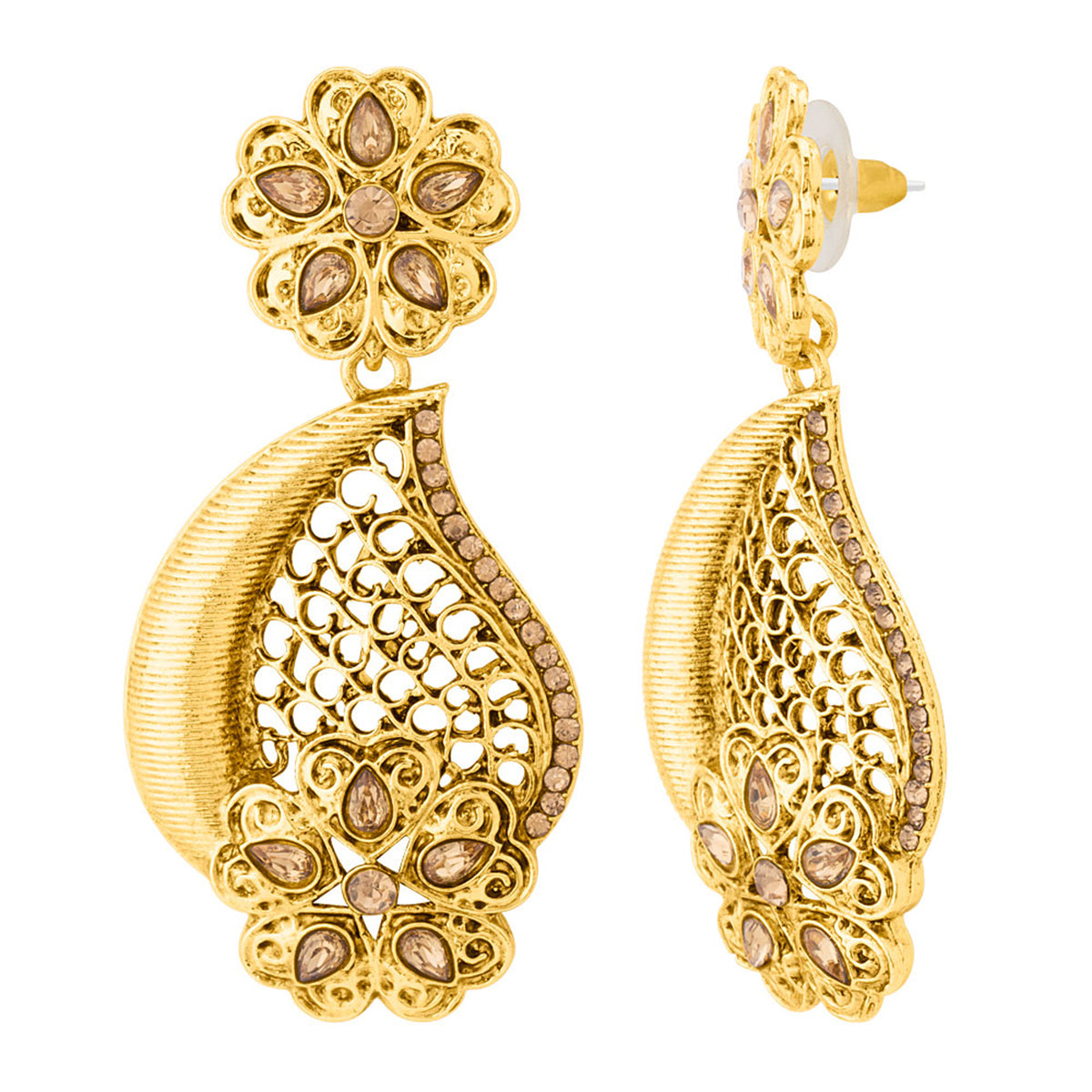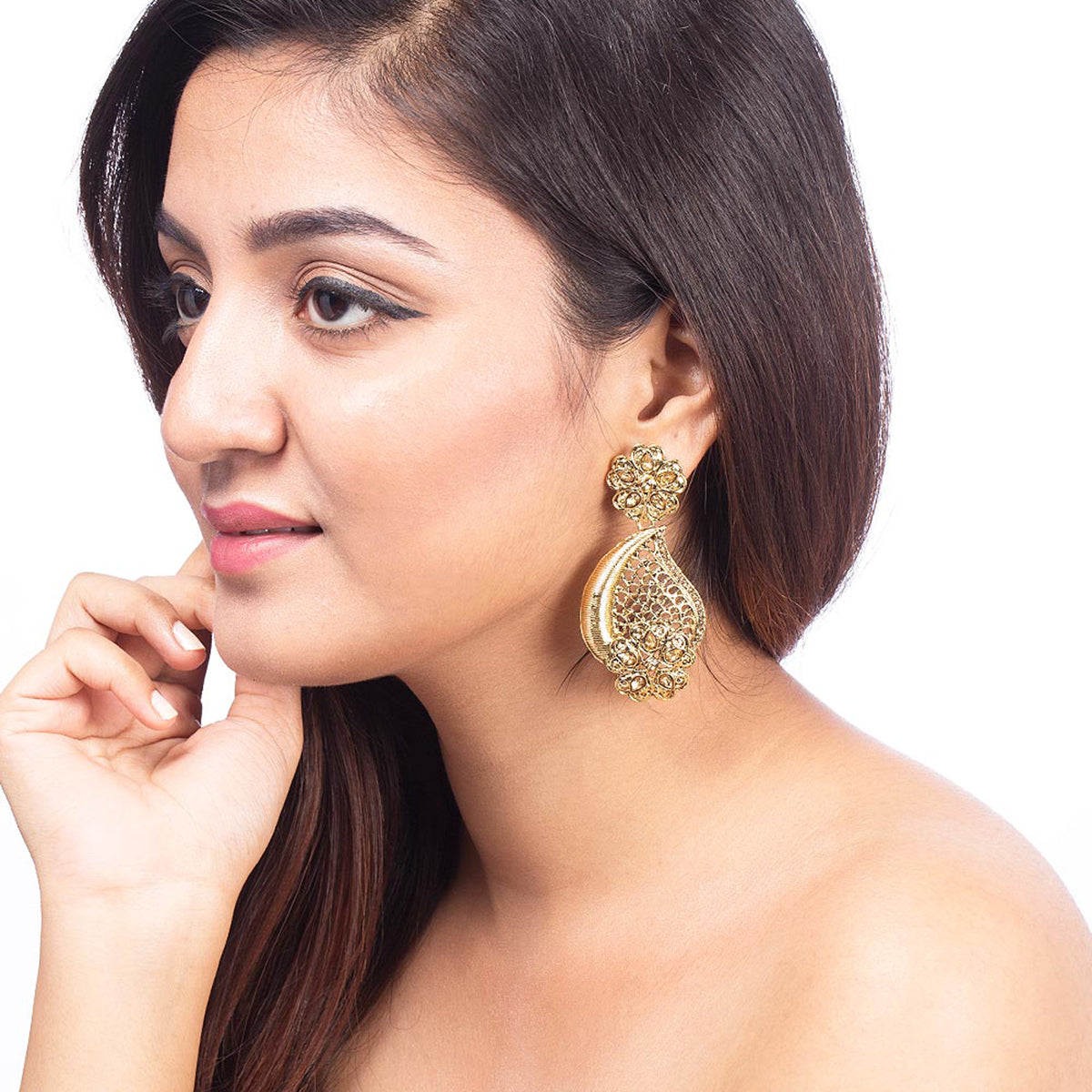 "Look like a princess with these sparkling paisley danglers from the house of Voylla. Crafted from alloy and graced with attractive floral motifs, these artistic earrings have faux stone embellishment over a striking gold plating. They will look splendid with ethnic and fusion outfits alike.