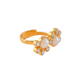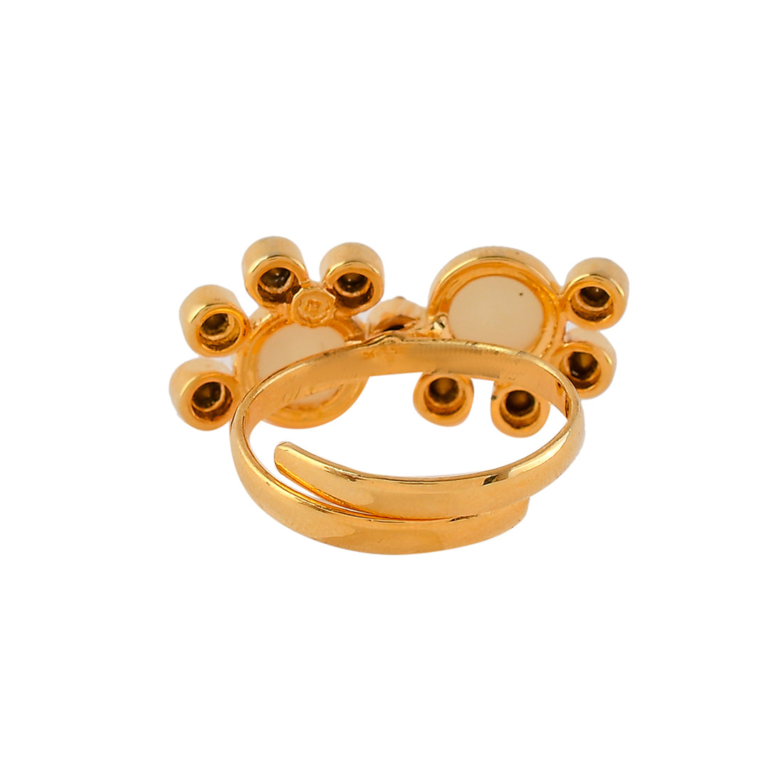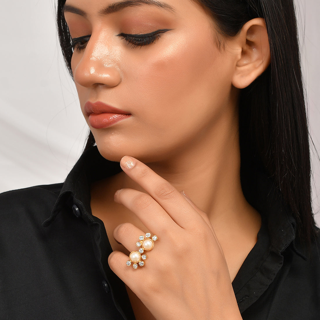 This beautiful statement ring from our Mothers Day Collection is the perfect way to show your love and appreciation to your mother. The ring features a classic design with half pearl and CZ studded detailing, crafted in brass and plated with yellow gold. The CZ stones add a beautiful sparkle to the ring, making it a great addition to any jewelry collection. This ring is perfect for dressing up any outfit and is sure to become a cherished keepsake for years to come. The comfortable and sturdy band ensures that the ring can be worn daily with ease, and the exquisite craftsmanship makes it a true work of art