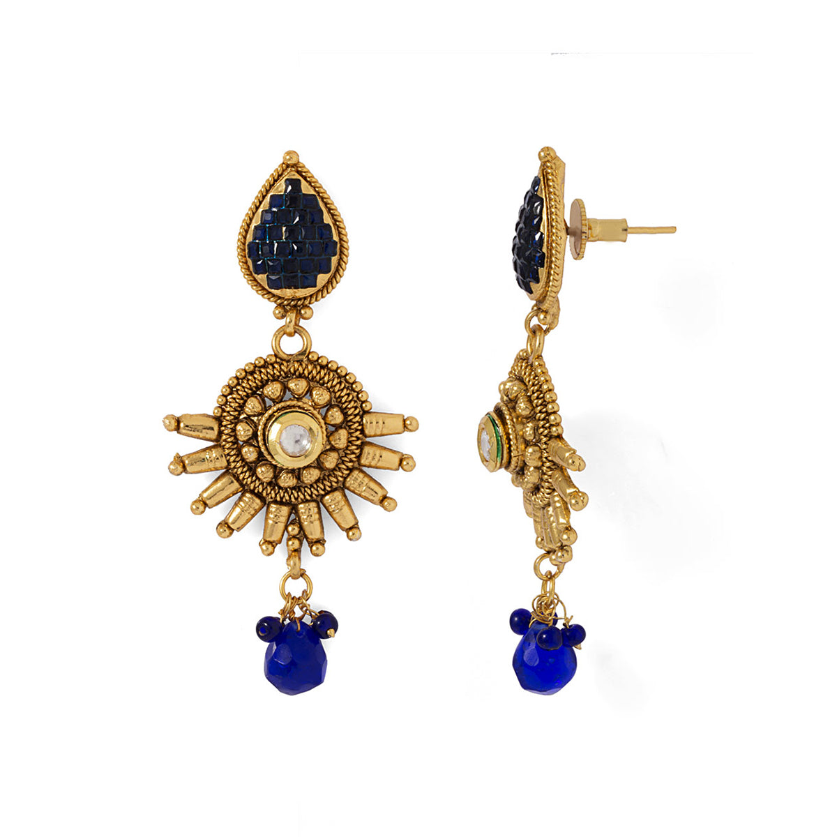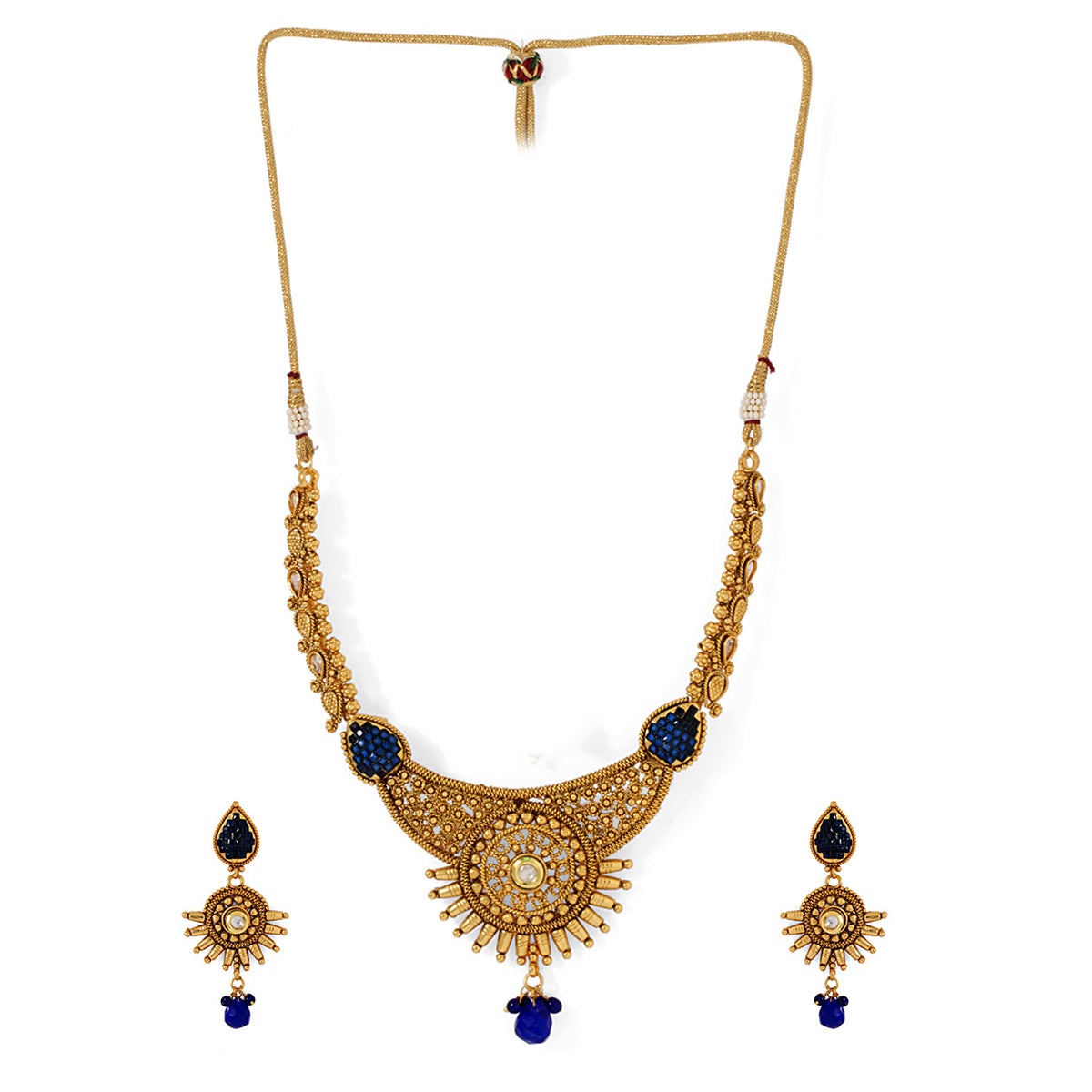 Showcasing attractiveness, this traditional maang tika set features embellishment dazzling kundan and blue stones that provides it an gleaming look. For an added luster, this ring is polished with lustrous gold tone. This piece of jewelry comes with the Voylla assurance of quality and durability.