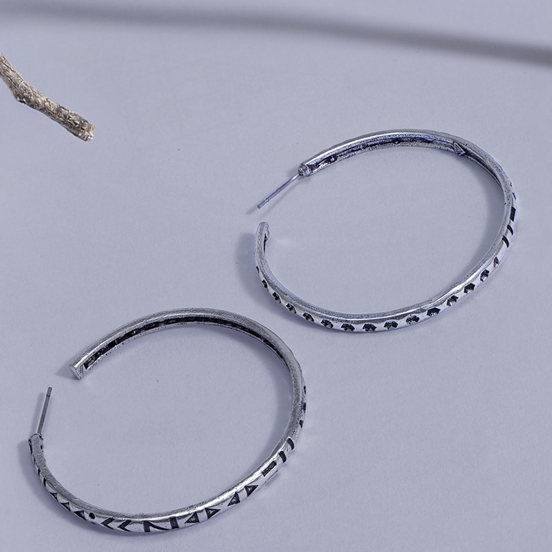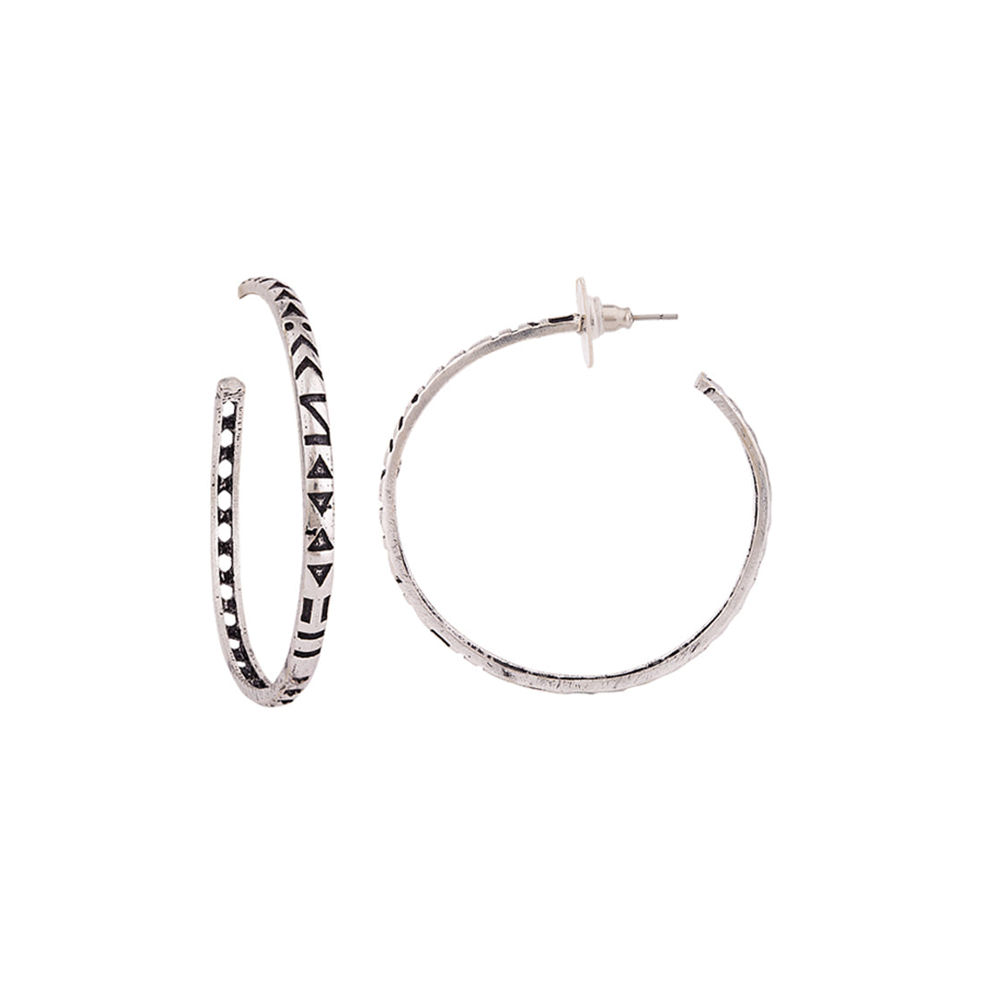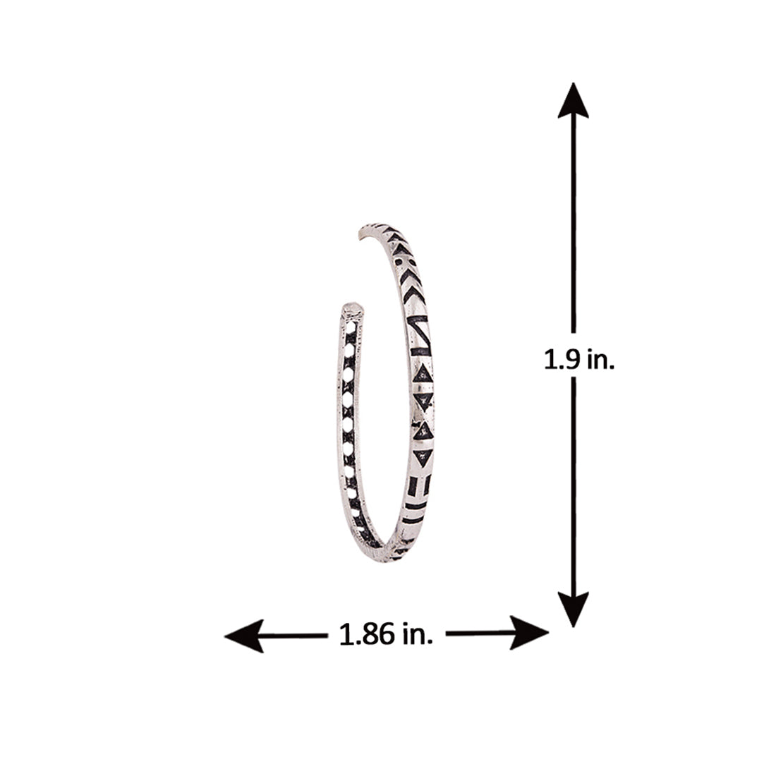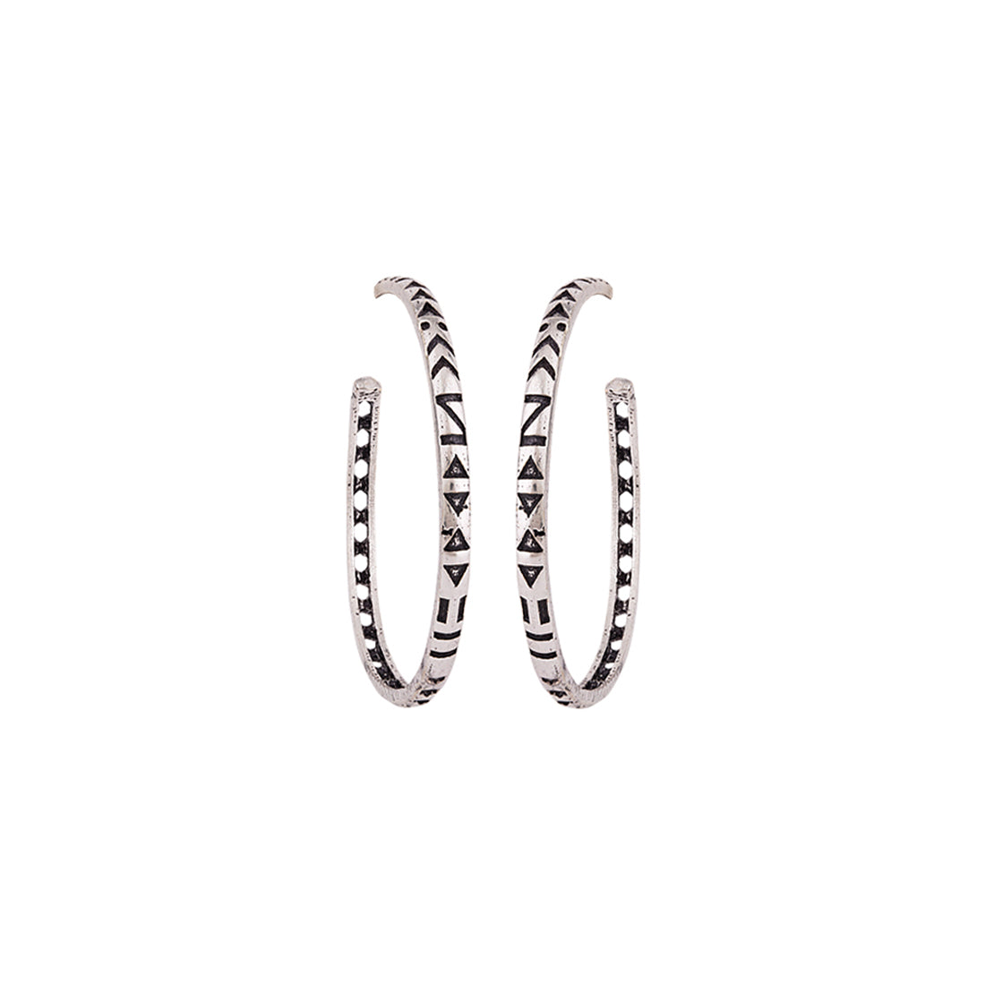 Hoop style earrings featuring a cutwork design. Made from brass and oxidised silver plated. Pair with casual attire. This piece of jewelry comes with the Voylla assurance of quality and durability.