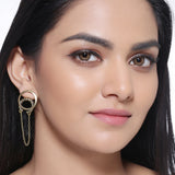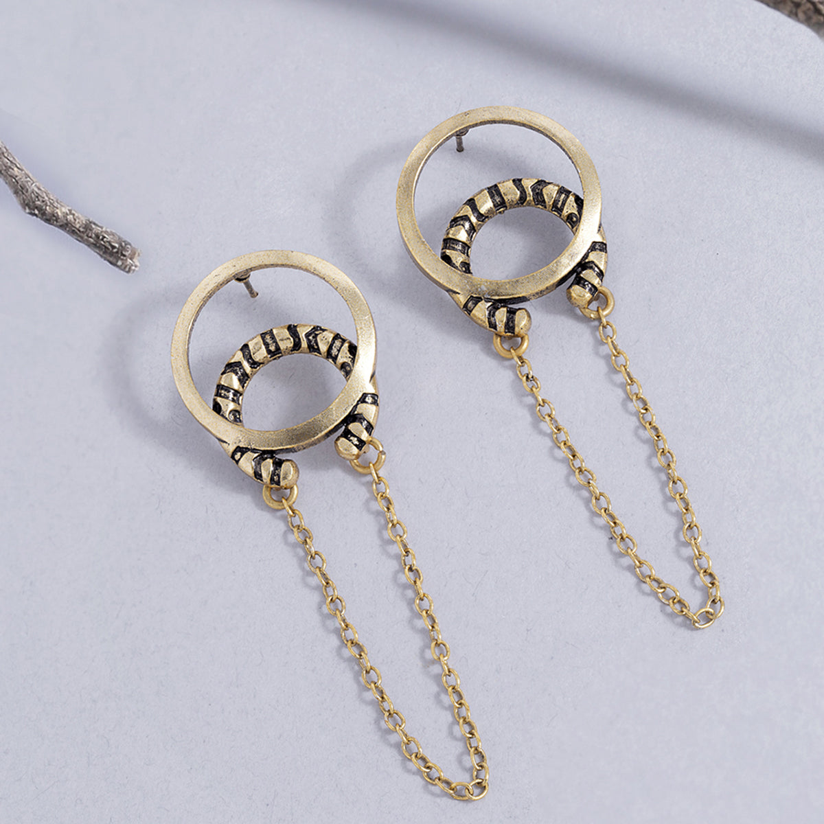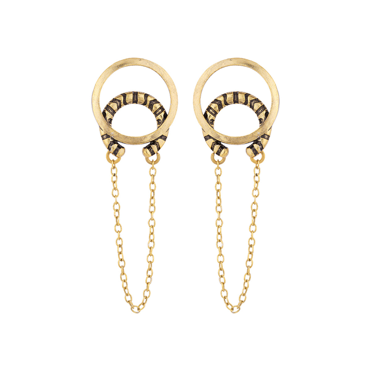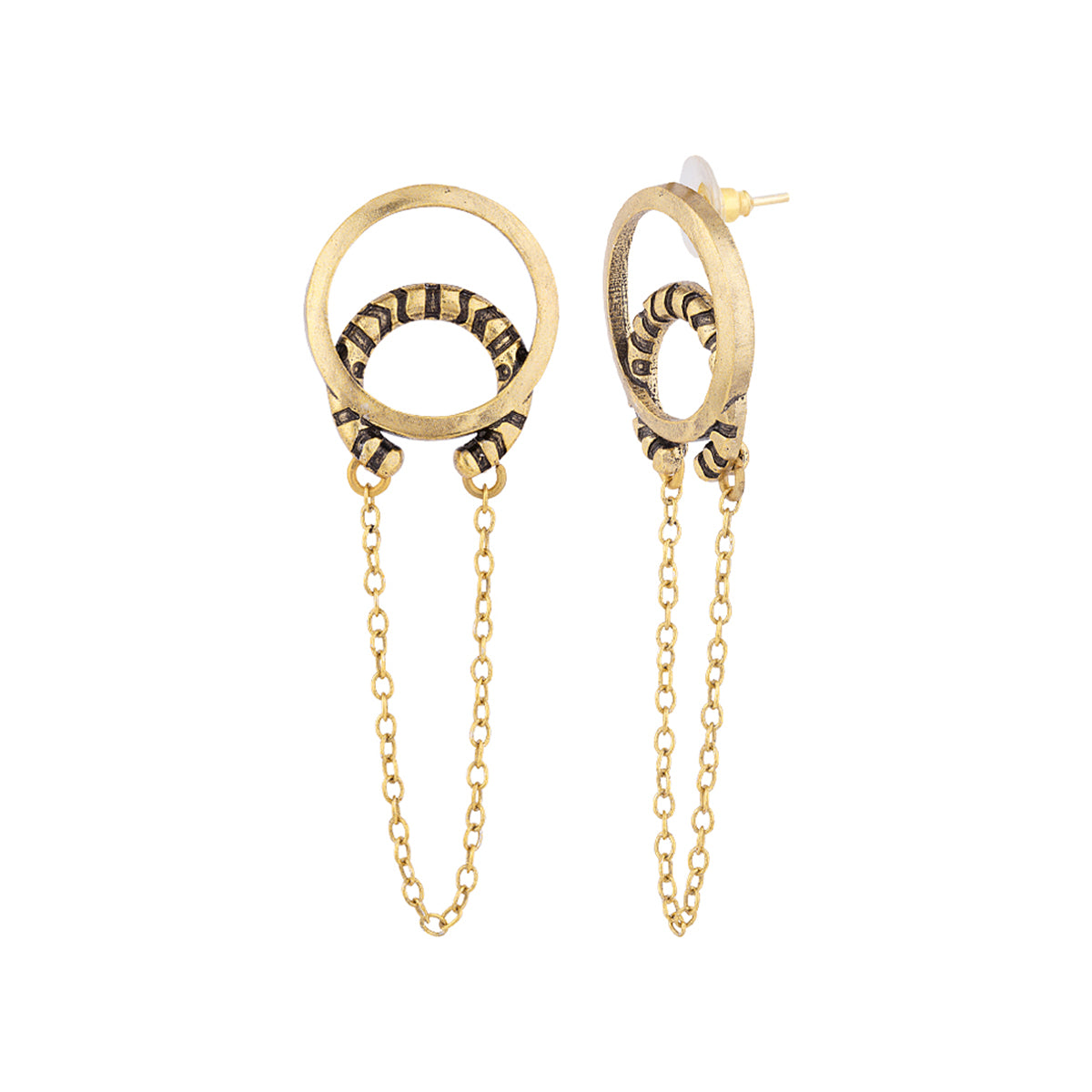 Layered drop style earrings with textured surface. Made from brass and oxidised gold plated. Wear with a formal dress. This piece of jewelry comes with the Voylla assurance of quality and durability.