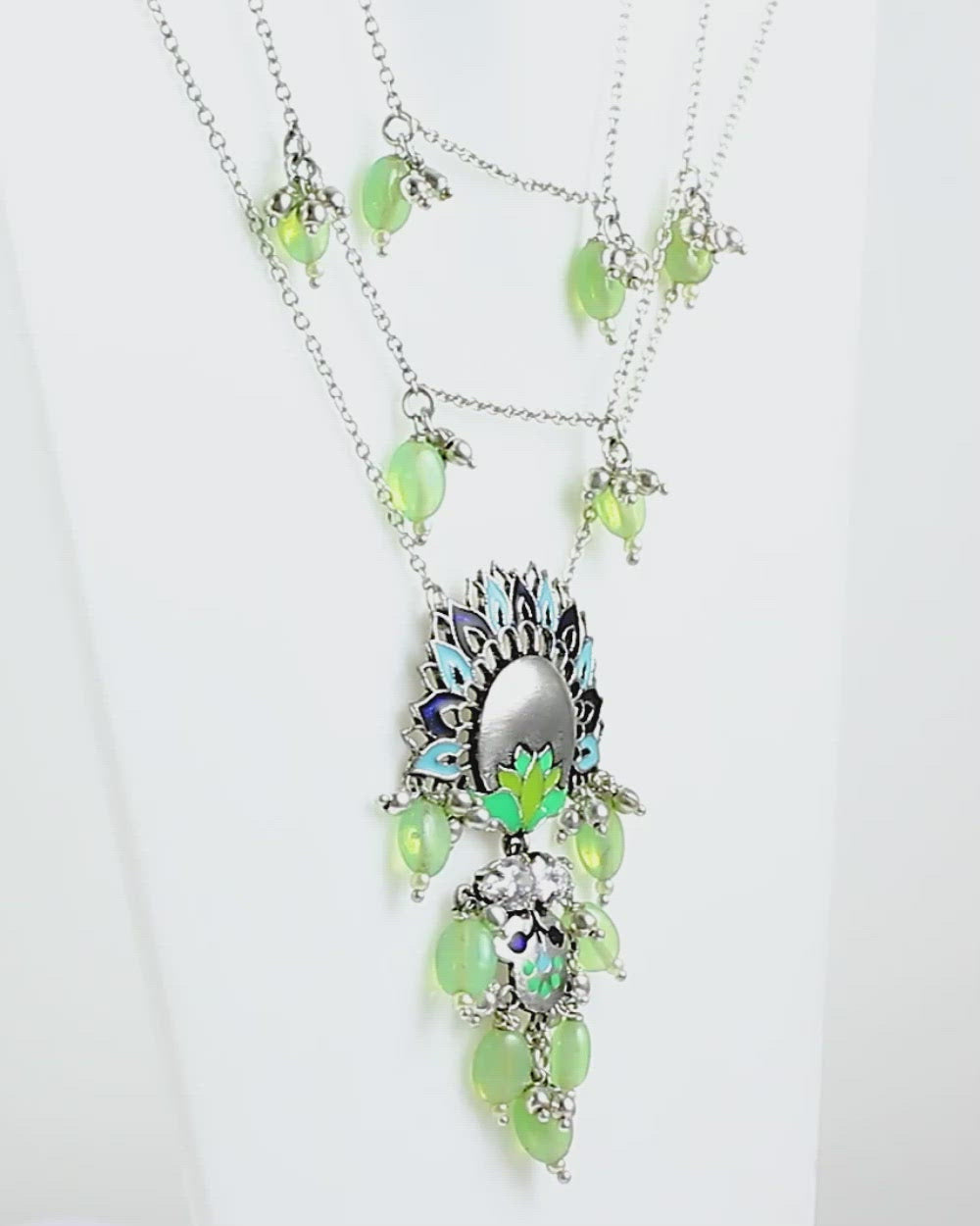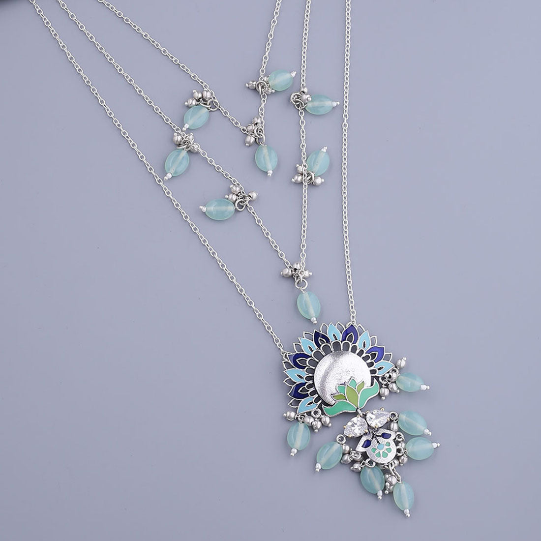 Hand made brass floral motifs necklace inspired by the craft of Jaipuri block printing. Adroned with mint green & mustard beads. Perfect beach wear. Weight (Gms): 21.31Size (LxW)(Inch): 30.25*3.25Material: BrassPlating: Silver PlatingColor: SilverSales Package: 1 NecklaceProduct Code: 8907617929361