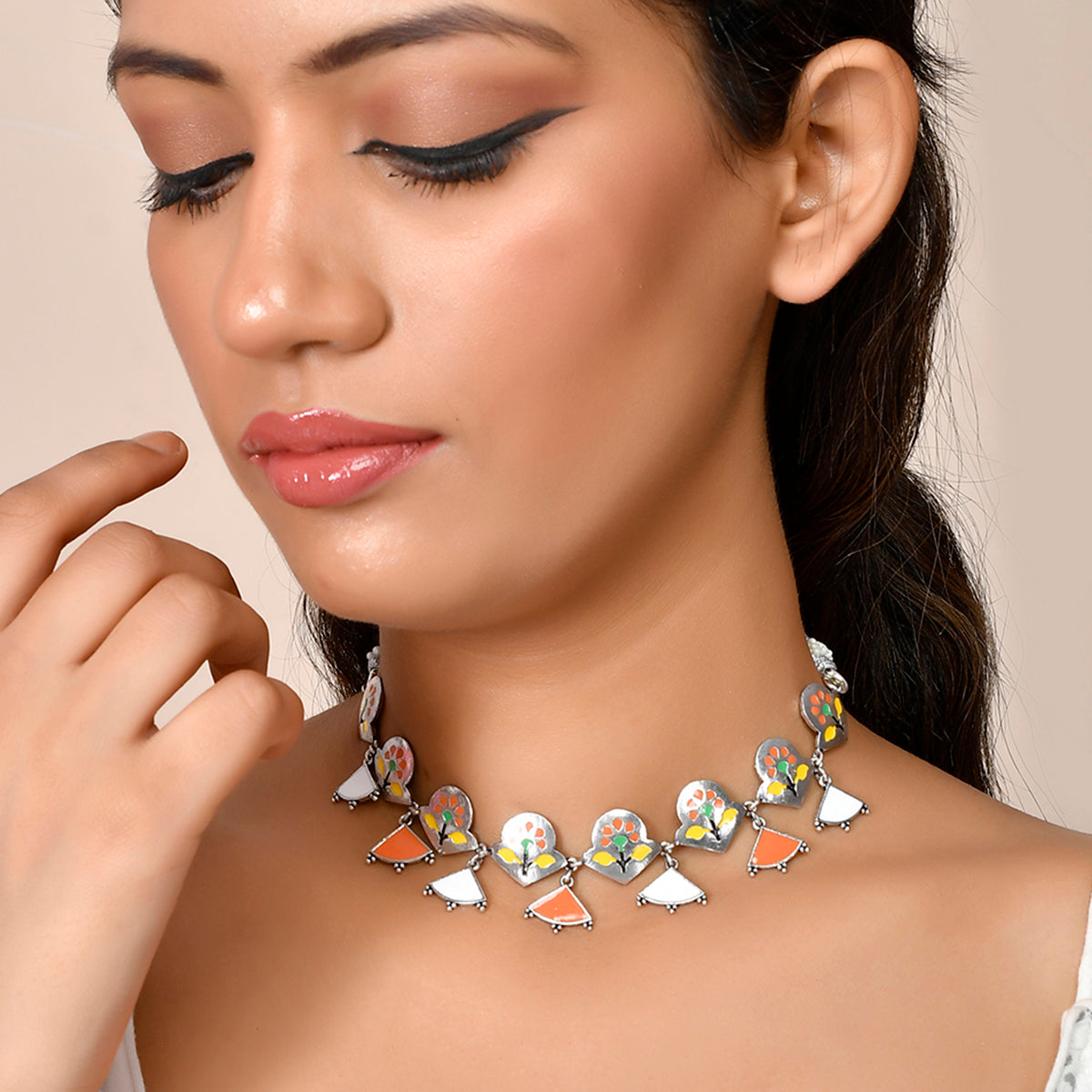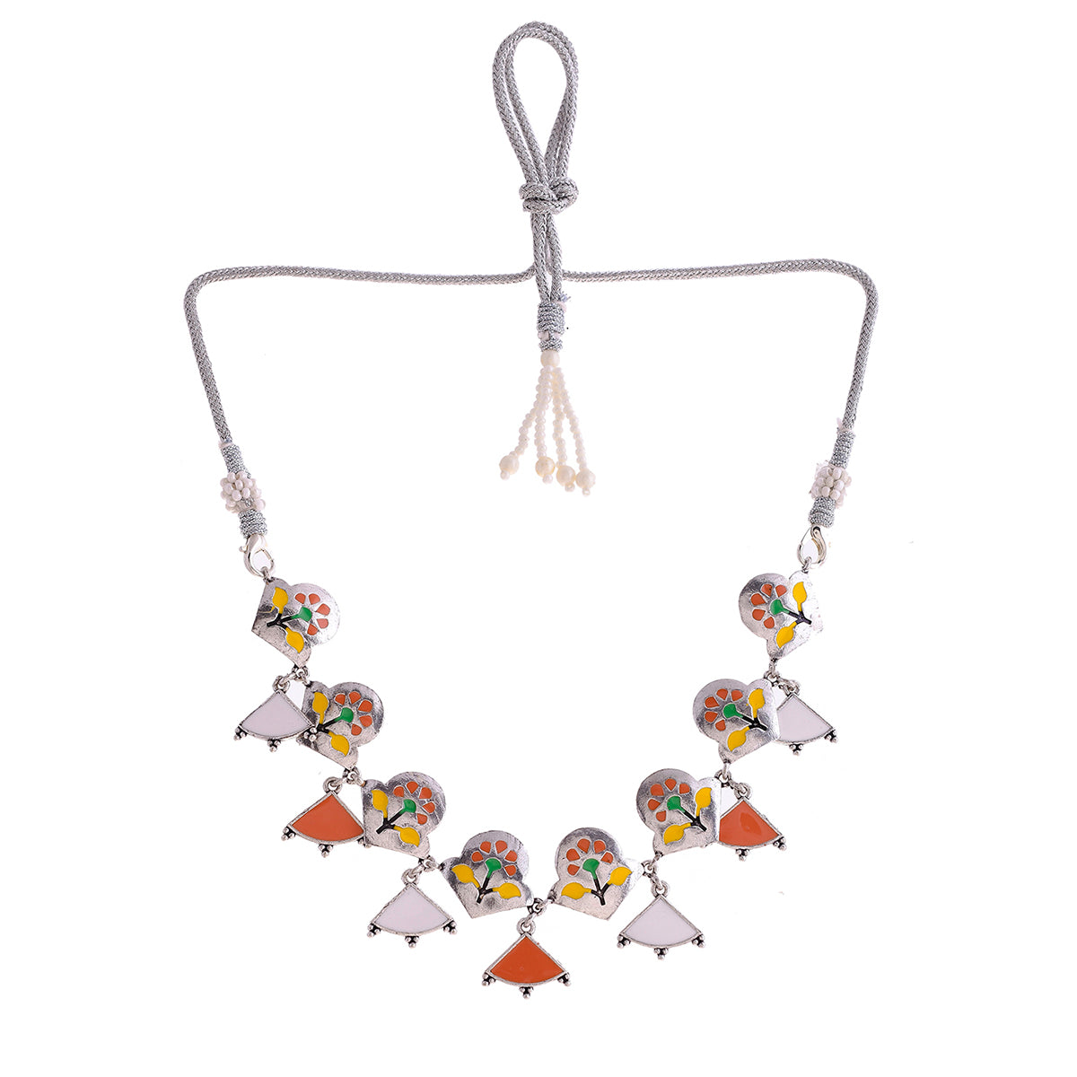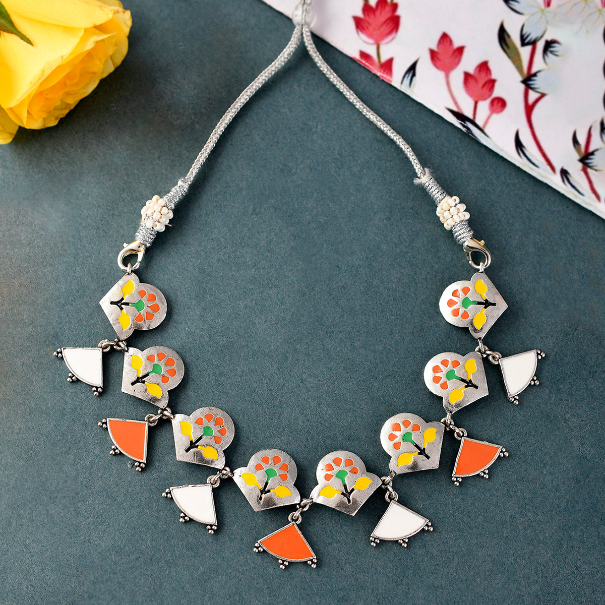 The blooming flower motifs necklace is fashioned after Sanganeri block craft. Handmade from nickelfree brass to give you a feathery feel. Be playful by wearing with jeans and black t-shirt.Weight (Gms): 27.1Size (LxW)(Inch): 25*1.65Material: BrassPlating: Silver PlatingColor: SilverSales Package: 1...