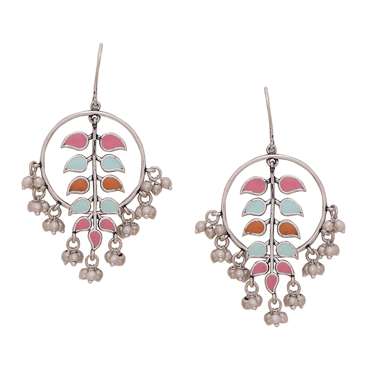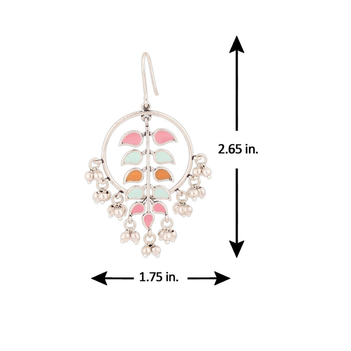 The Rangoli style colorful earrings are inspired by the Sangari block printing. It's summer fresh hand enamelled colours makes this earirng a must have this season.Weight (Gms): 10Size (LxW)(Inch): 1.65*1.25Material: BrassPlating: Silver PlatingColor: SilverSales Package: 2 EarringsProduct Code: 8907617929088