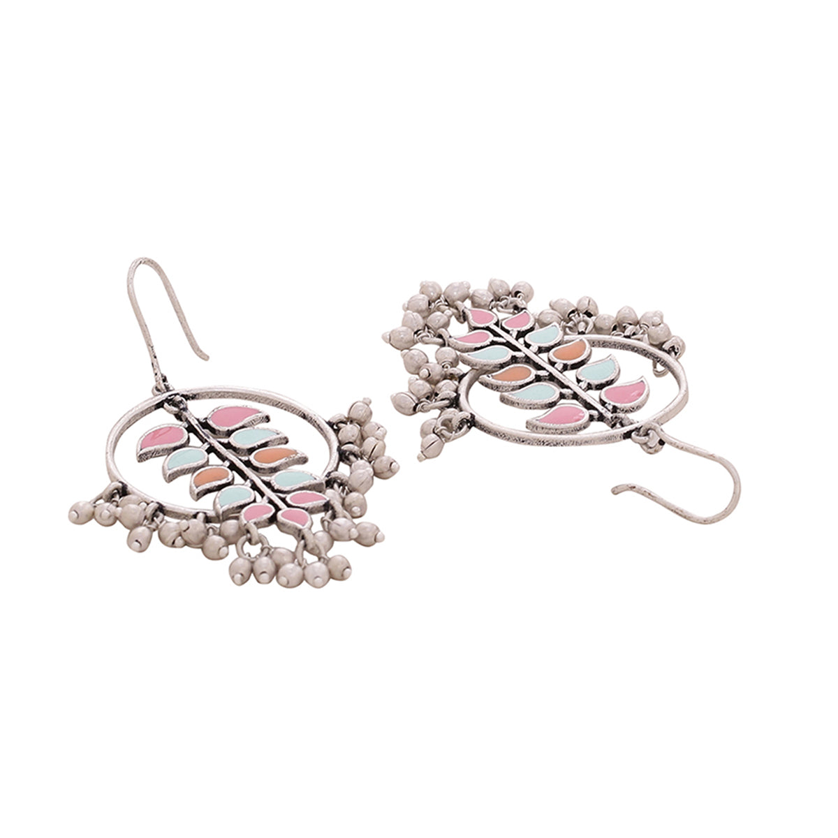 Coloured beads adorned brass earrings inspired by block printing patterns. Silver plated and good for everyday wear.Weight (Gms): 18Size (LxW)(Inch): 2.75*2Material: BrassPlating: Silver PlatingColor: SilverSales Package: 2 EarringsProduct Code: 8907617929453