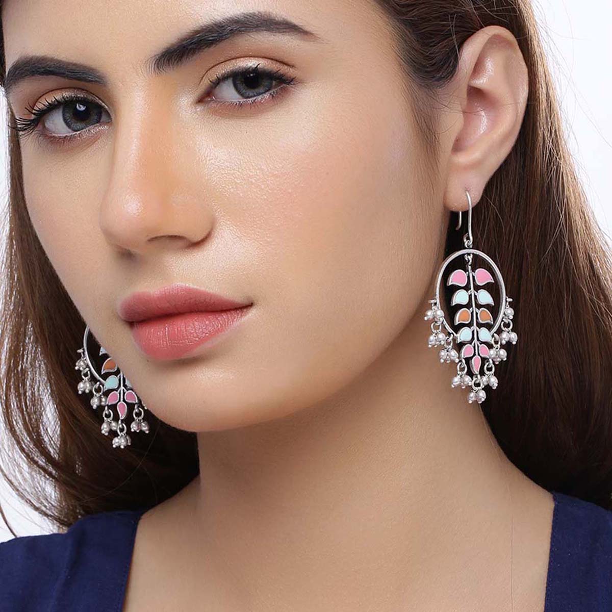 Colourful enamel embellished drop earrings inspired by Jaipur's block printing. Made from brass and silver plated. Good for casual and formal ethnic looks.Weight (Gms): 19.55Size (LxW)(Inch): 3*1.35Material: BrassPlating: Silver PlatingColor: SilverSales Package: 2 EarringsProduct Code: 8907617929446