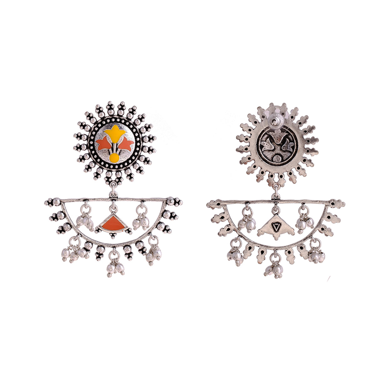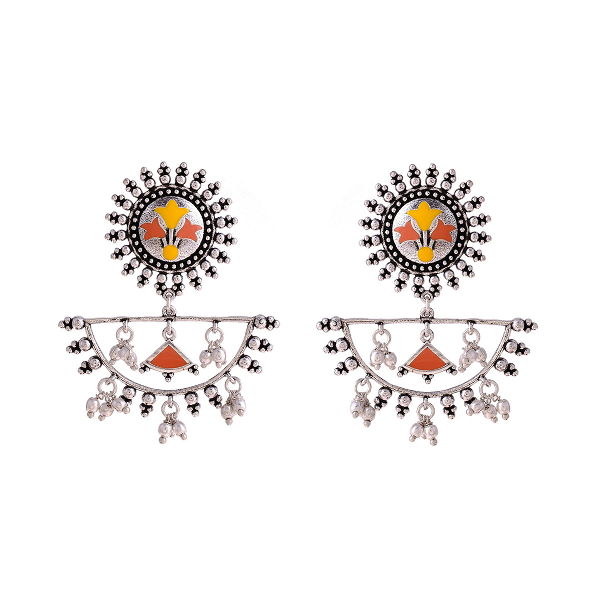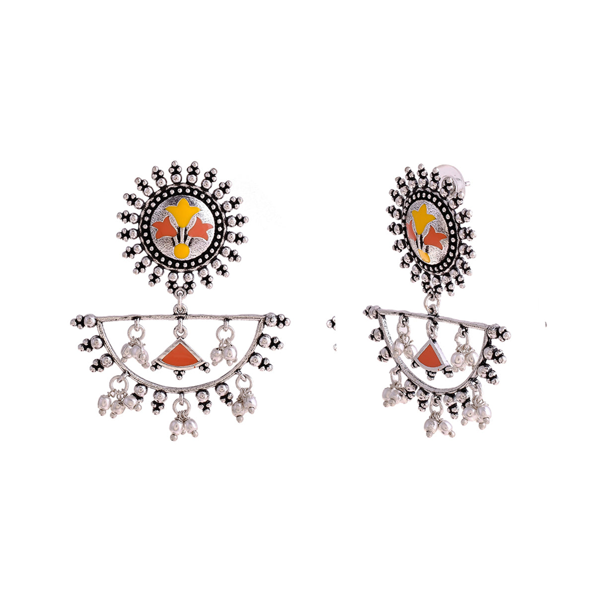 Dreamy Enamel earrings inspired by Jaipur's block printing art. Hand crafted from nickel free brass and given silver plating. Good for ethnic looks.Weight (Gms): 11.6Size (LxW)(Inch): 1.85*1.35Material: BrassPlating: Silver PlatingColor: SilverSales Package: 2 EarringsProduct Code: 8907617929064