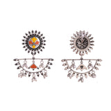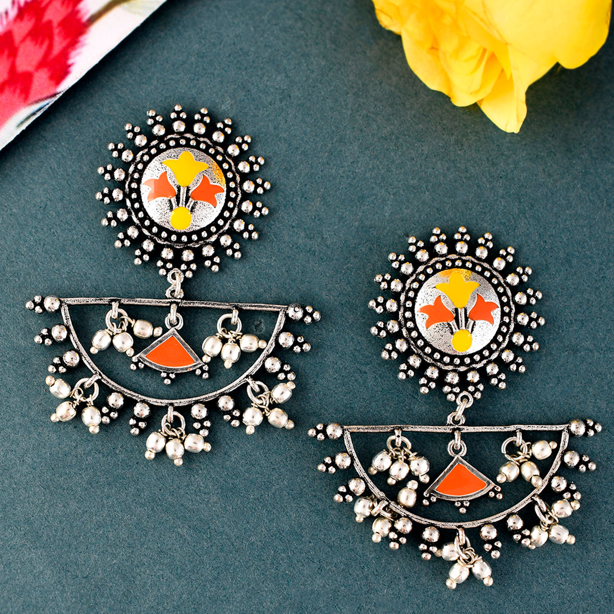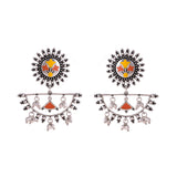 Coloured beads adorned brass earrings inspired by block printing patterns. Silver plated and good for everyday wear.Weight (Gms): 18Size (LxW)(Inch): 2.75*2Material: BrassPlating: Silver PlatingColor: SilverSales Package: 2 EarringsProduct Code: 8907617929453