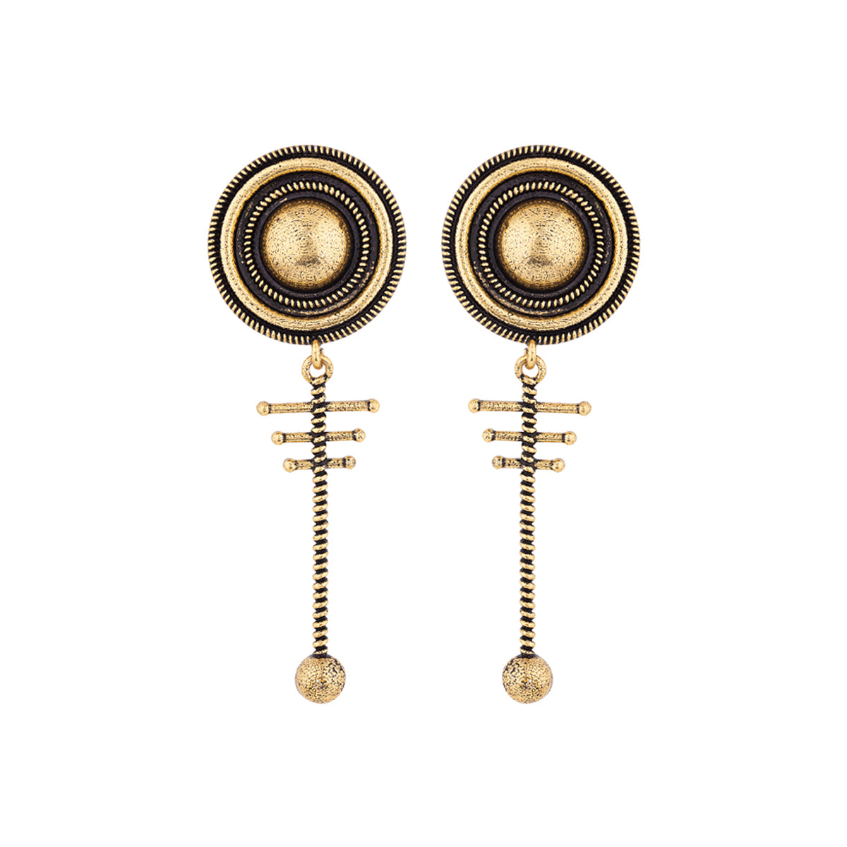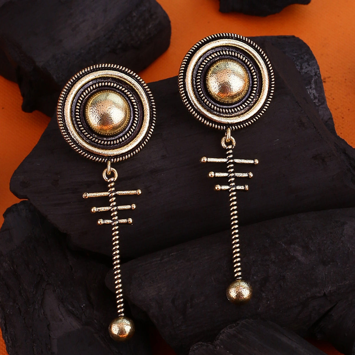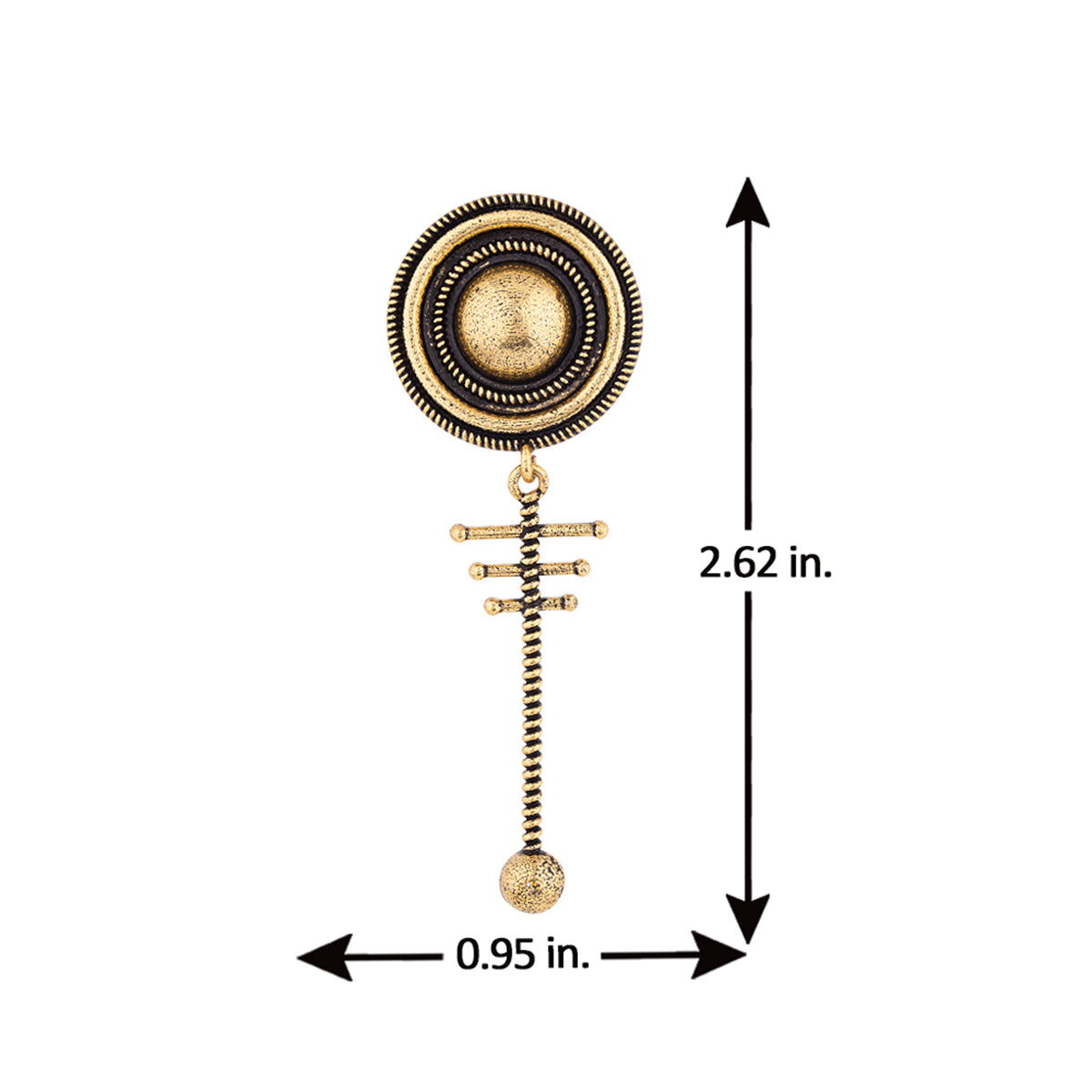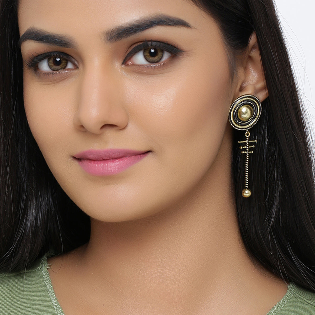 Oxidised gold plated circular drop earrings. Made from brass. Good for casual wear. This piece of jewelry comes with the Voylla assurance of quality and durability. Caring for your fashion jewelry: We, at Voylla, take care of every piece of jewelry so that you don't spend hours caring for them.